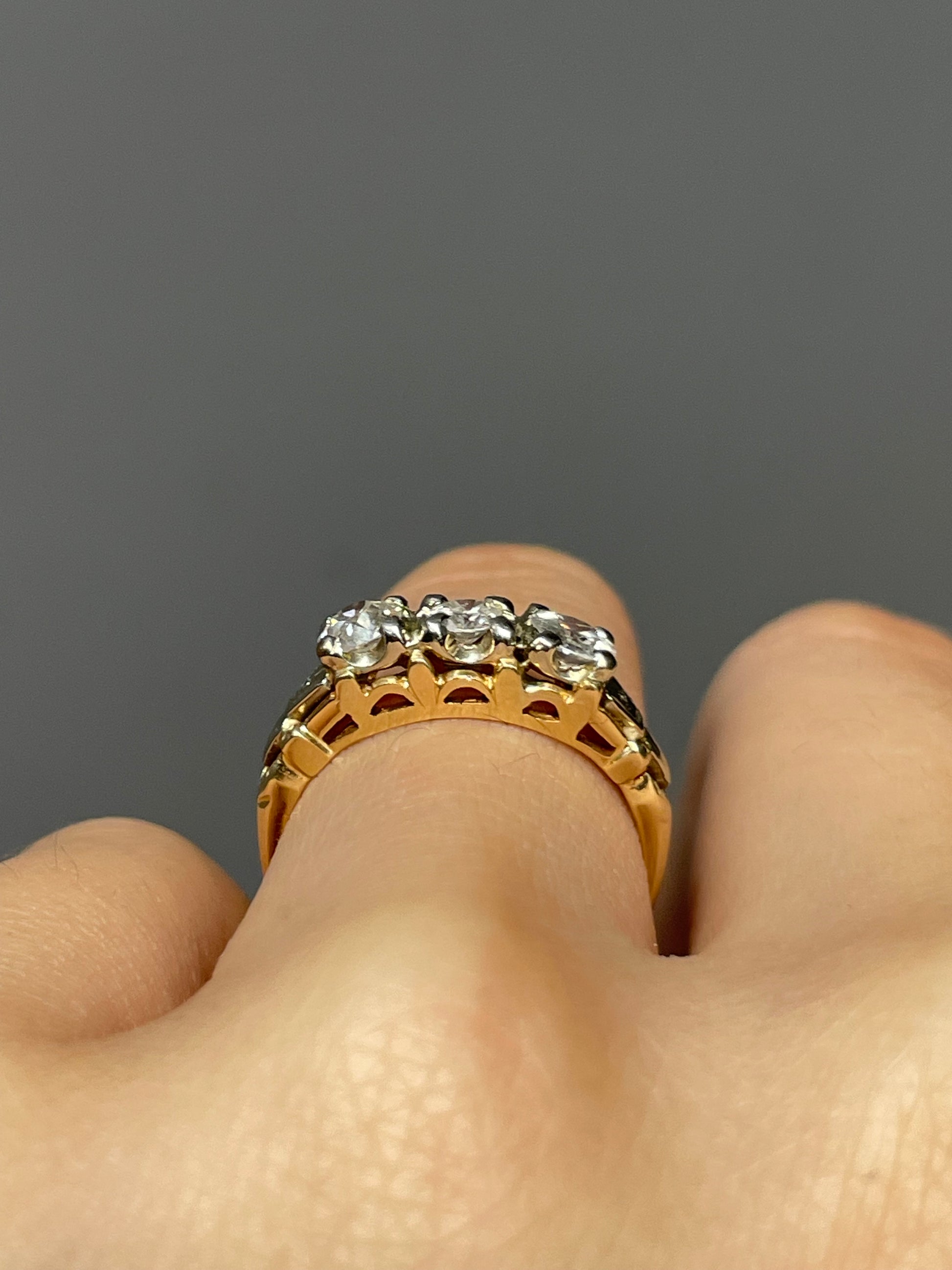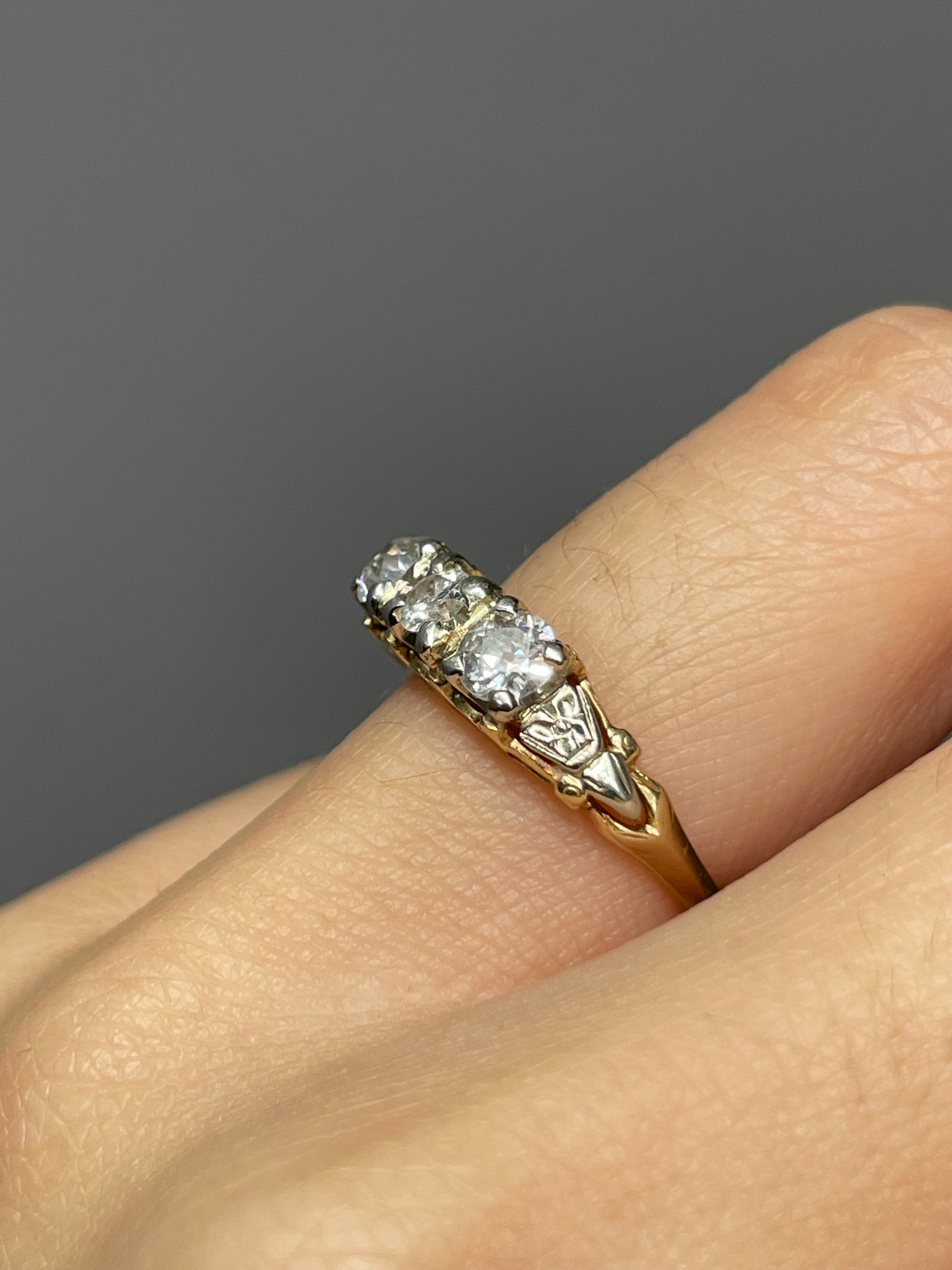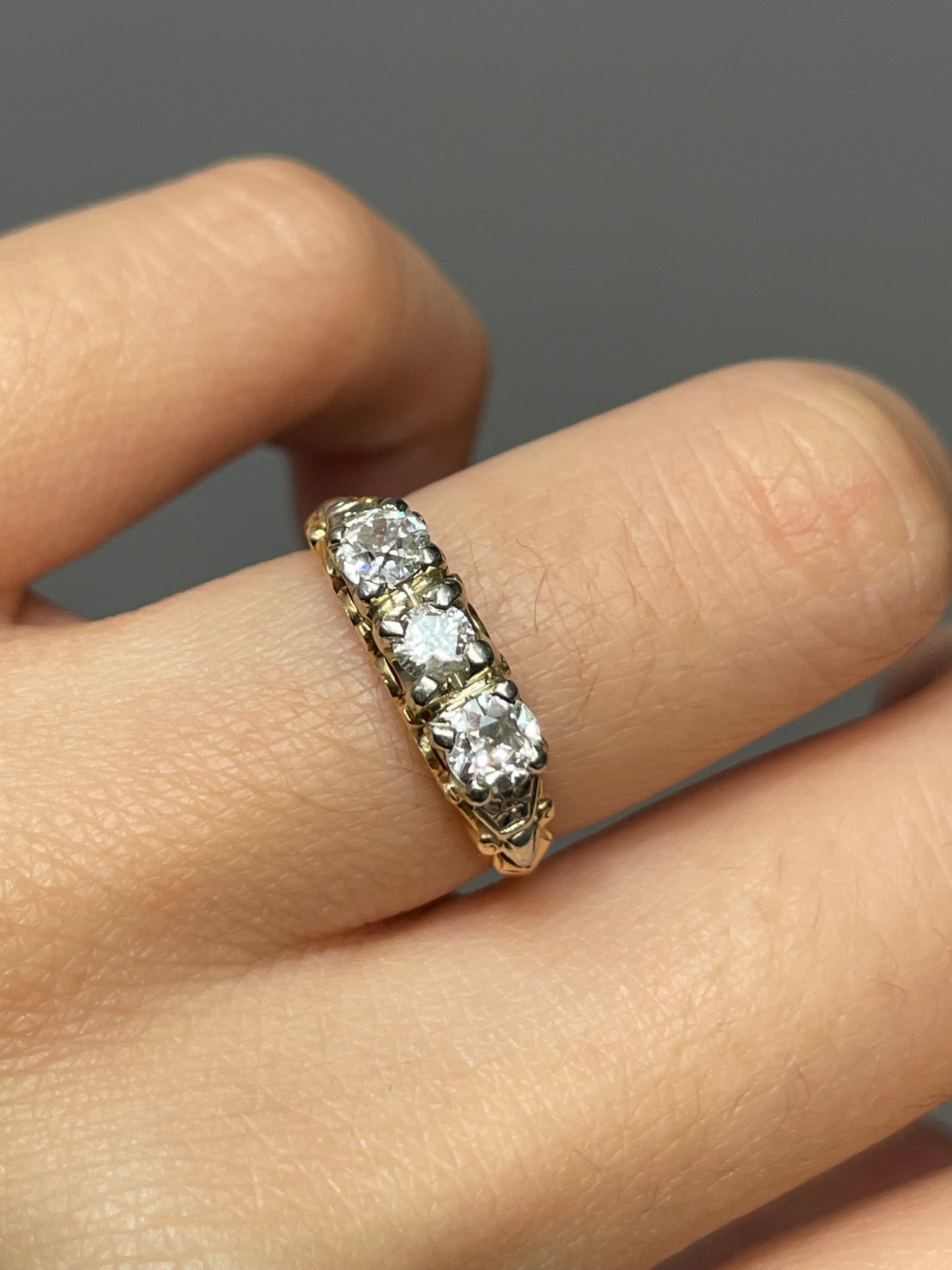 An antique three stone string crafted in 14K yellow and white gold, set with three sparkling white old euro cut diamonds totaling 0.65 carats (SI clarity, H color). Ornated with motif detailing along the shoulders.