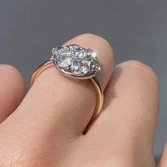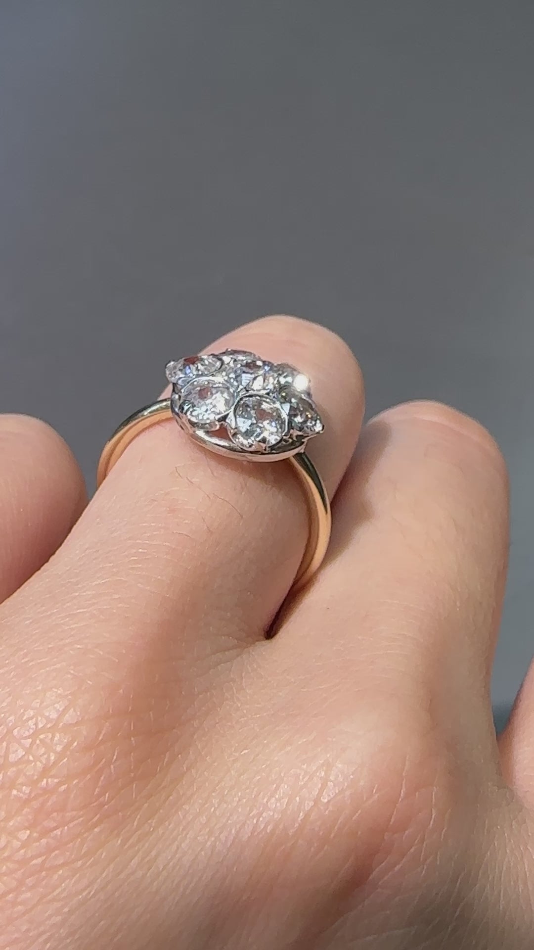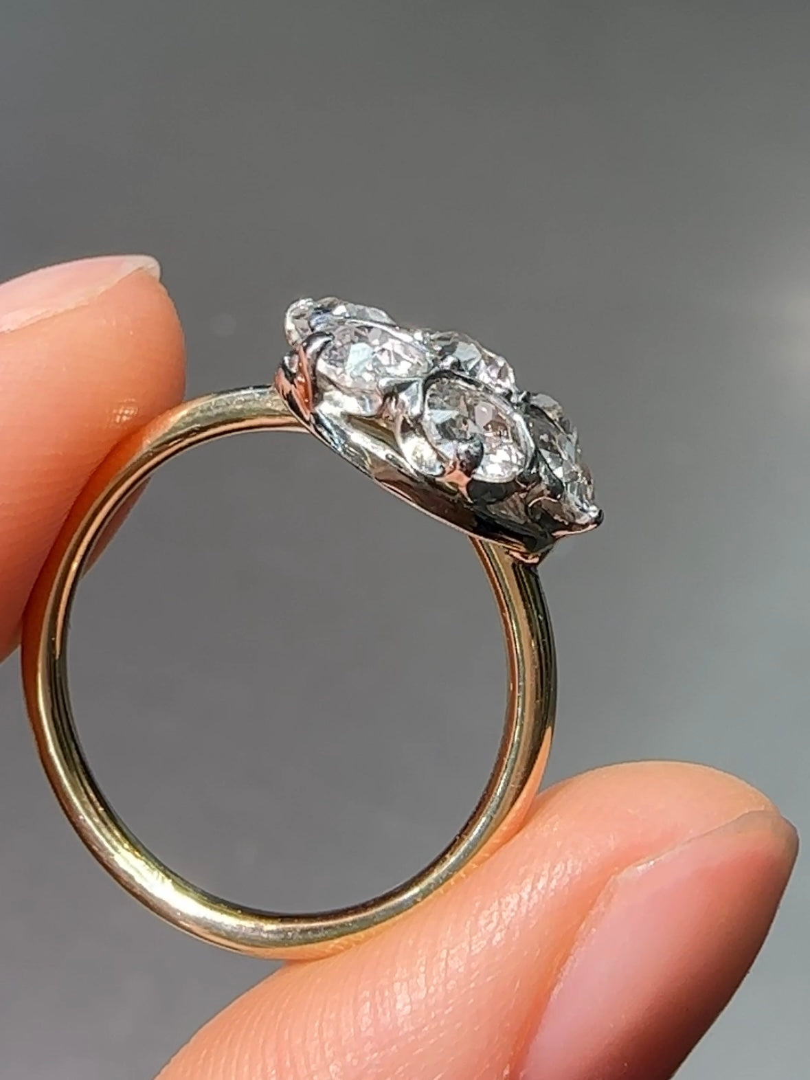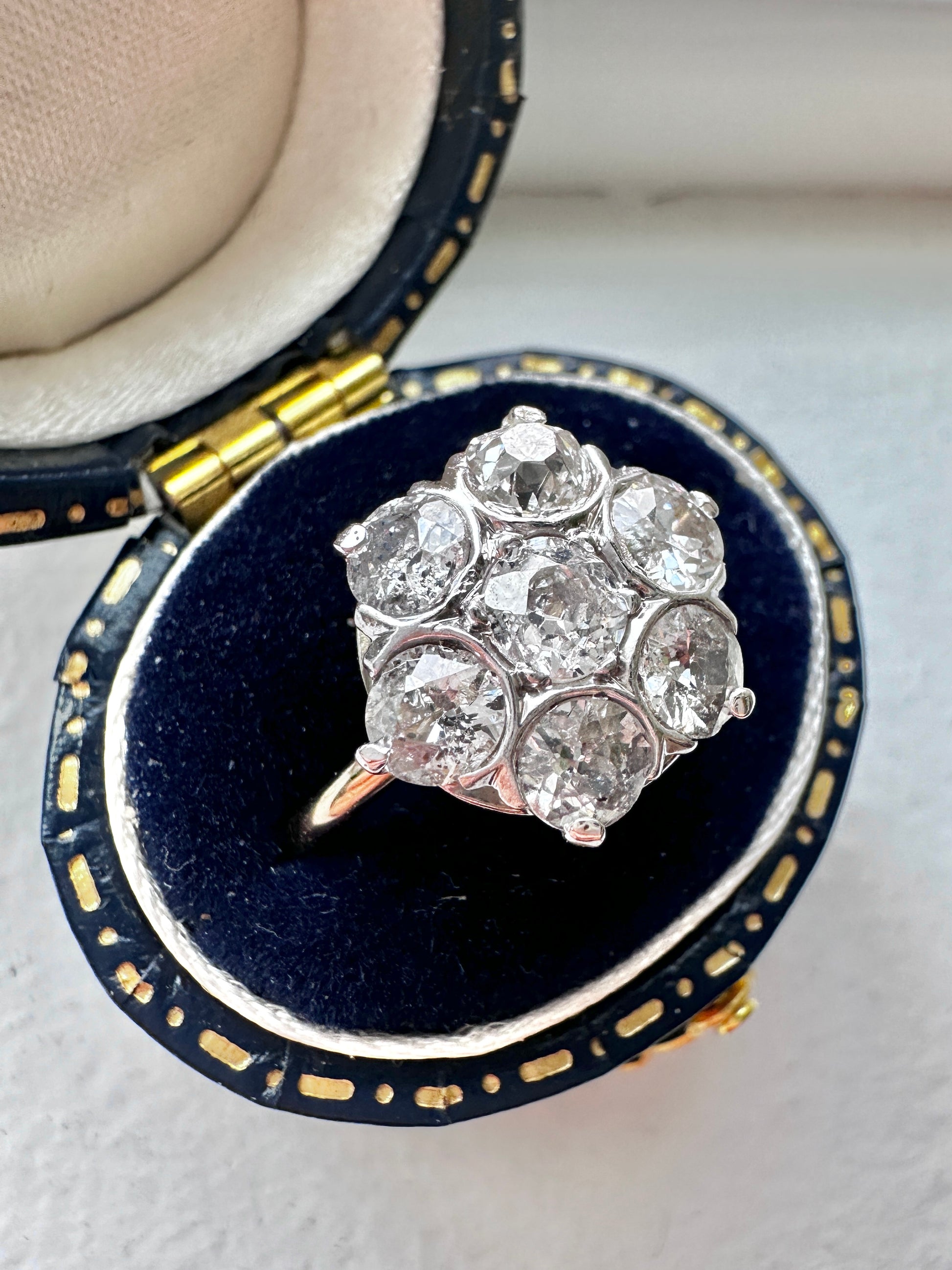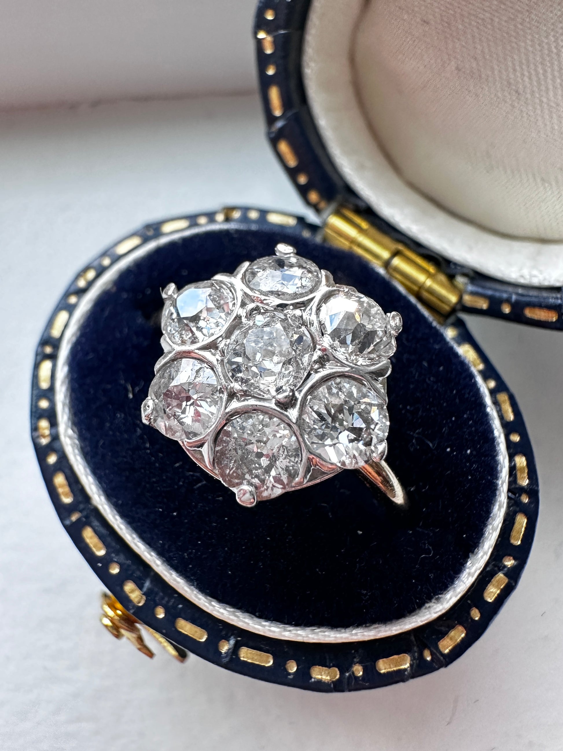 A striking timeless sparkling cluster composed of seven sparkling white old mine-cut diamonds totaling a shy 2.21 carats, each weighing 0.32 carats. Handcrafted in platinum a top a 14K gold resizable band. The perfect addition to any jewelry collection!