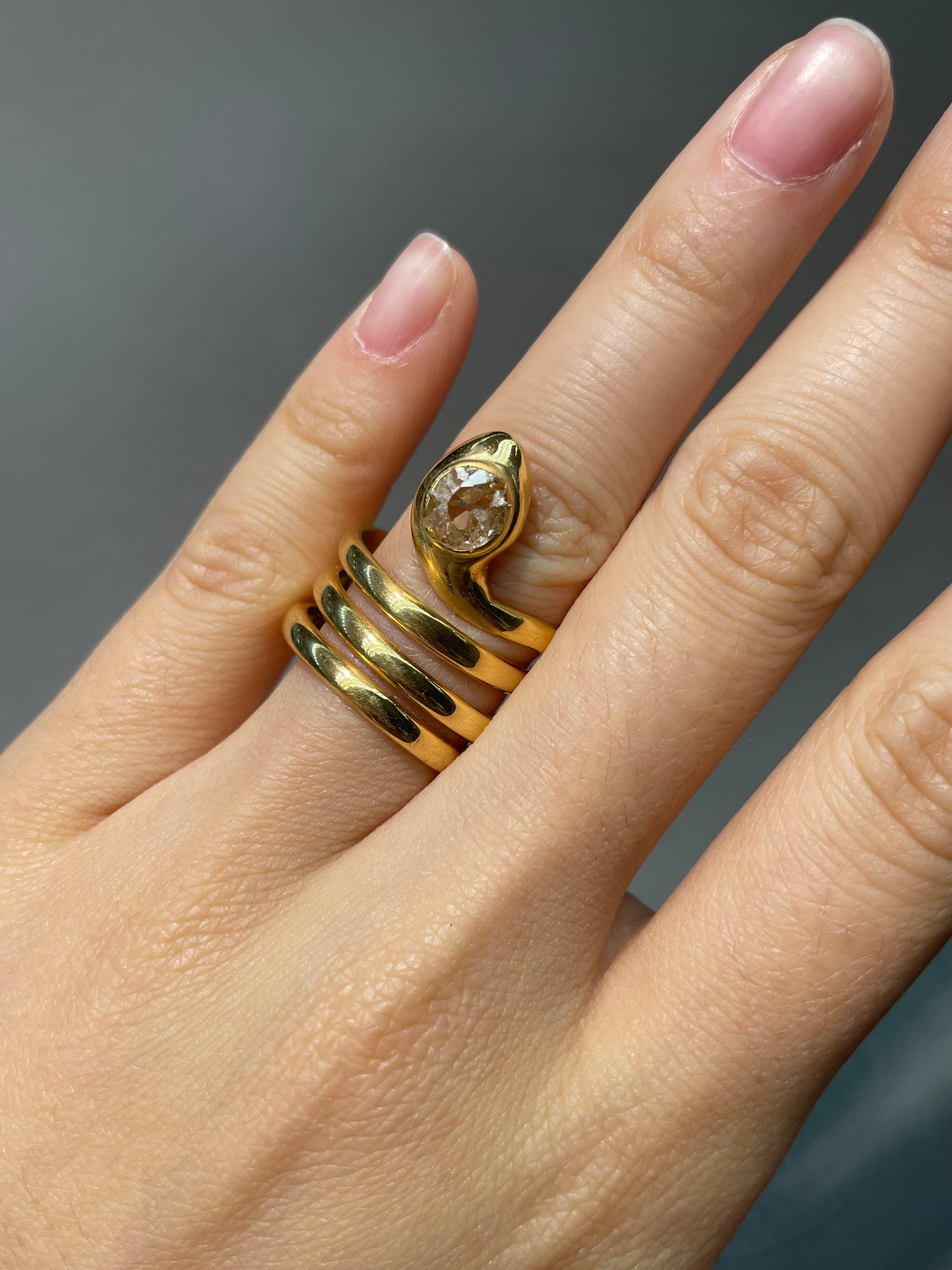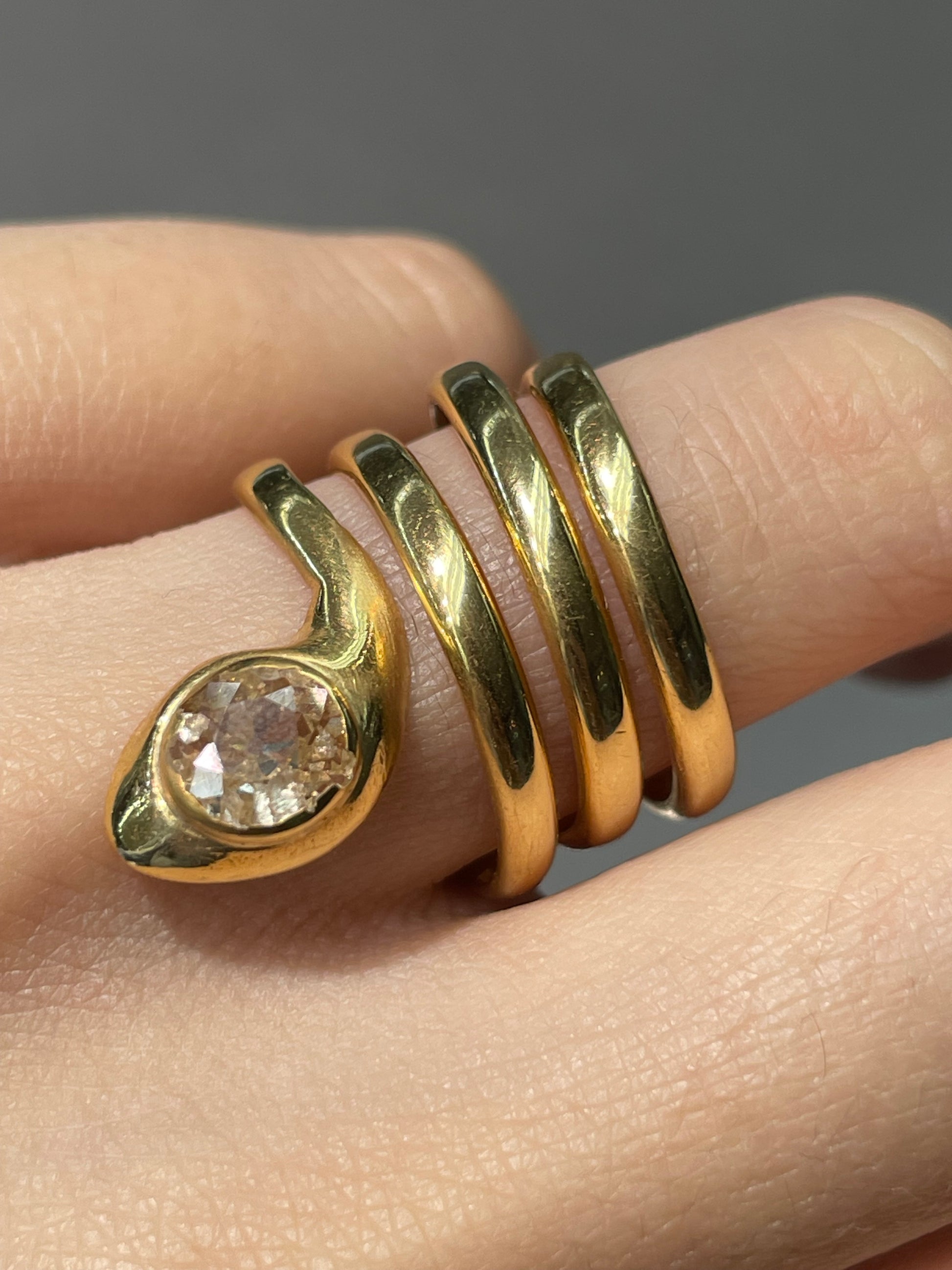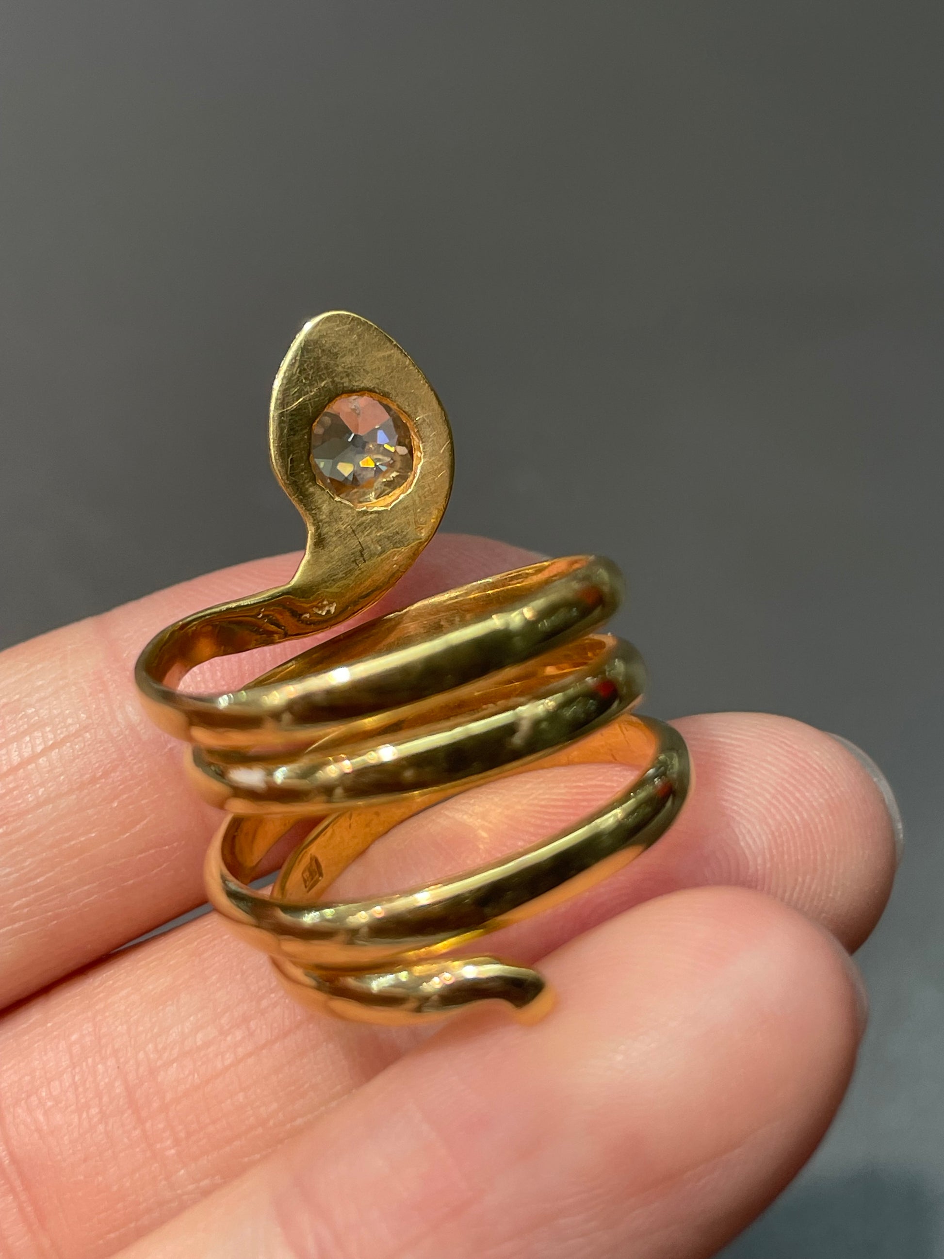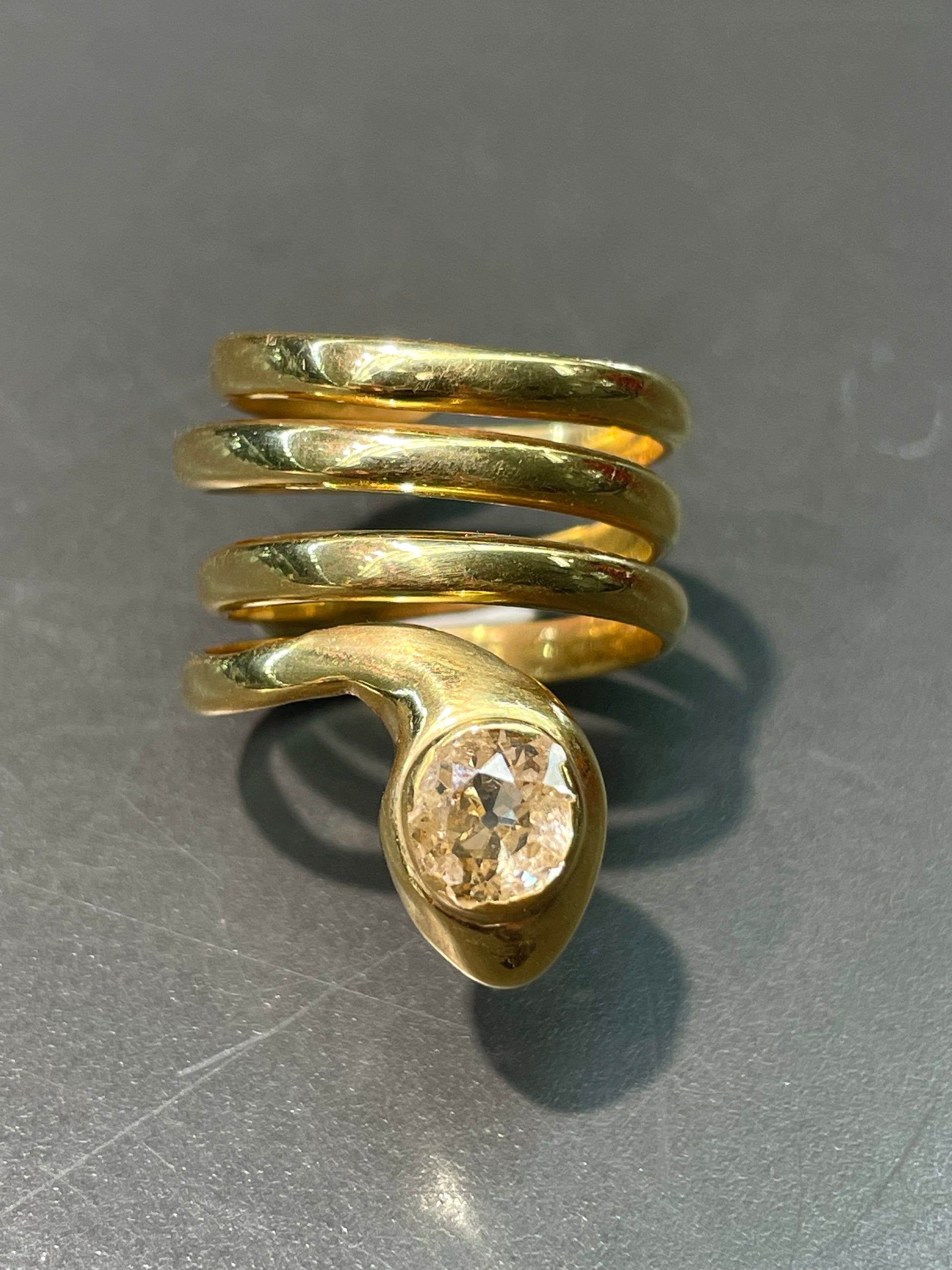 A captivating antique Austro-Hungarian serpent ring, hallmarked and crafted in 14K yellow gold. The snake coils gracefully three and a half times around the finger. At its head rests a sparkling, chunky old mine-cut diamond totaling 1.08 carats (I clarity, L-M color).