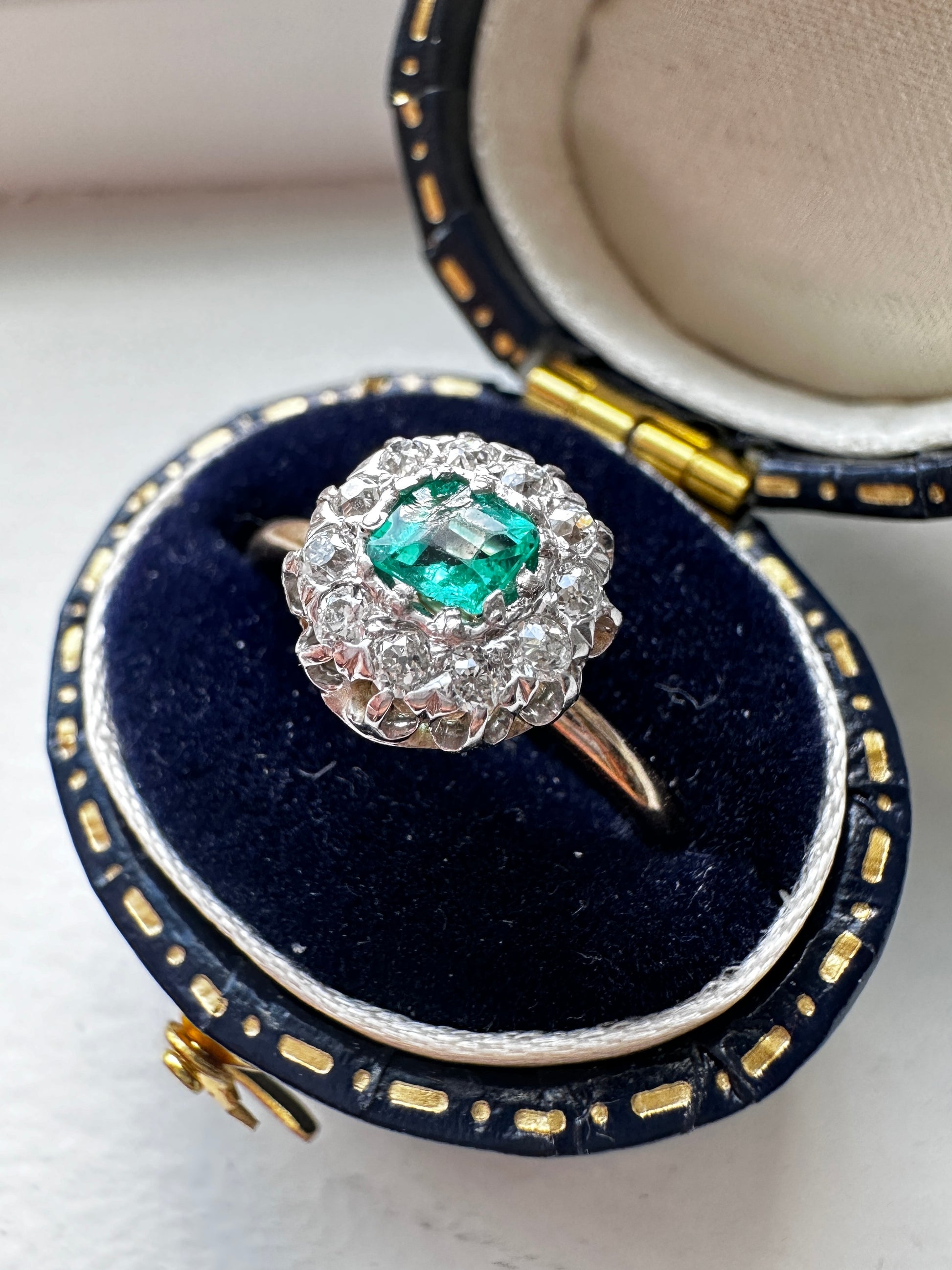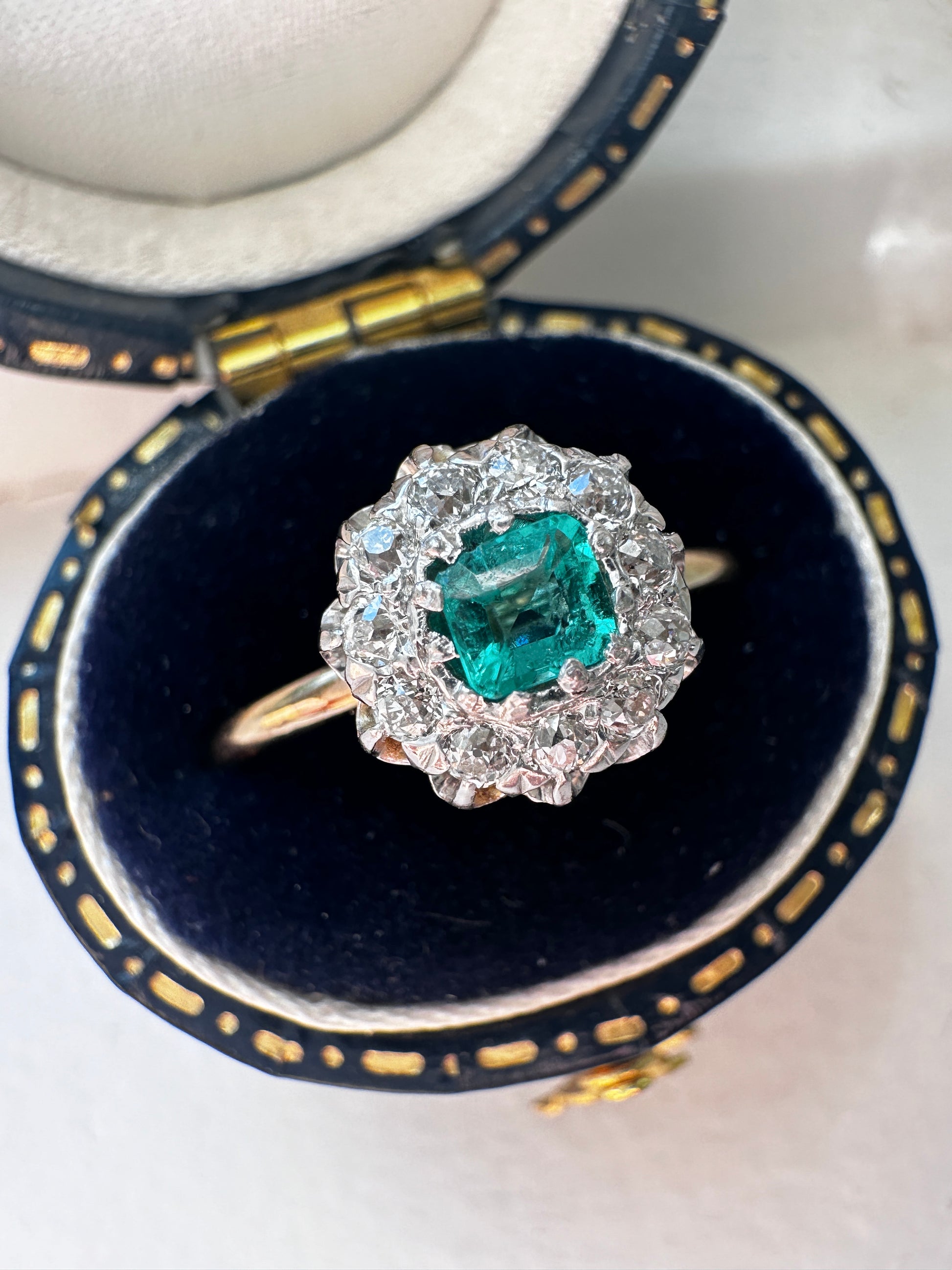 A splendid antique halo ring featuring a glowing luscious octagonal green Colombian emerald approximately 0.38 carats accented with a halo of glistening white old mine cut diamonds totaling 0.44 carats (VS-SI Clarity, G Color) on a sizable 14K yellow gold rounded shank.