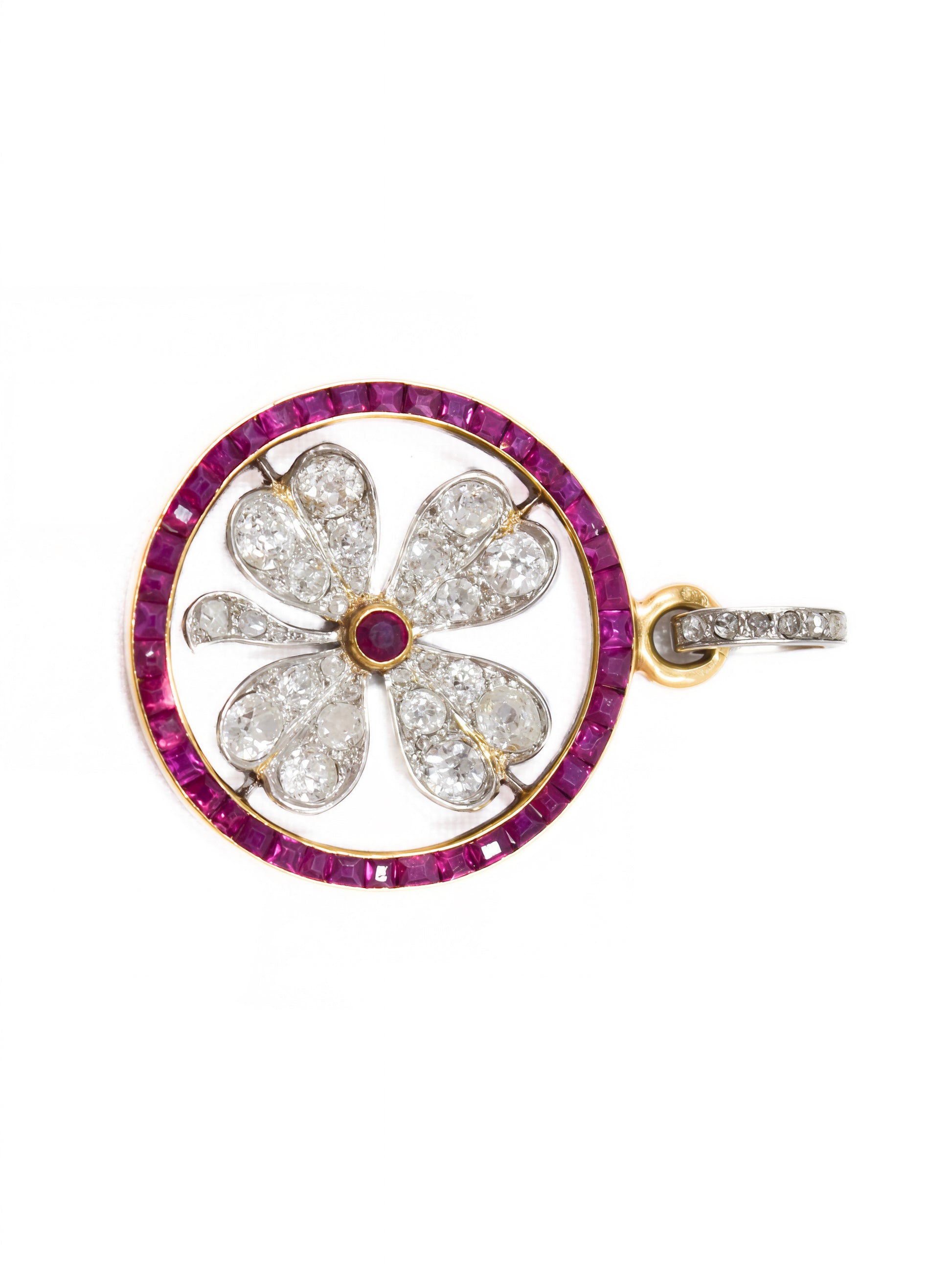 A timeless lucky Art Deco shamrock pendant pave set with old mine cut diamonds, encircled by a halo of vibrant calibre cut rubies.