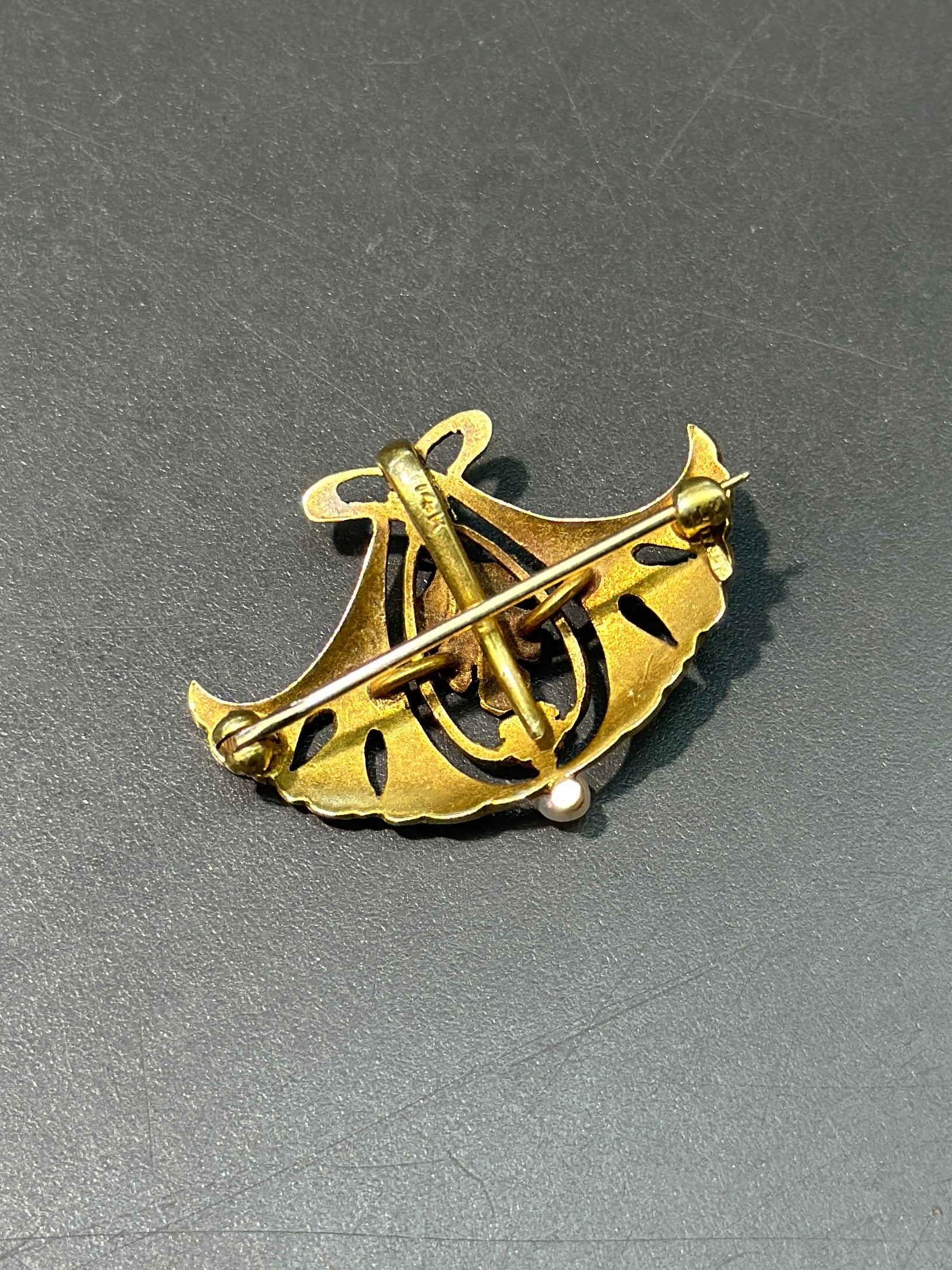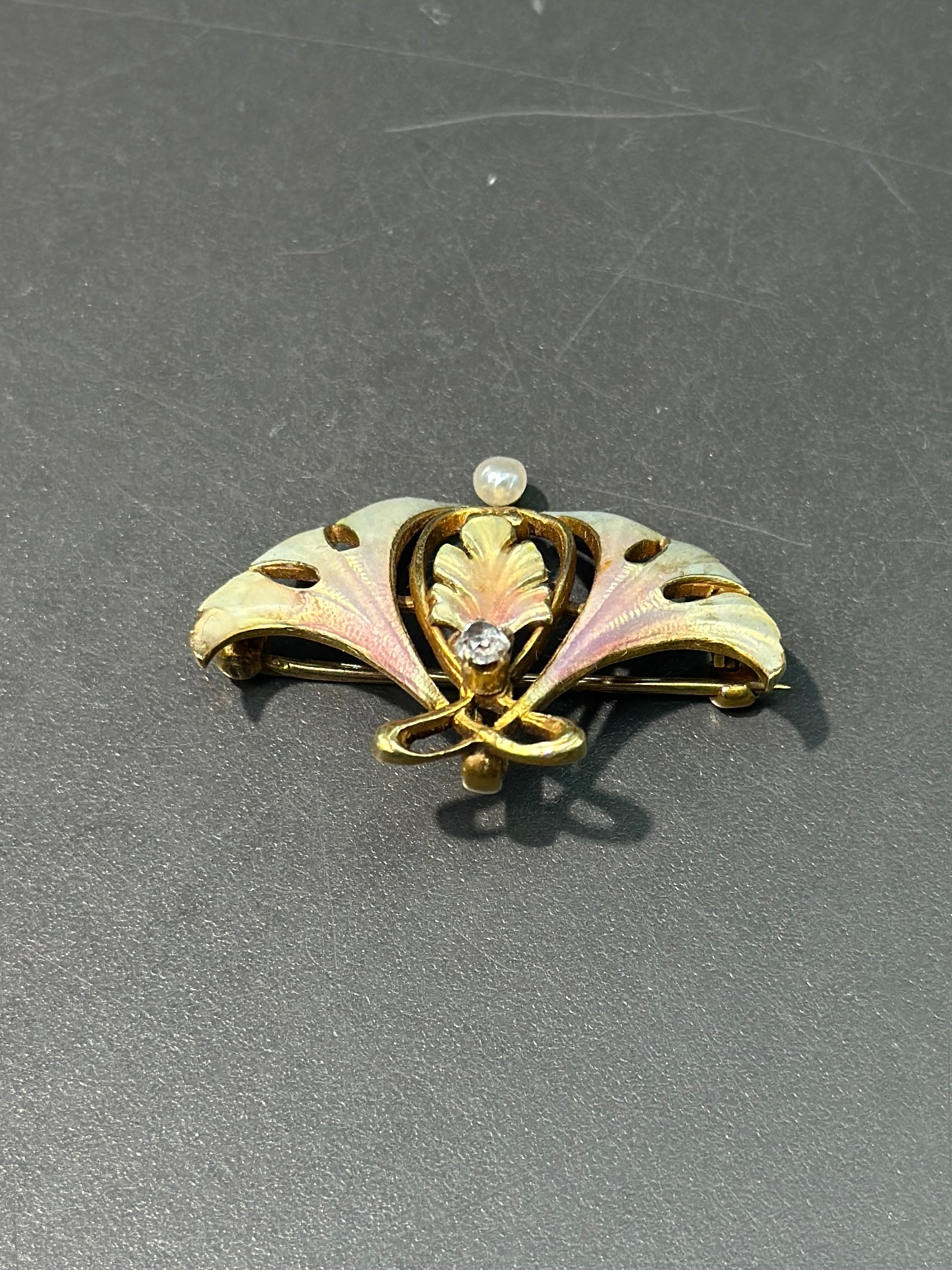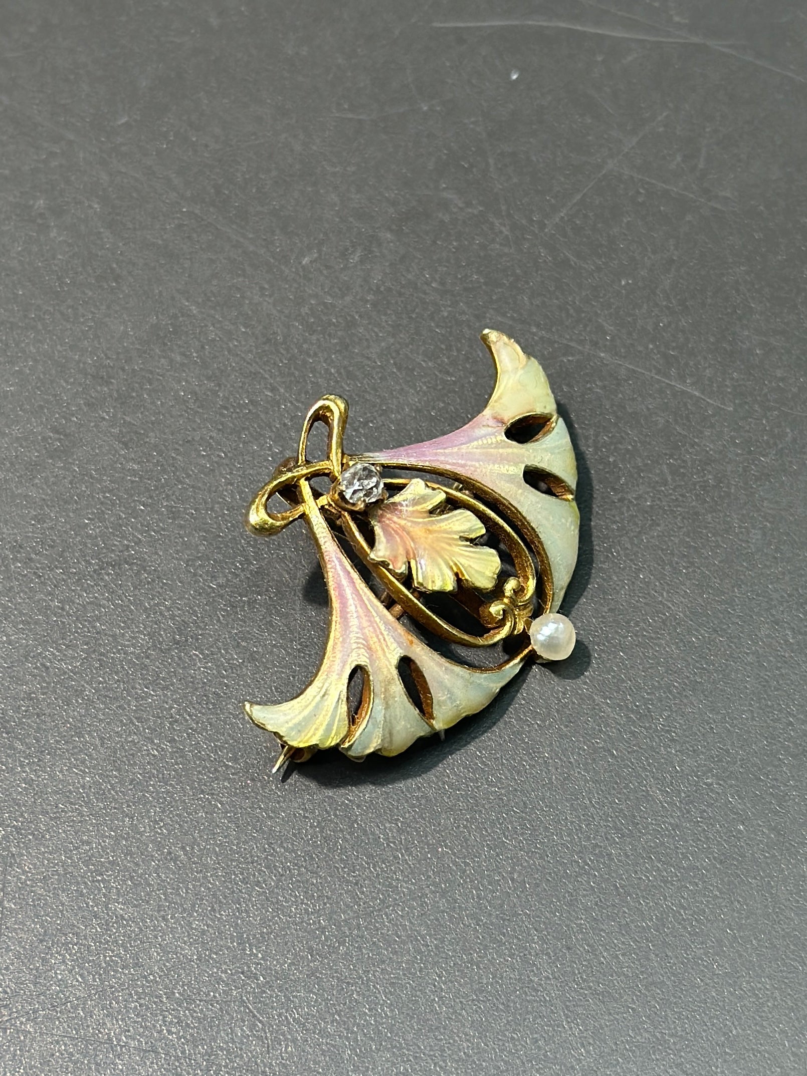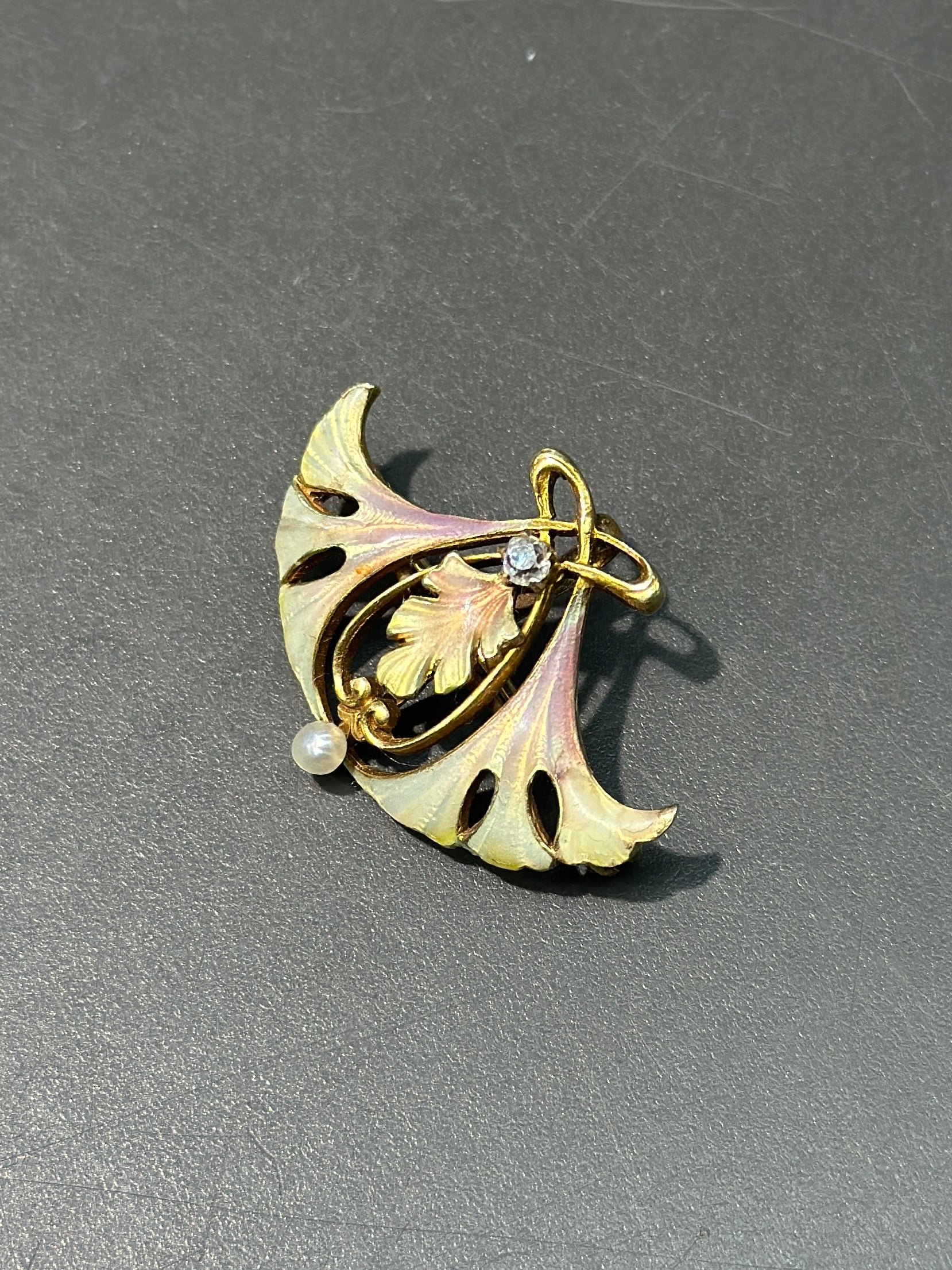 Art Nouveau 14K Gold Ginkgo Leaf Diamond and Pearl Enamel Brooch