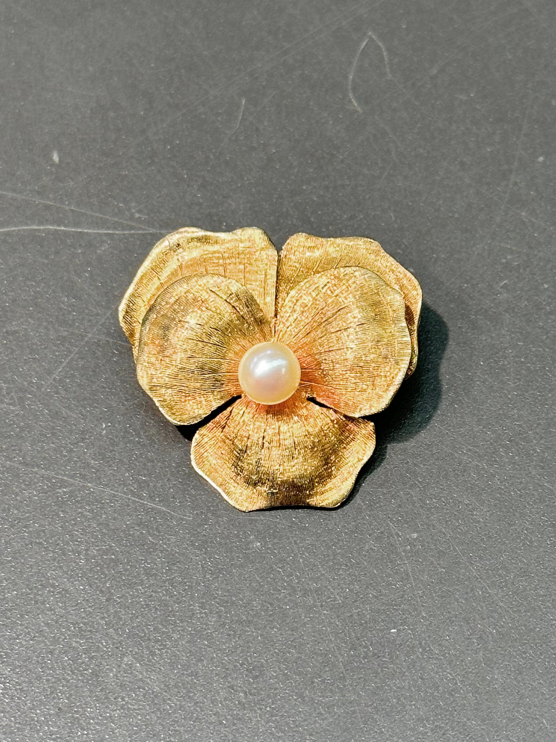 Rendered in a gleaming 14K gold, with a delicate brushed finish. This Art Nouveau style brooch resembles a blooming pansy centered with a lustrous round pearl.