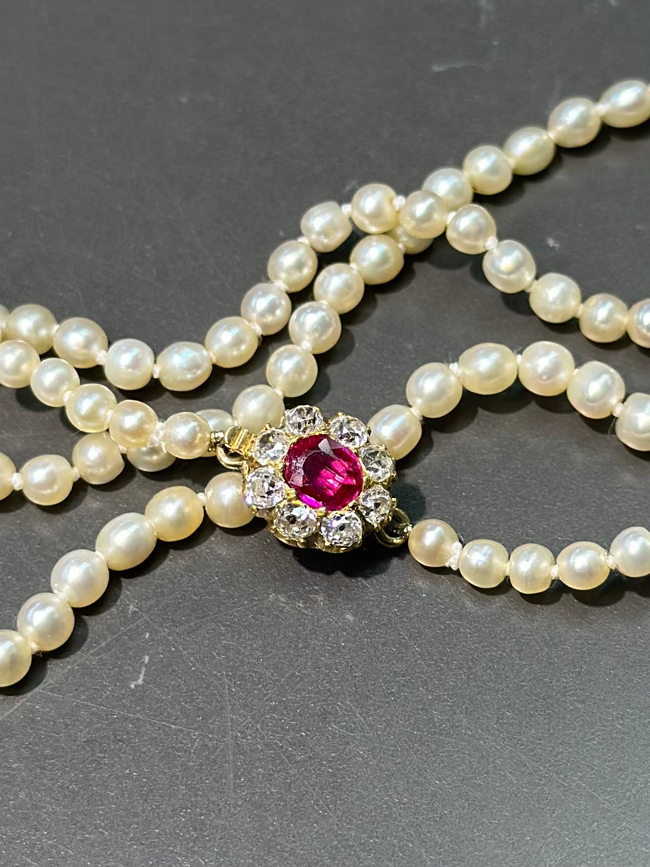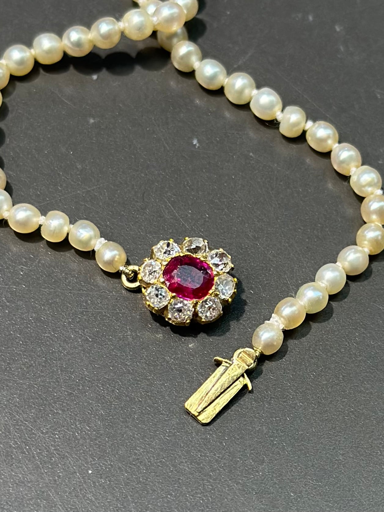 Dates back to the Edwardian era, a magnificent and scarce pearl necklace strung with 107 lustrous creamy-white natural saltwater pearls finished off with a striking clasp embellished with a natural vibrant Burma ruby with a halo of sparkling white old mine cut diamonds totaling 1.0 carat. Accompanied with individual GLA certificate for pearl and ruby.
