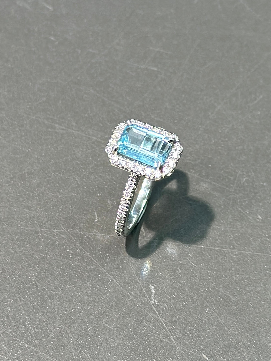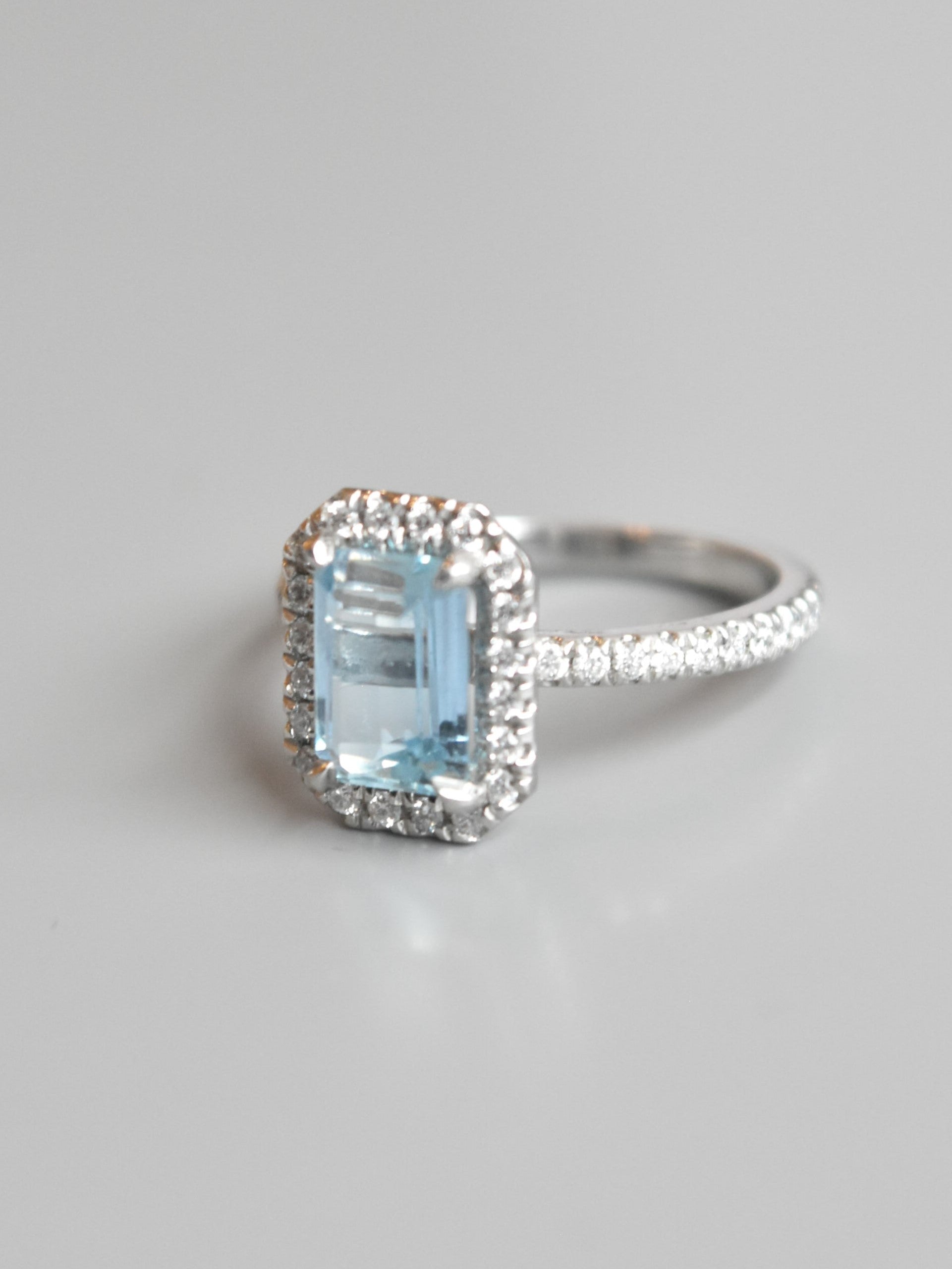 A sparkling and serene emerald cut aquamarine featuring a glorious sky-blue stunningly highlighted by twinkling icy white brilliant cut diamonds. Currently measures a size 6.