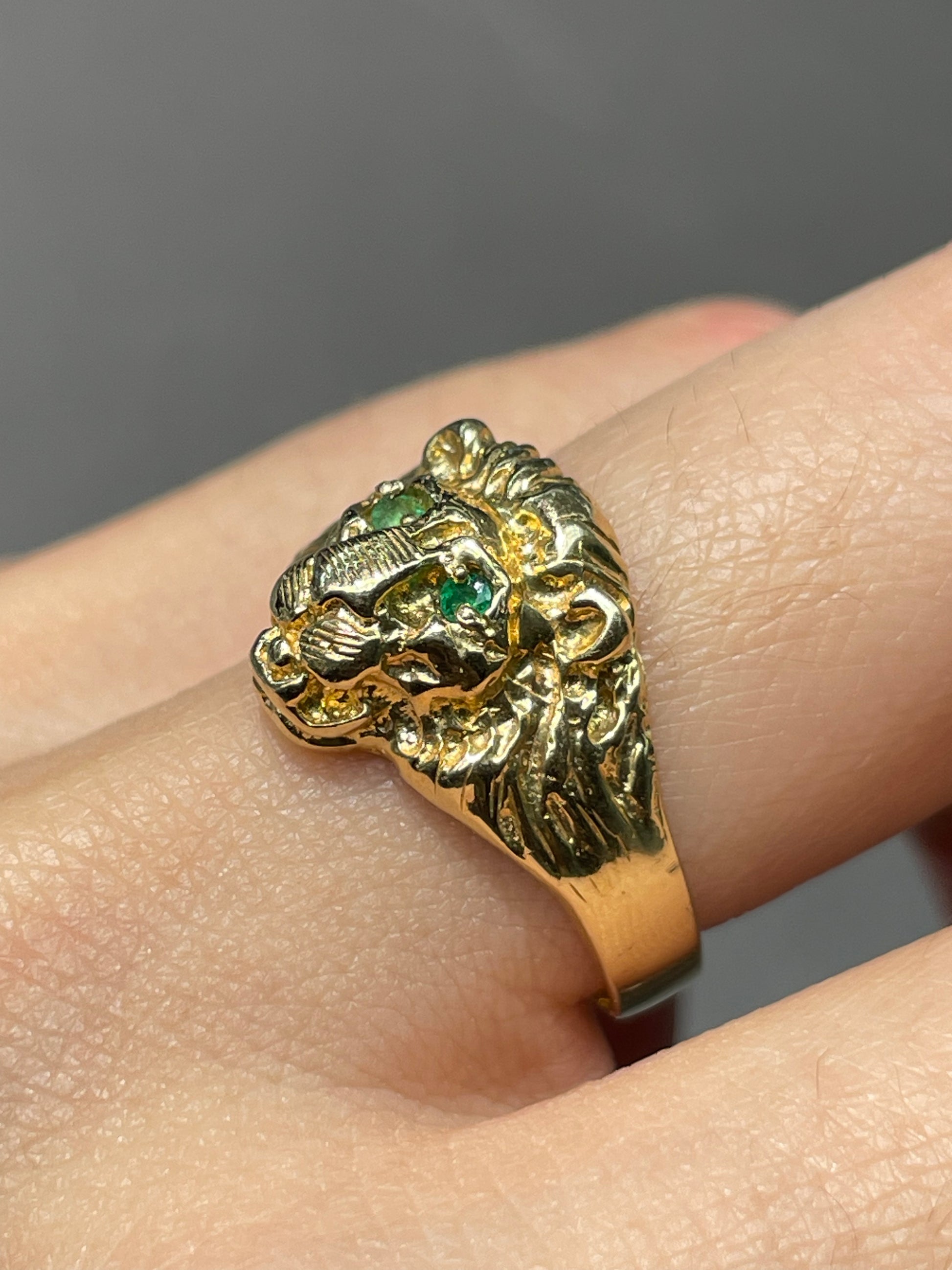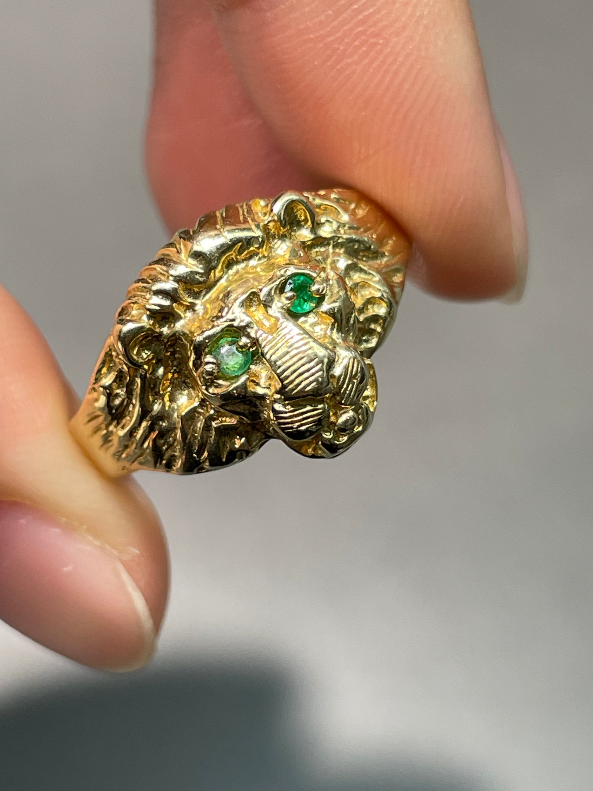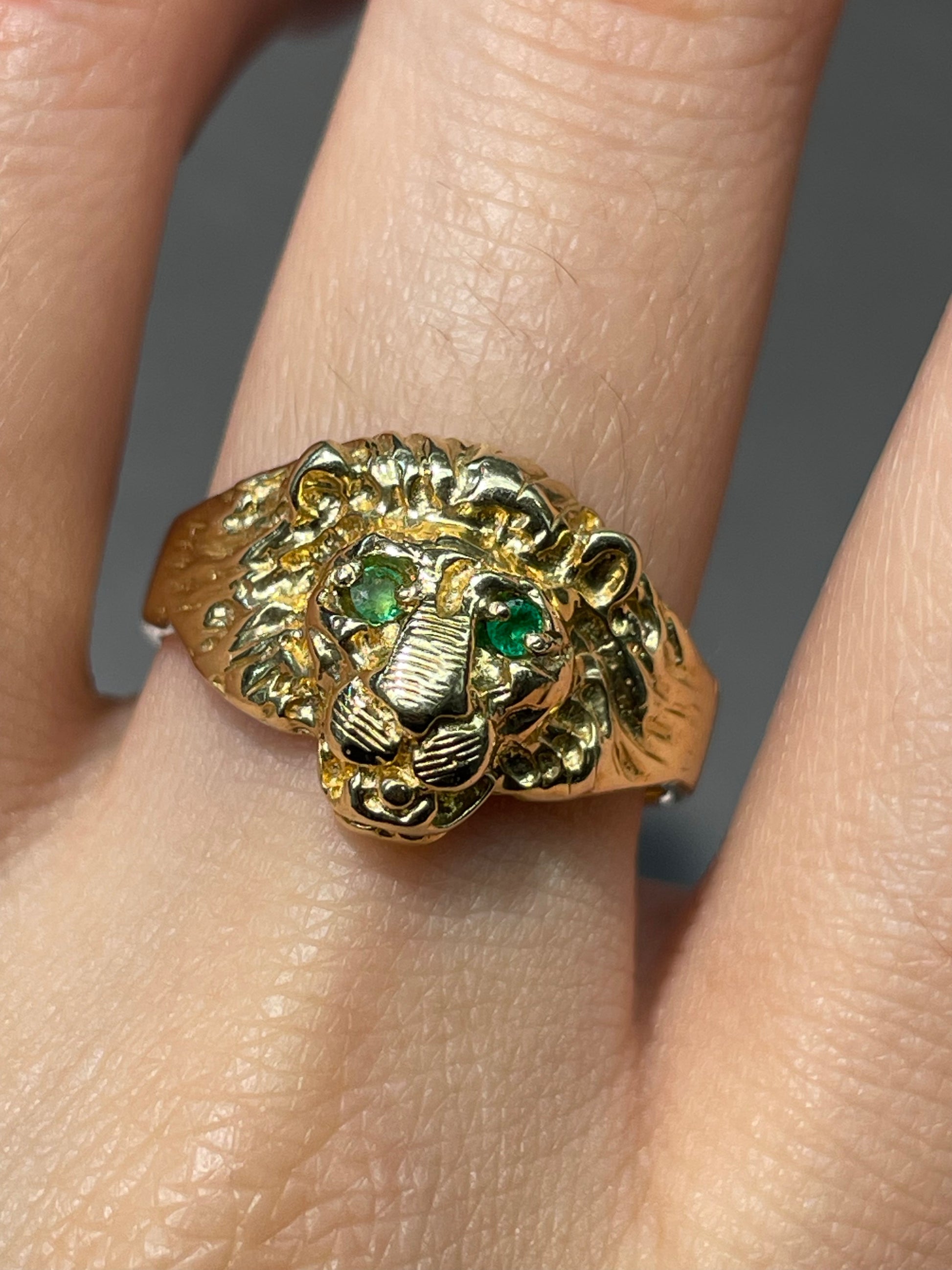 A vintage 14K yellow gold lion ring with natural emerald set eyes.