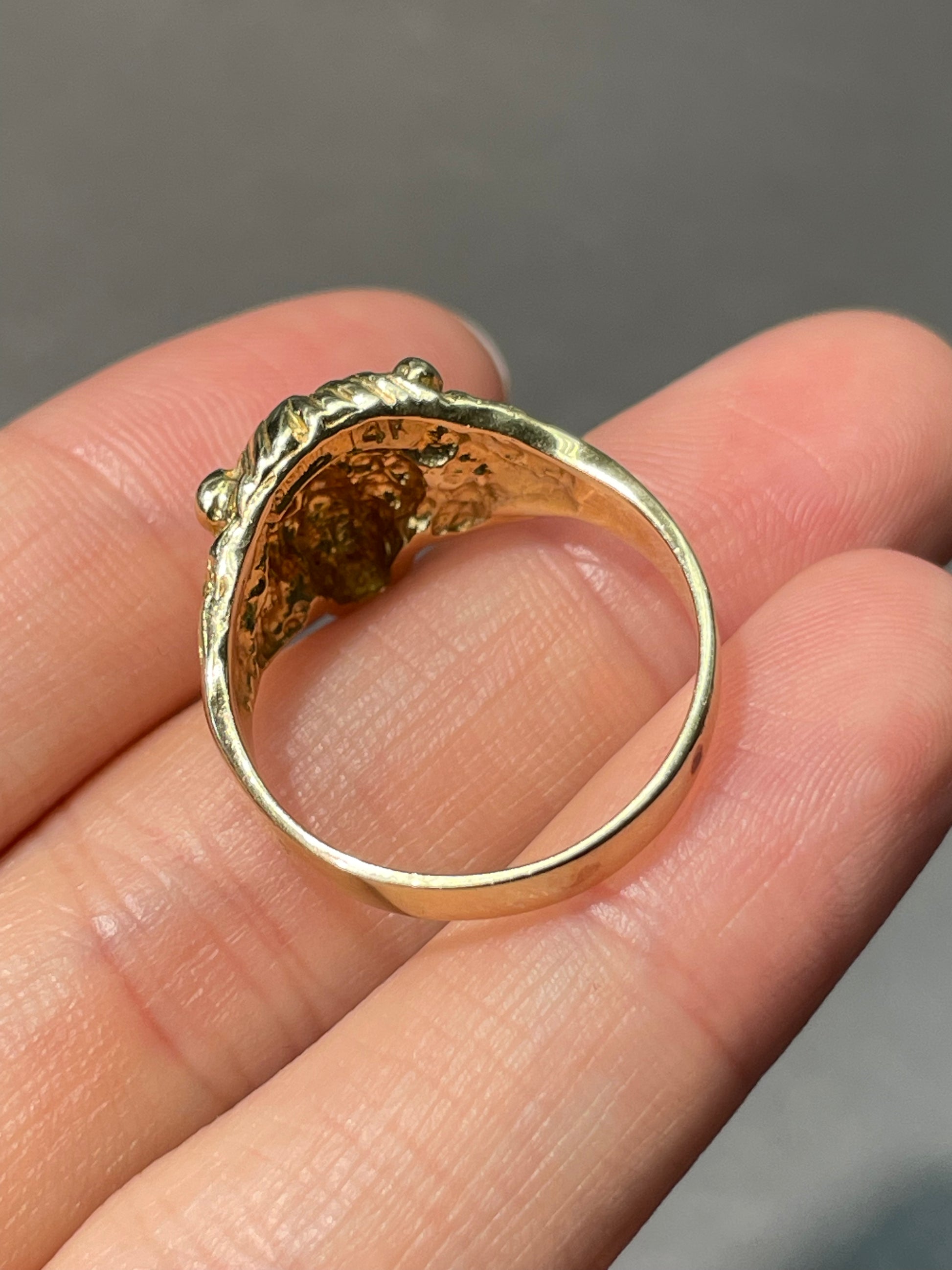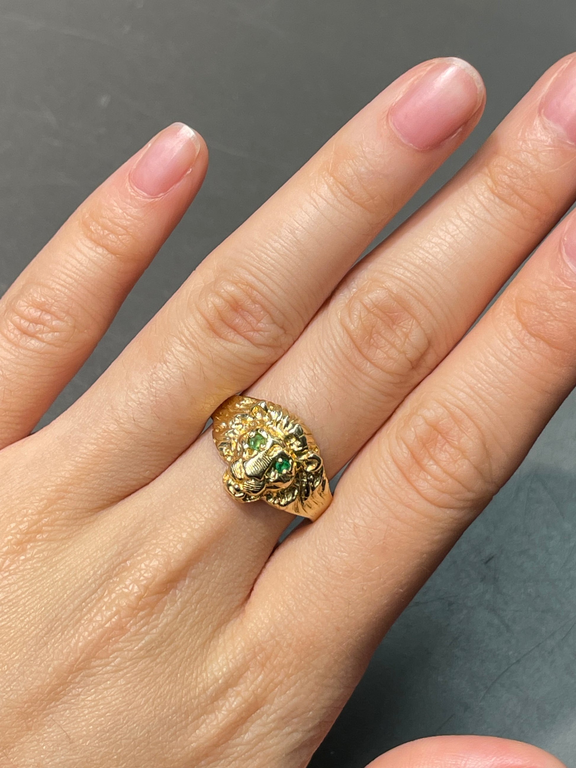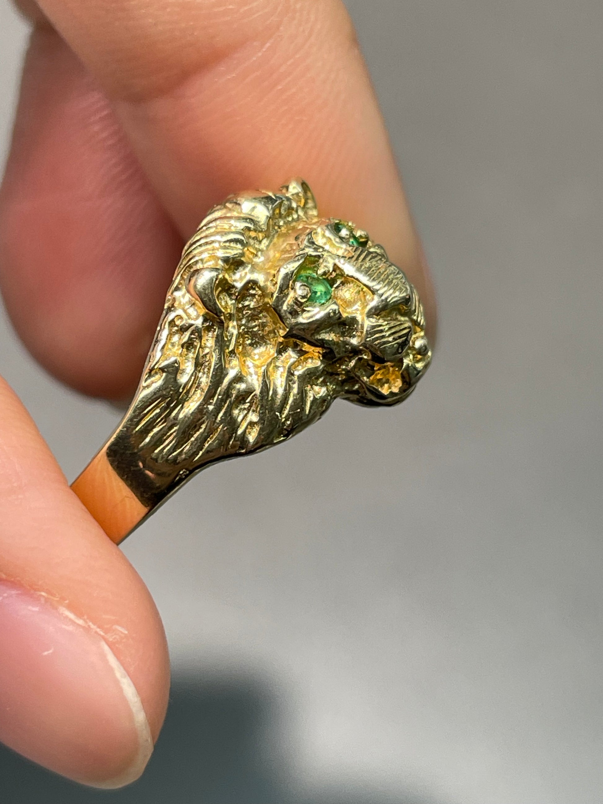 A vintage 14K yellow gold lion ring with natural emerald set eyes.