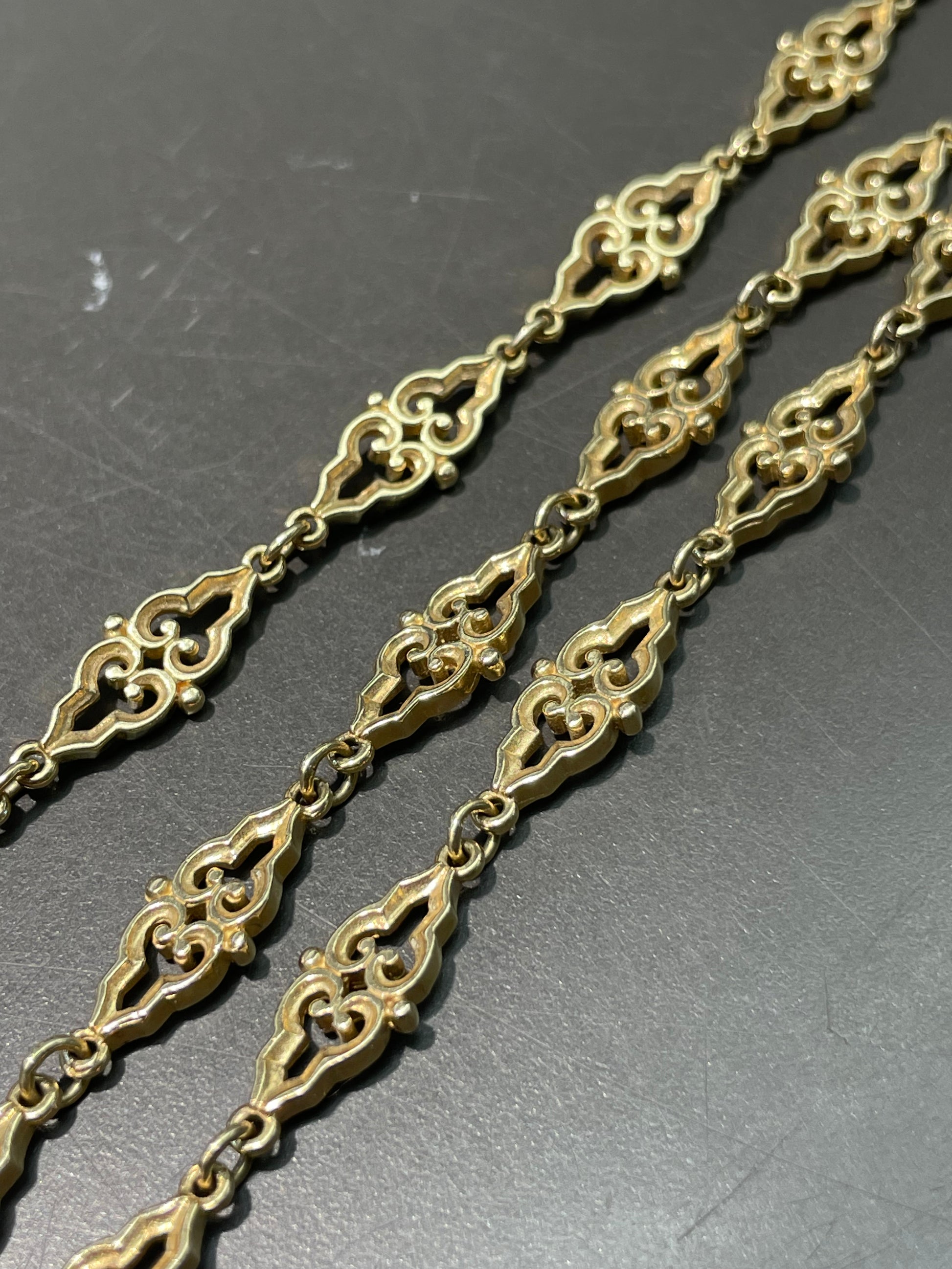 A striking and substantial, long vintage chain necklace in 14K gold with beautiful motif link designs. Secured with a lobster clap.