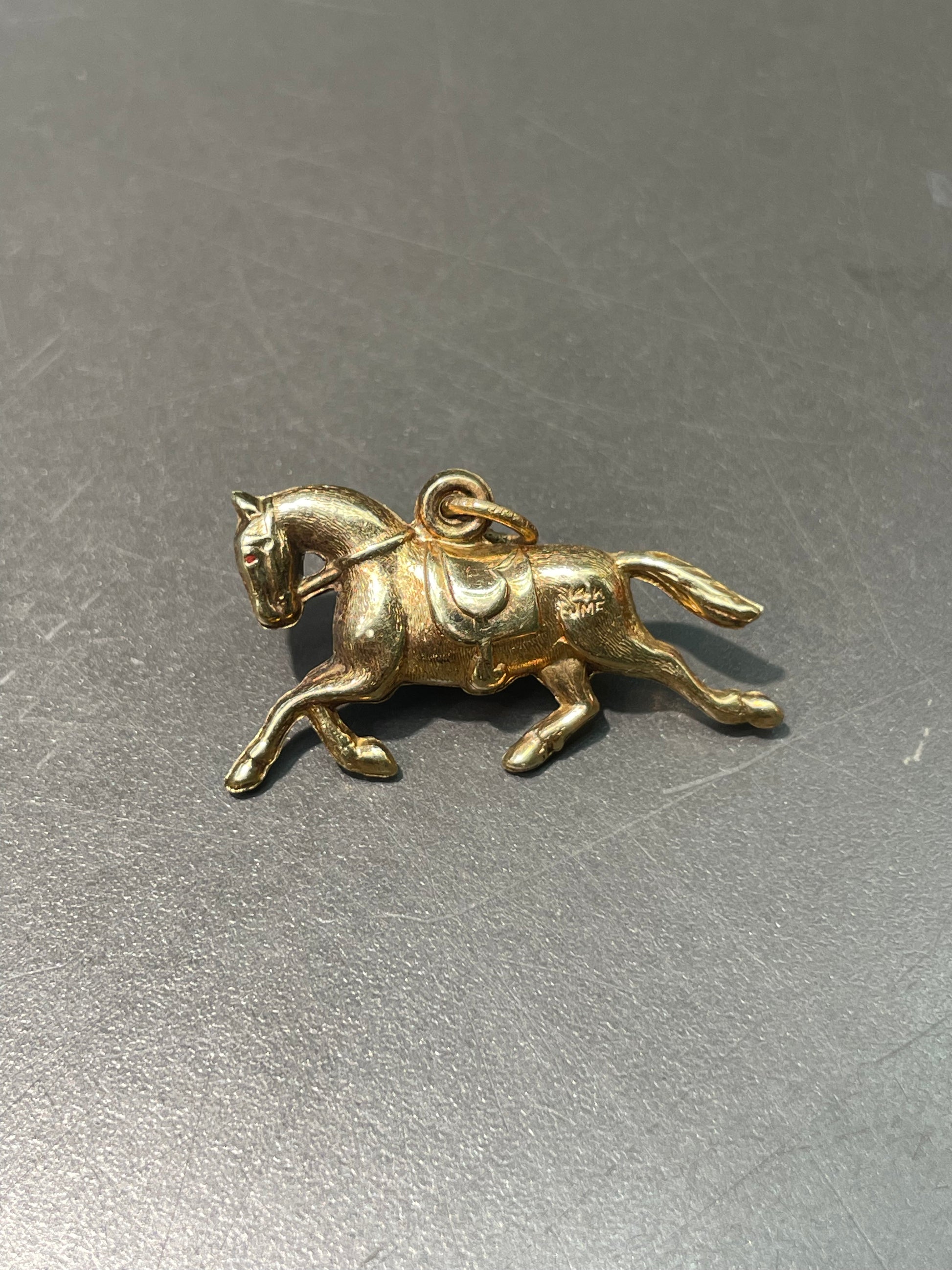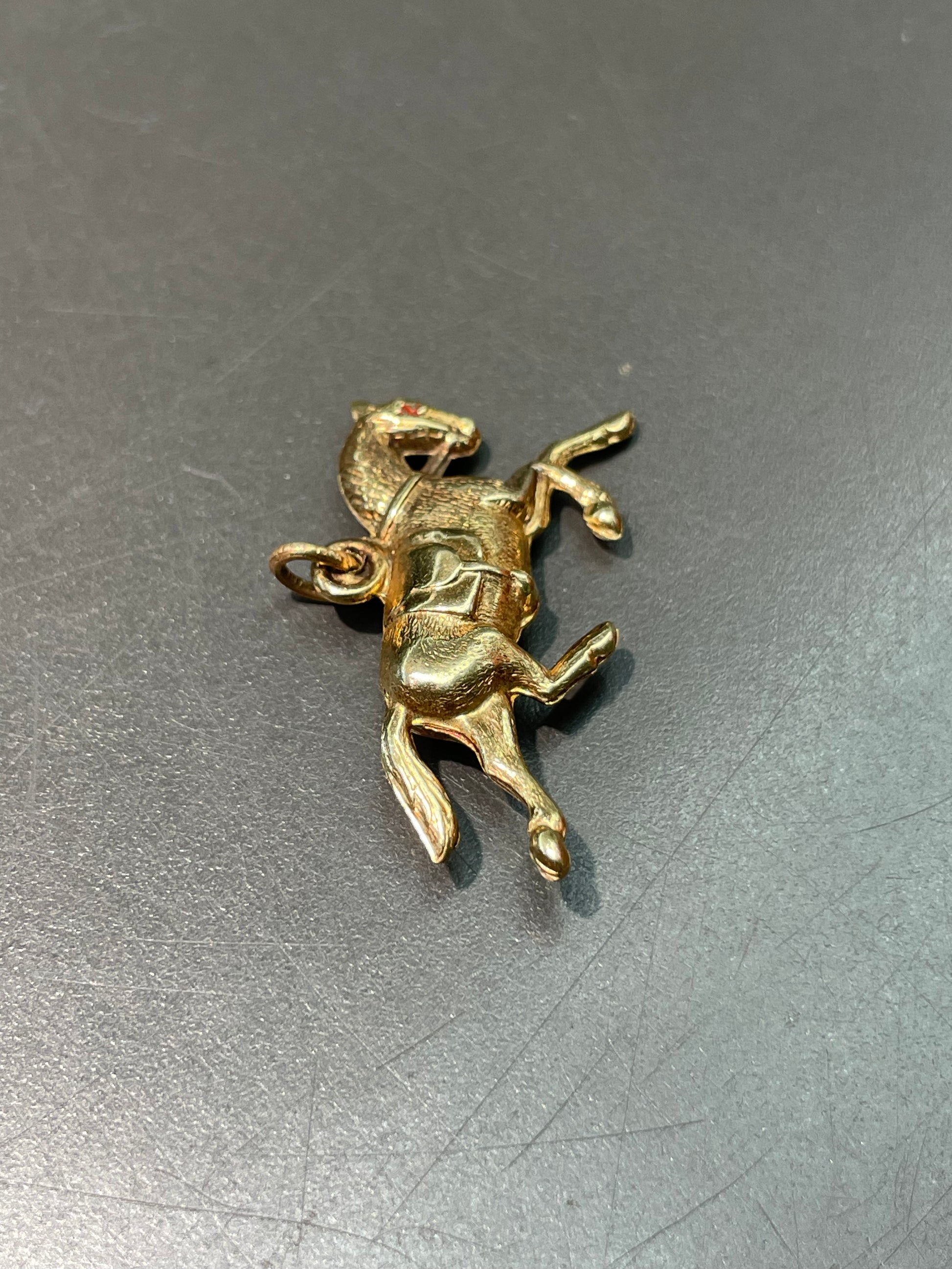A vintage 14K yellow gold semi-hollow horse charm in a trotting position.