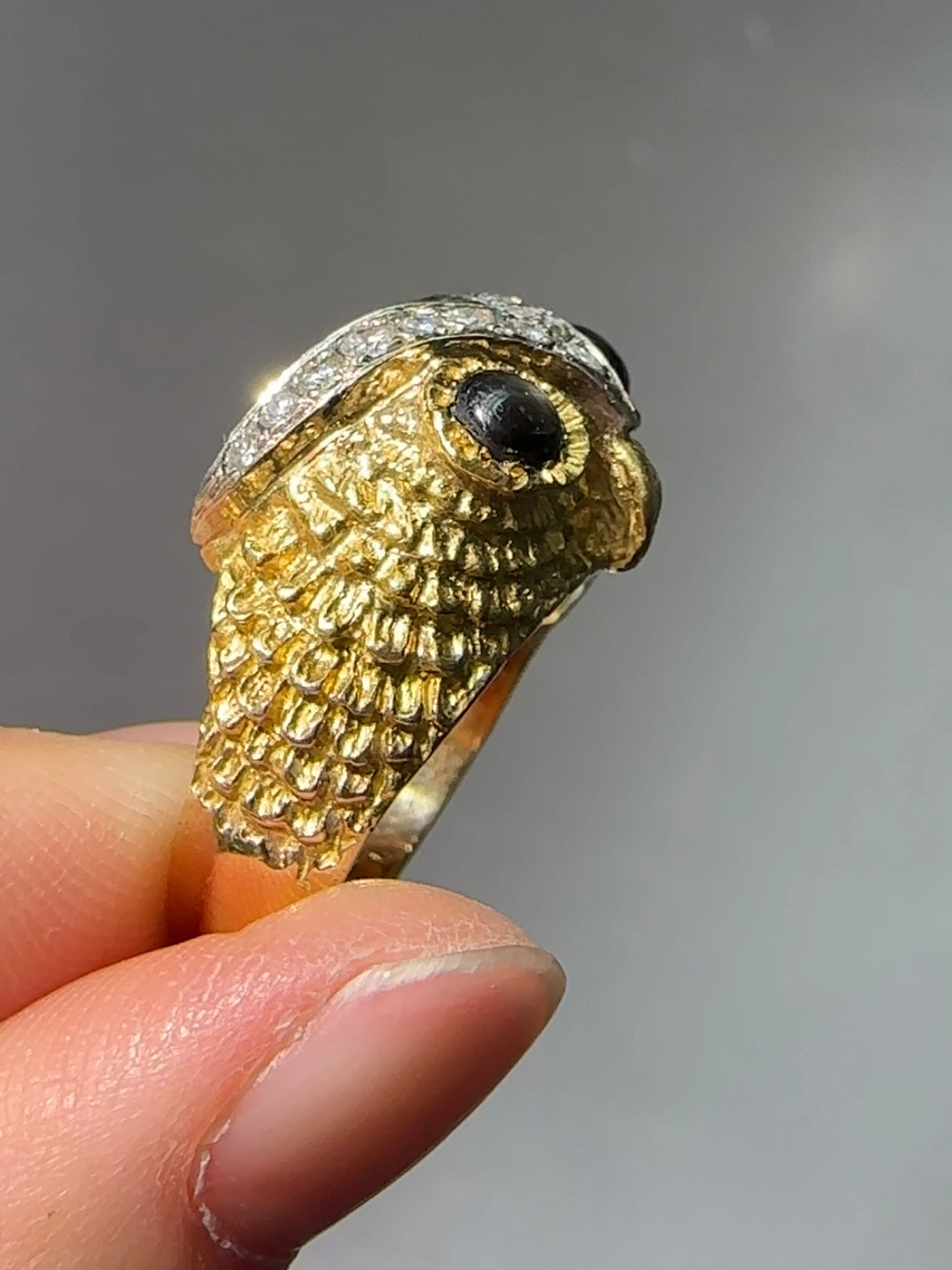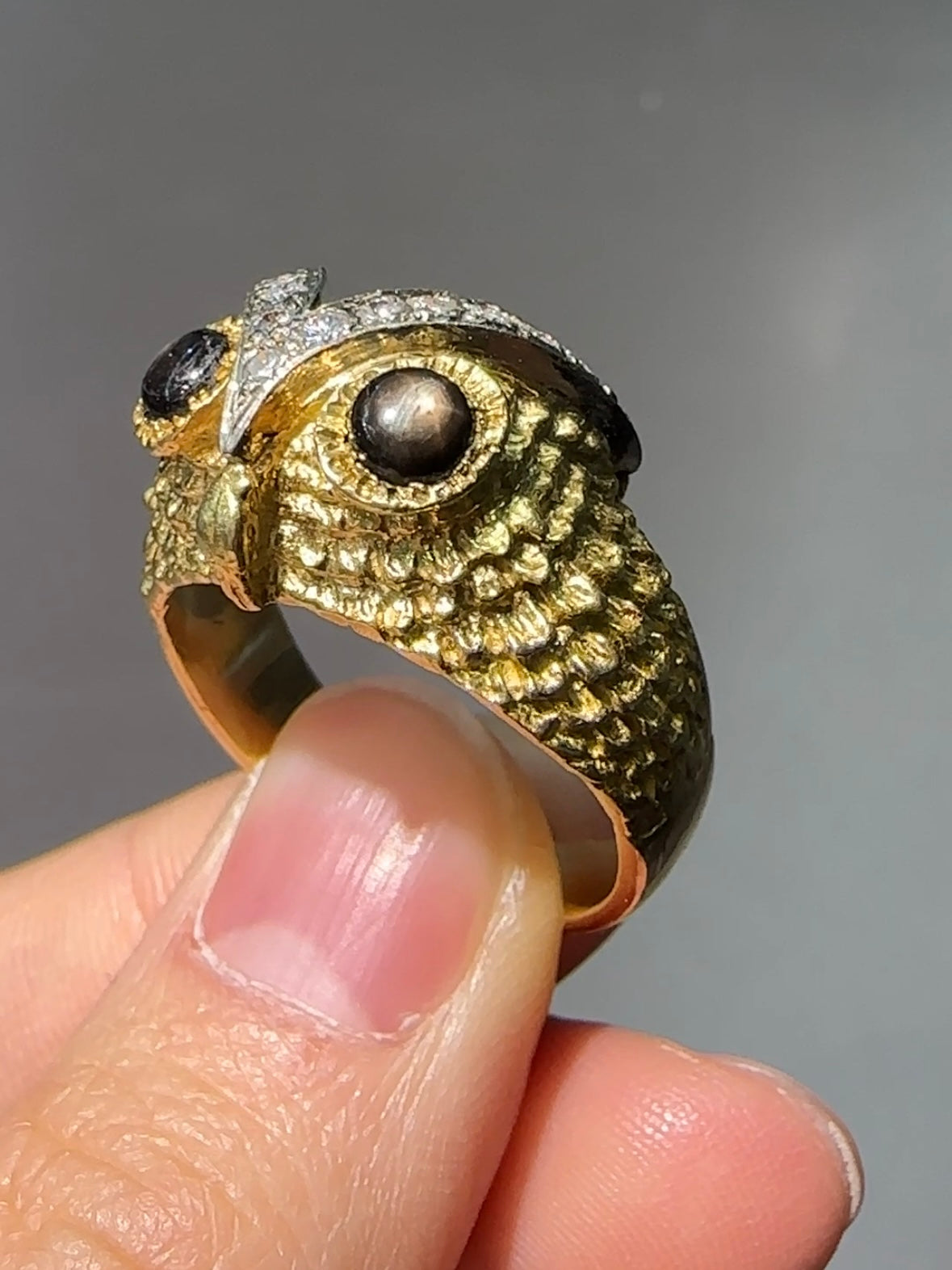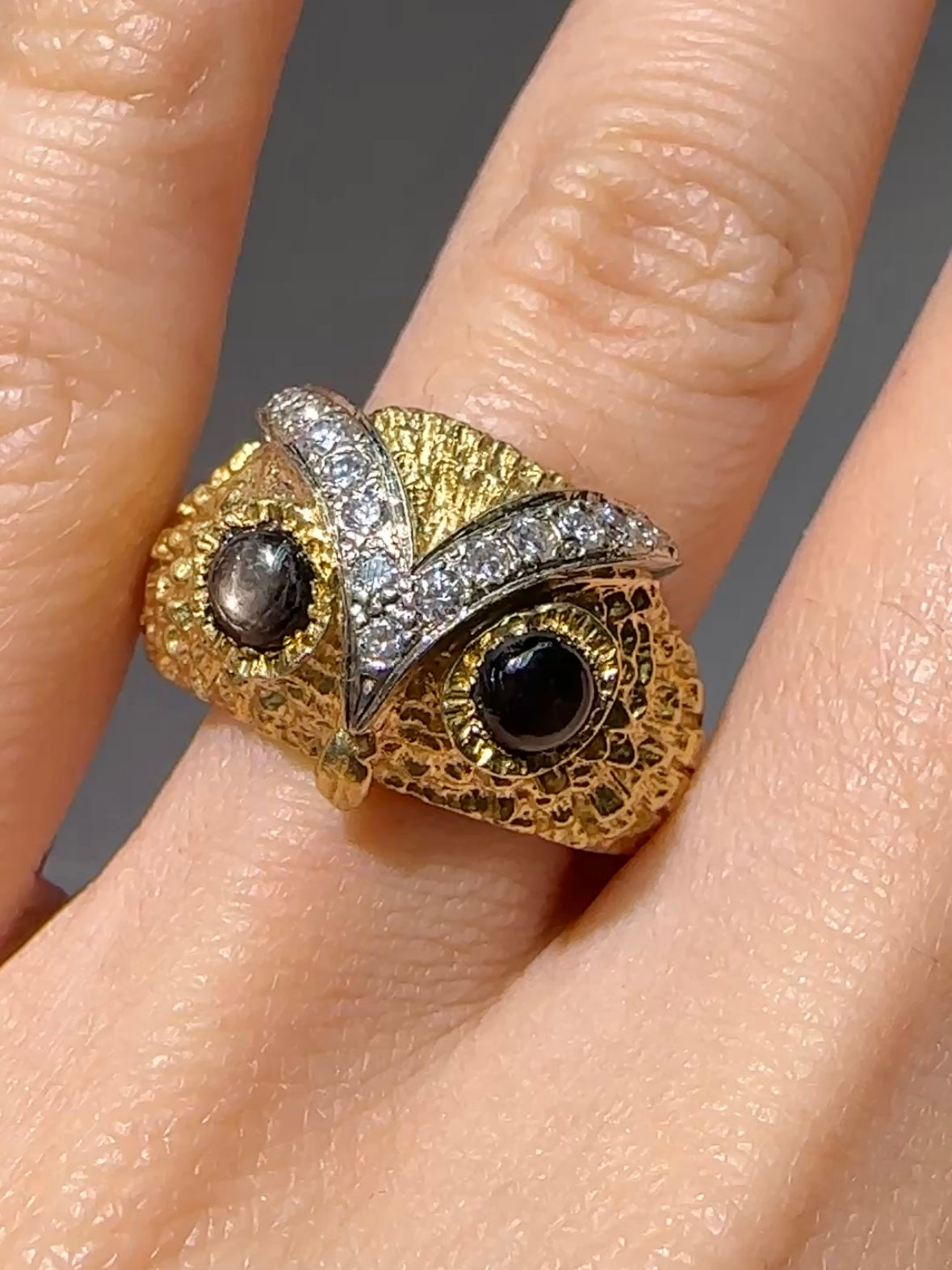 This whimsical vintage 18K gold owl ring captures the playful elegance of nature's wisest creature. This stunning owl ring features luminous cat's eye as the eyes and shimmering white brilliant cut diamonds accenting its delicately crafted eyebrows!