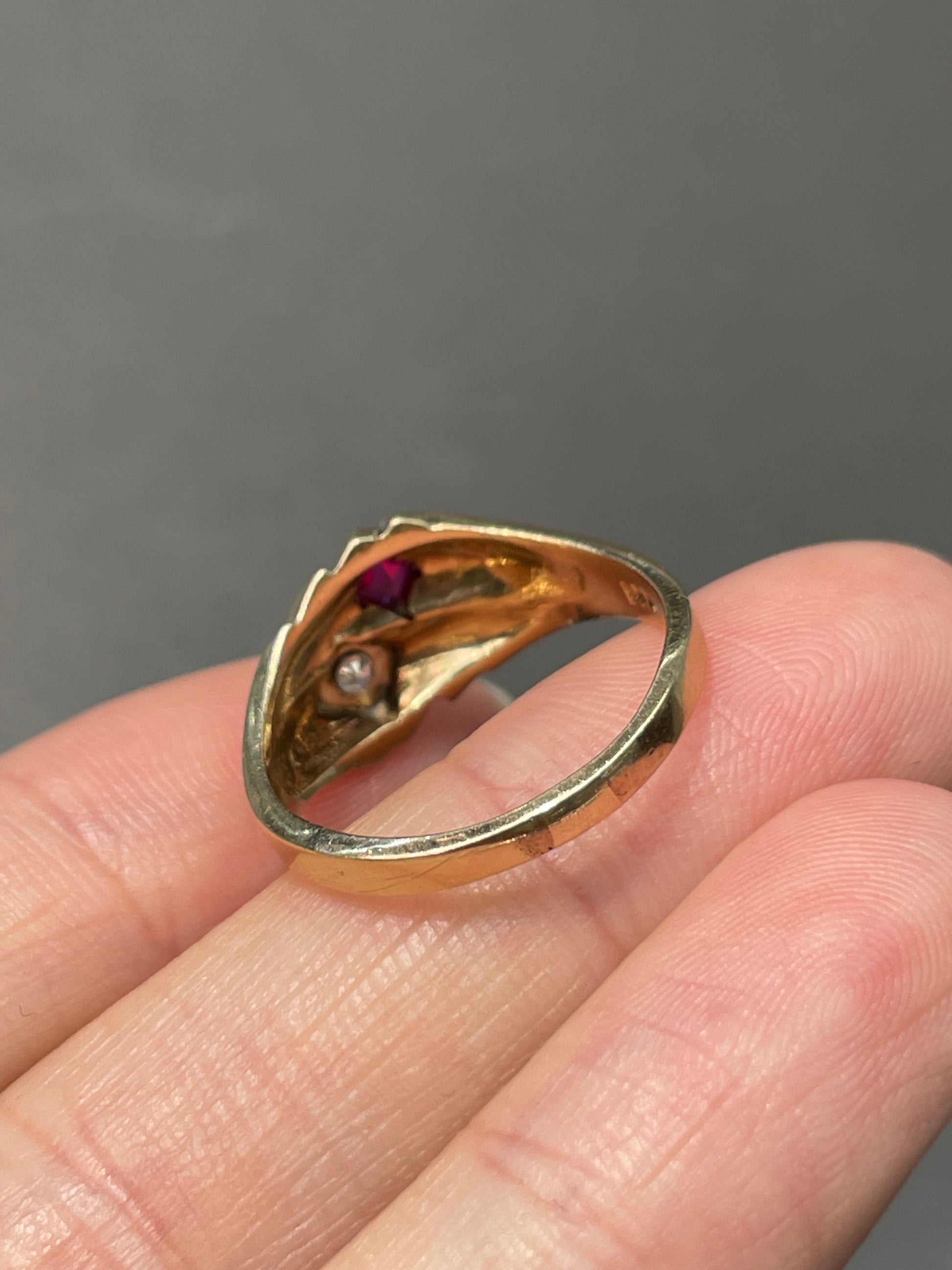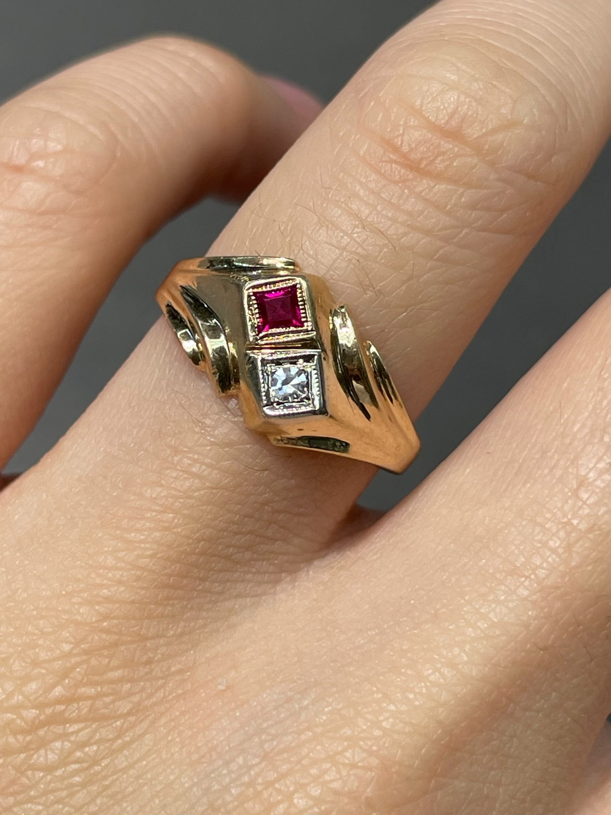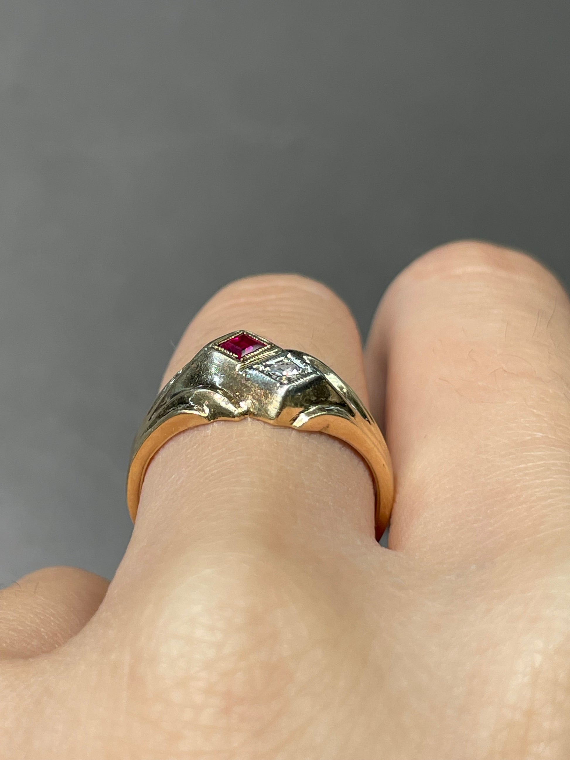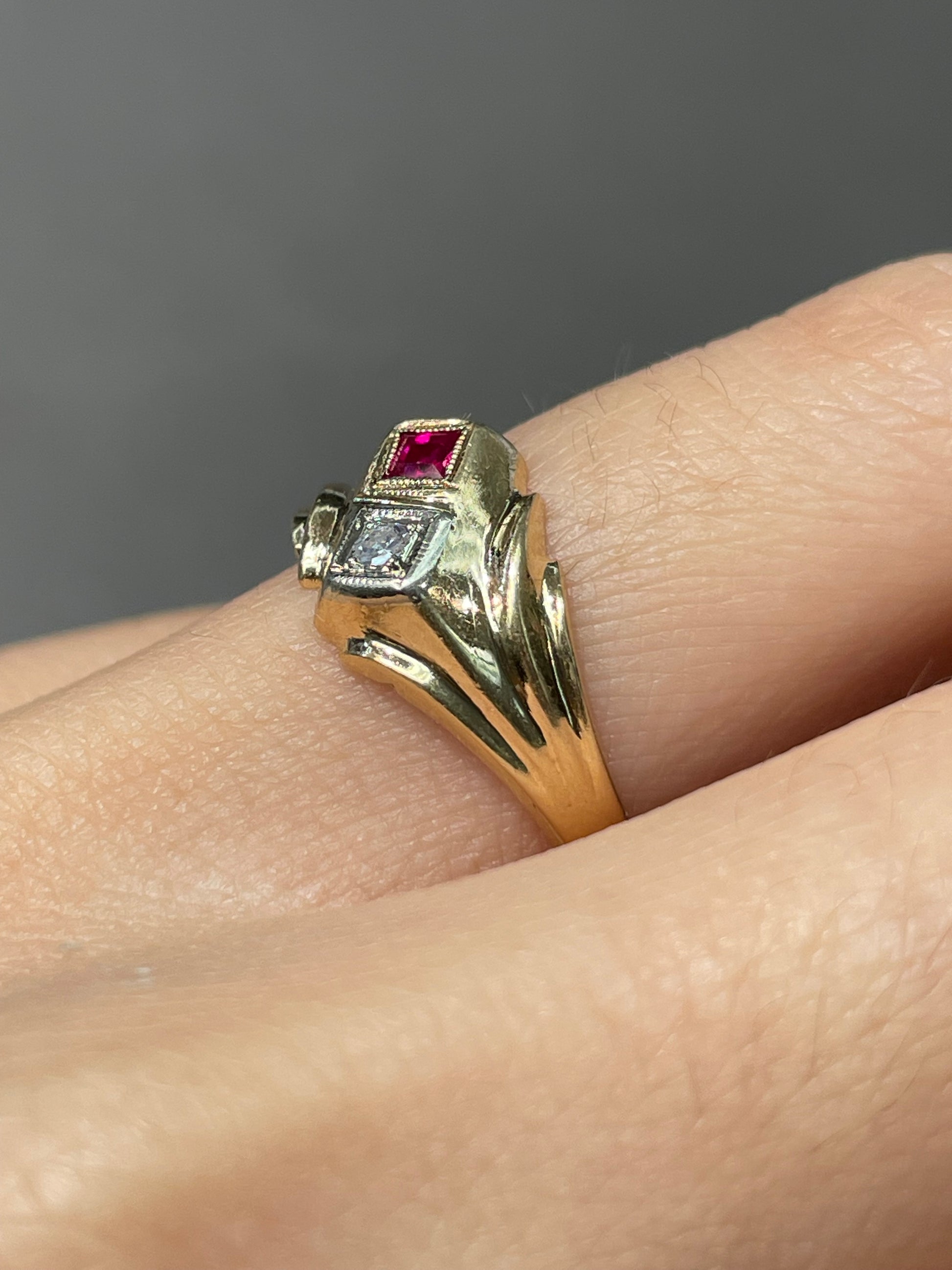 A intricate Retro era 14K gold ring set with a sparkling white single cut diamond totaling 0.06 carats (VS clarity, I color) and a synthetic calibre cut ruby.