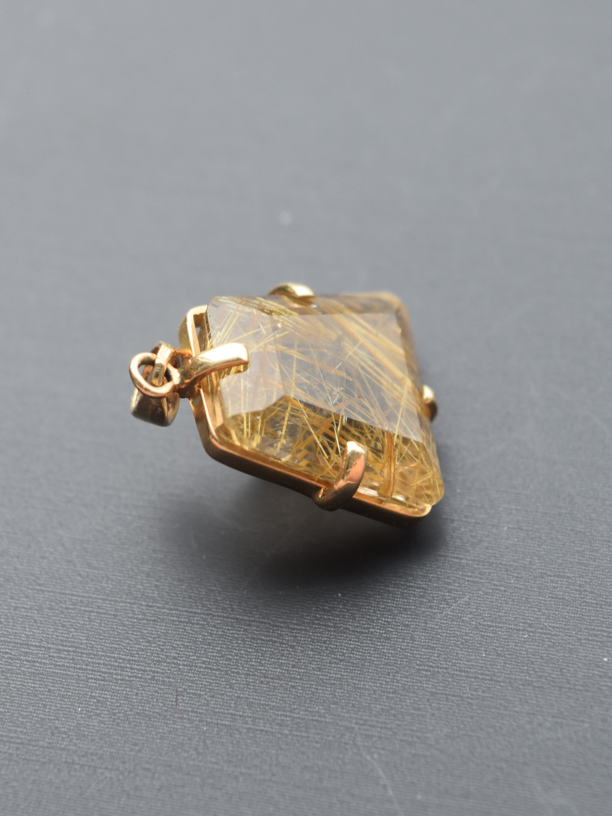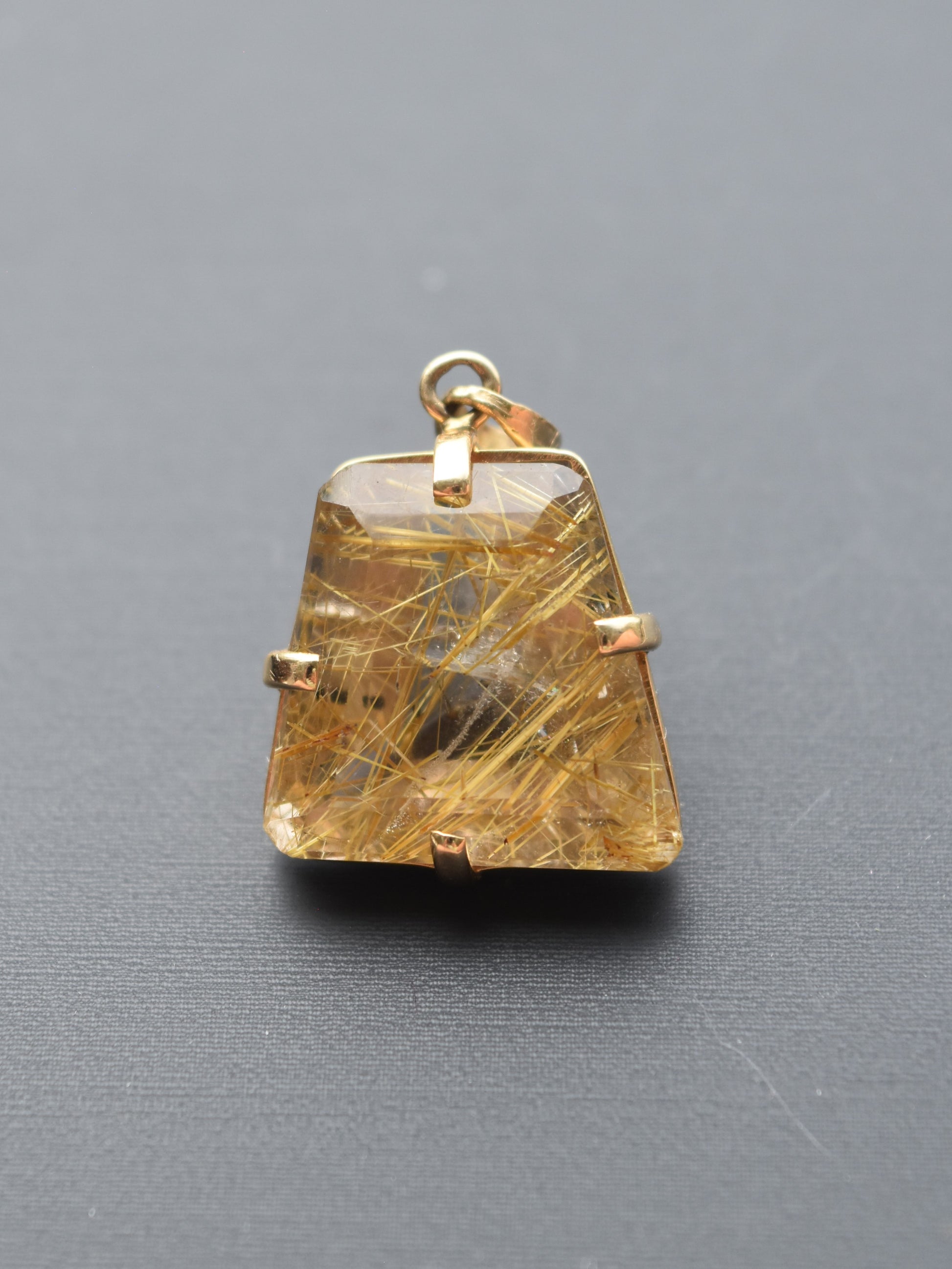 有趣异想天开的金红石石英吊坠,镶嵌在 14K 金上,充满明亮的金色针状(针状)金红石内含物。