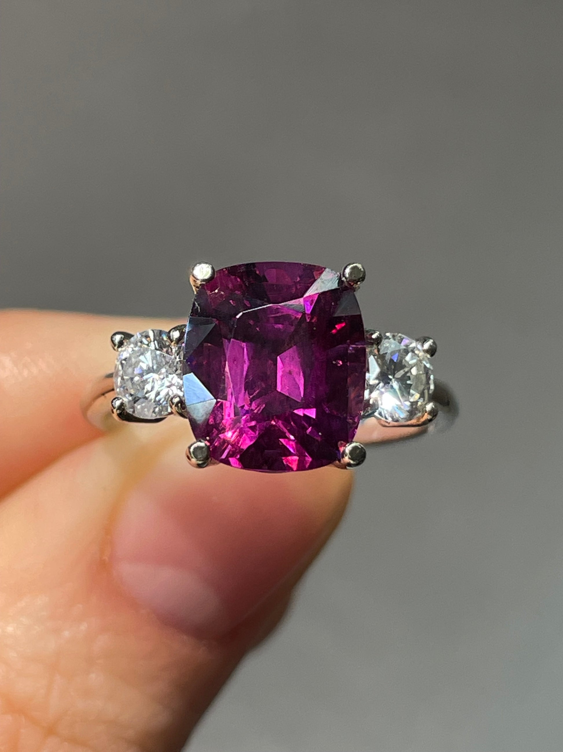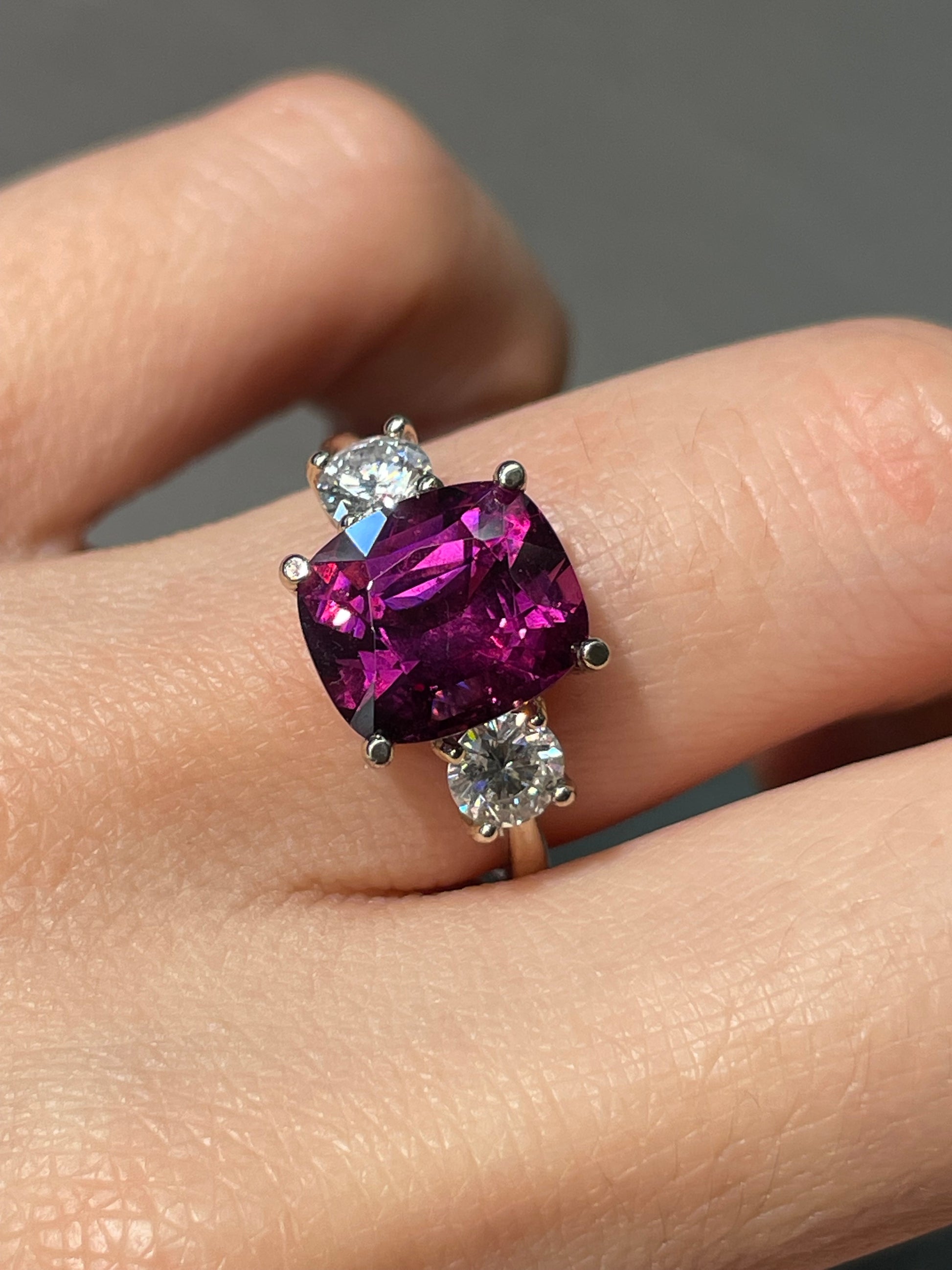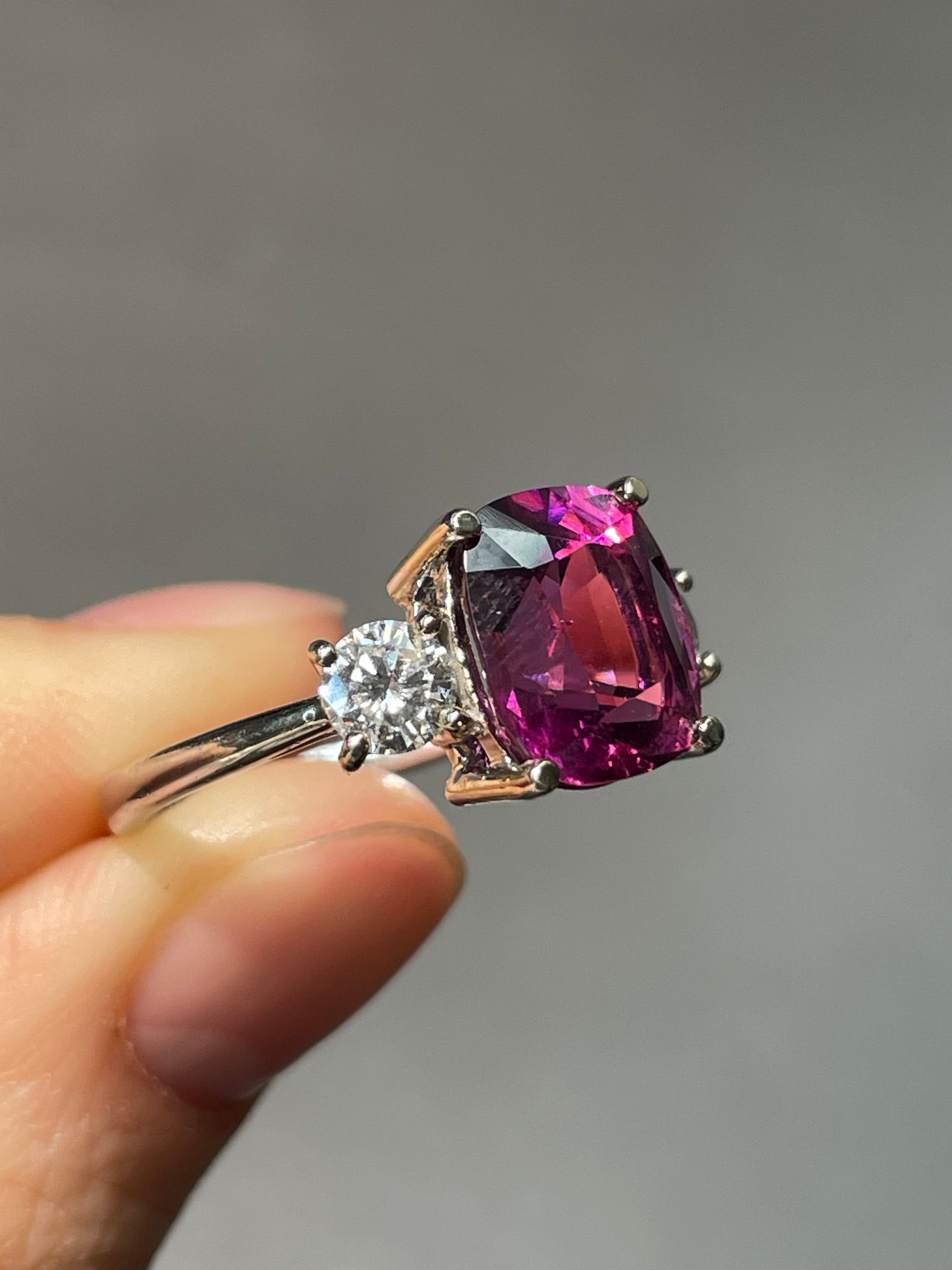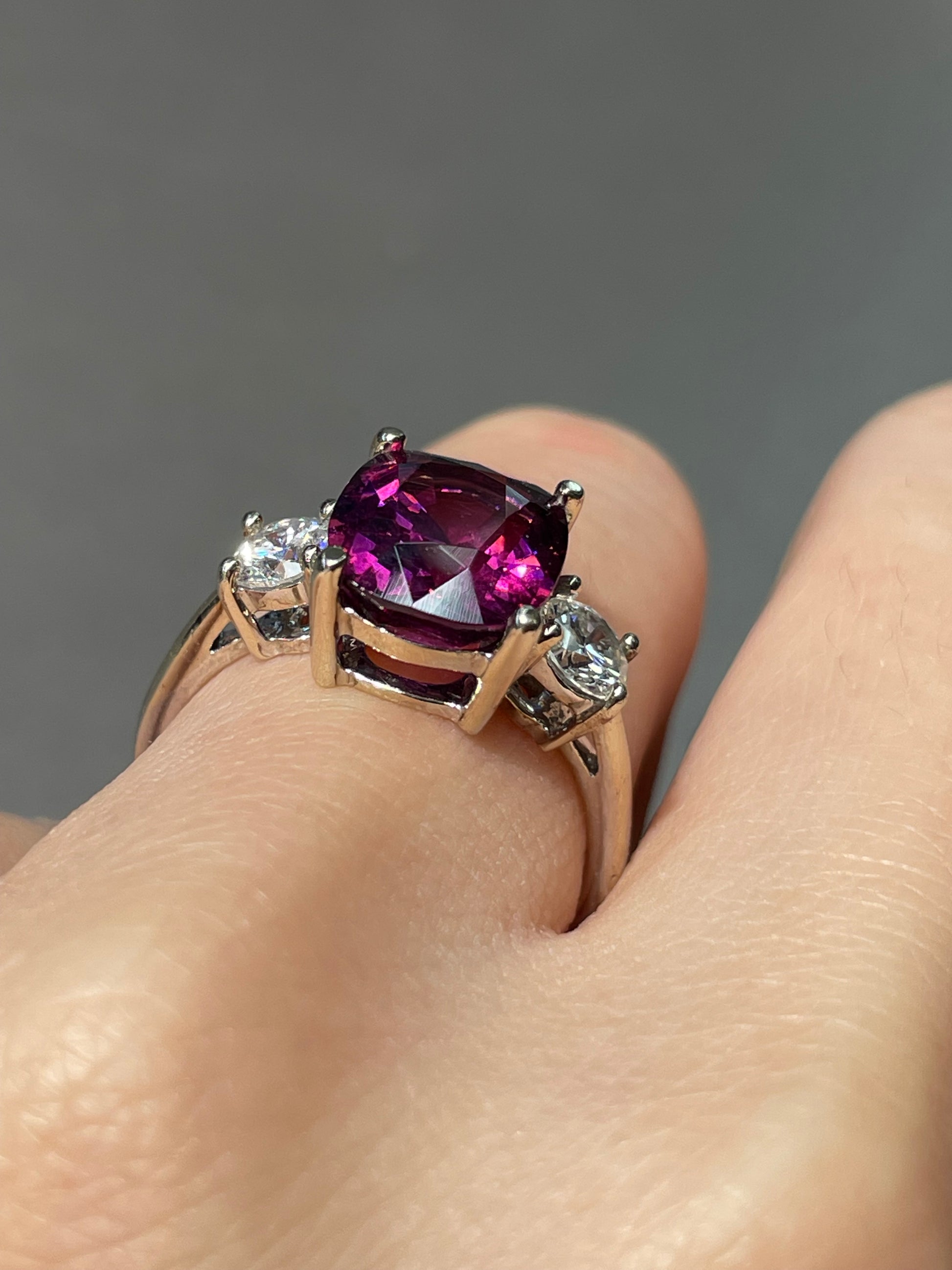 A classy 14K white gold rhodolite and diamond trilogy ring centered with a luscious mulberry-pinkish-red natural cushion cut rhodolite garnet totaling 4.5 carats glistening between two sparkling white brilliant cut diamonds totaling 0.70 carats high in VS clarity, and G-H color. Currently size 6.25 and resizable upon request.