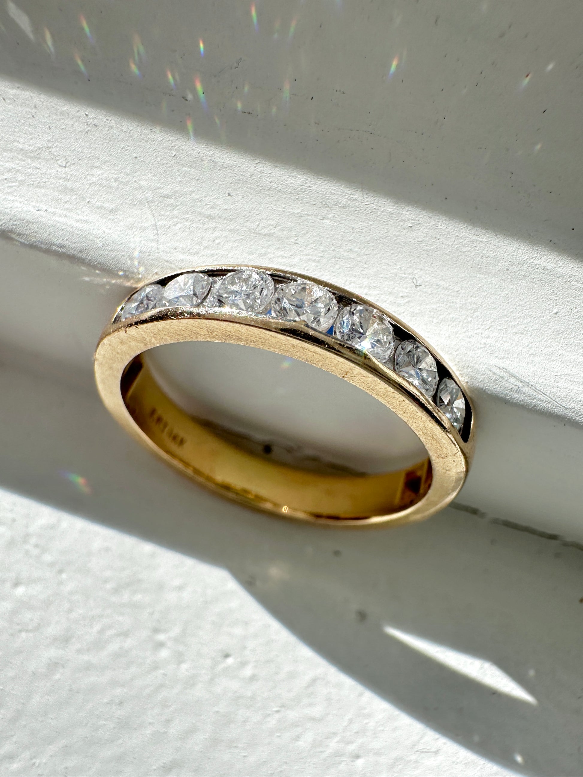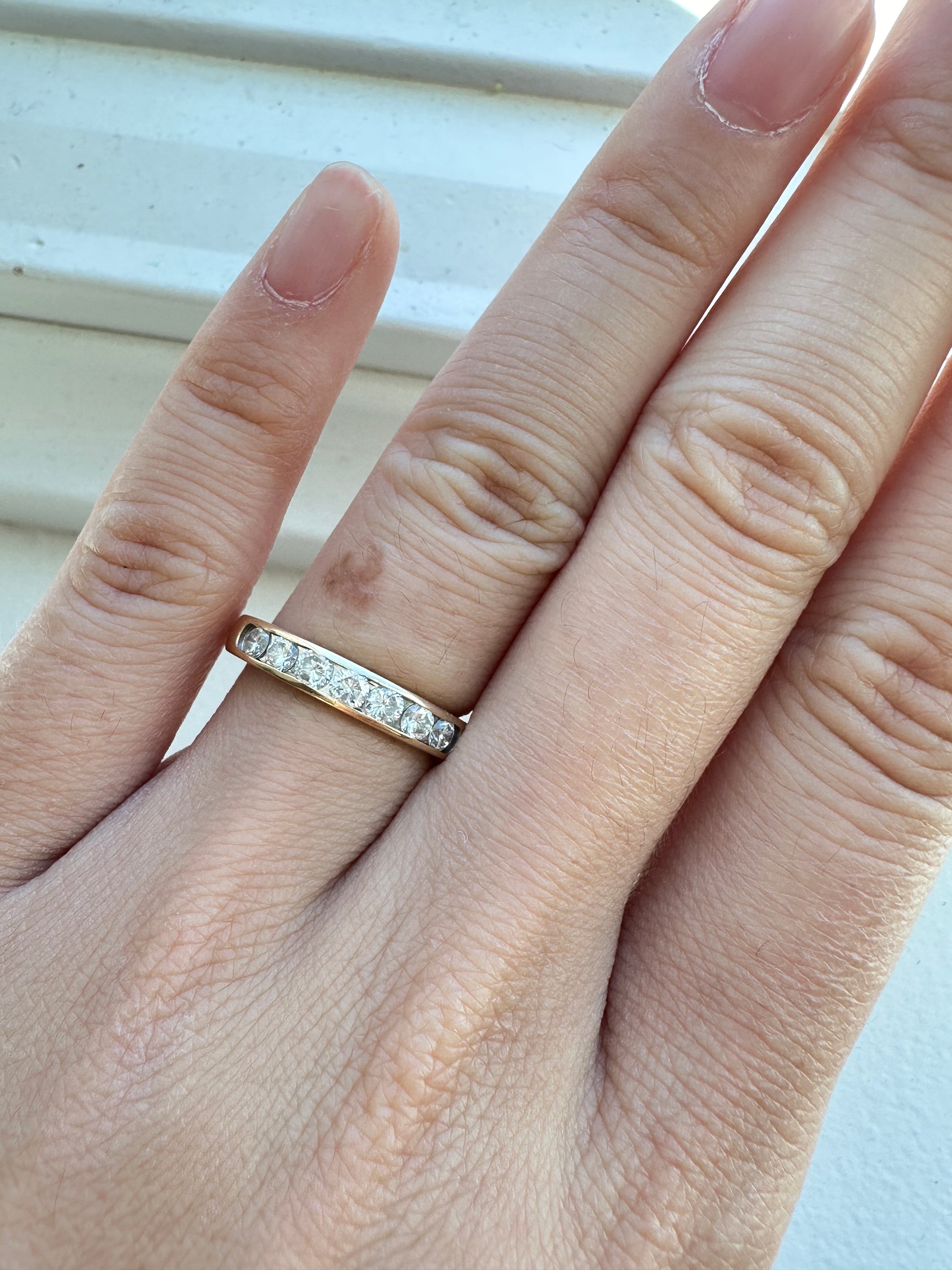 七颗闪亮的白色明亮式切割钻石,每颗重 0.10 克拉,镶嵌在可调整大小的 14K 金戒指上。