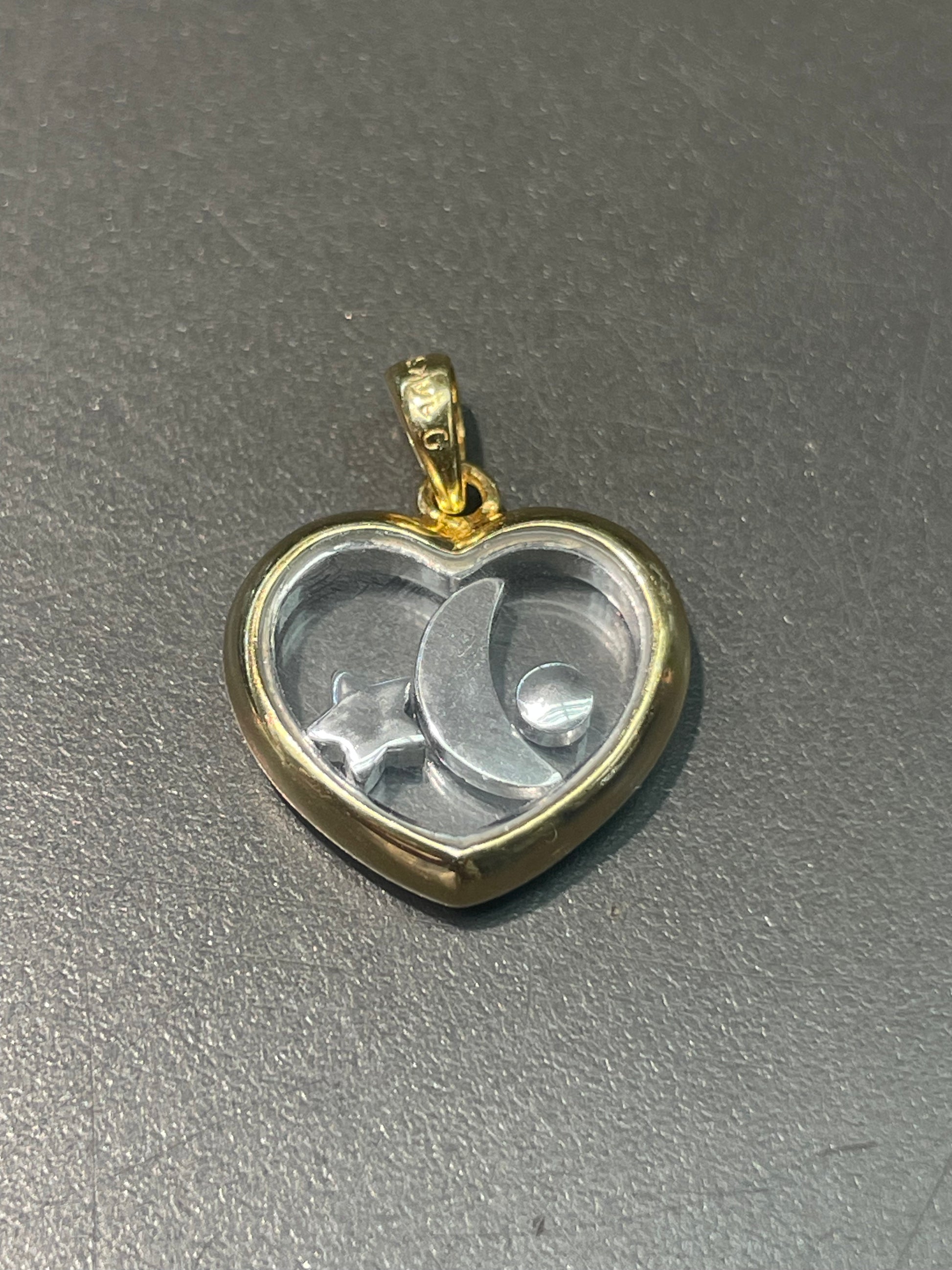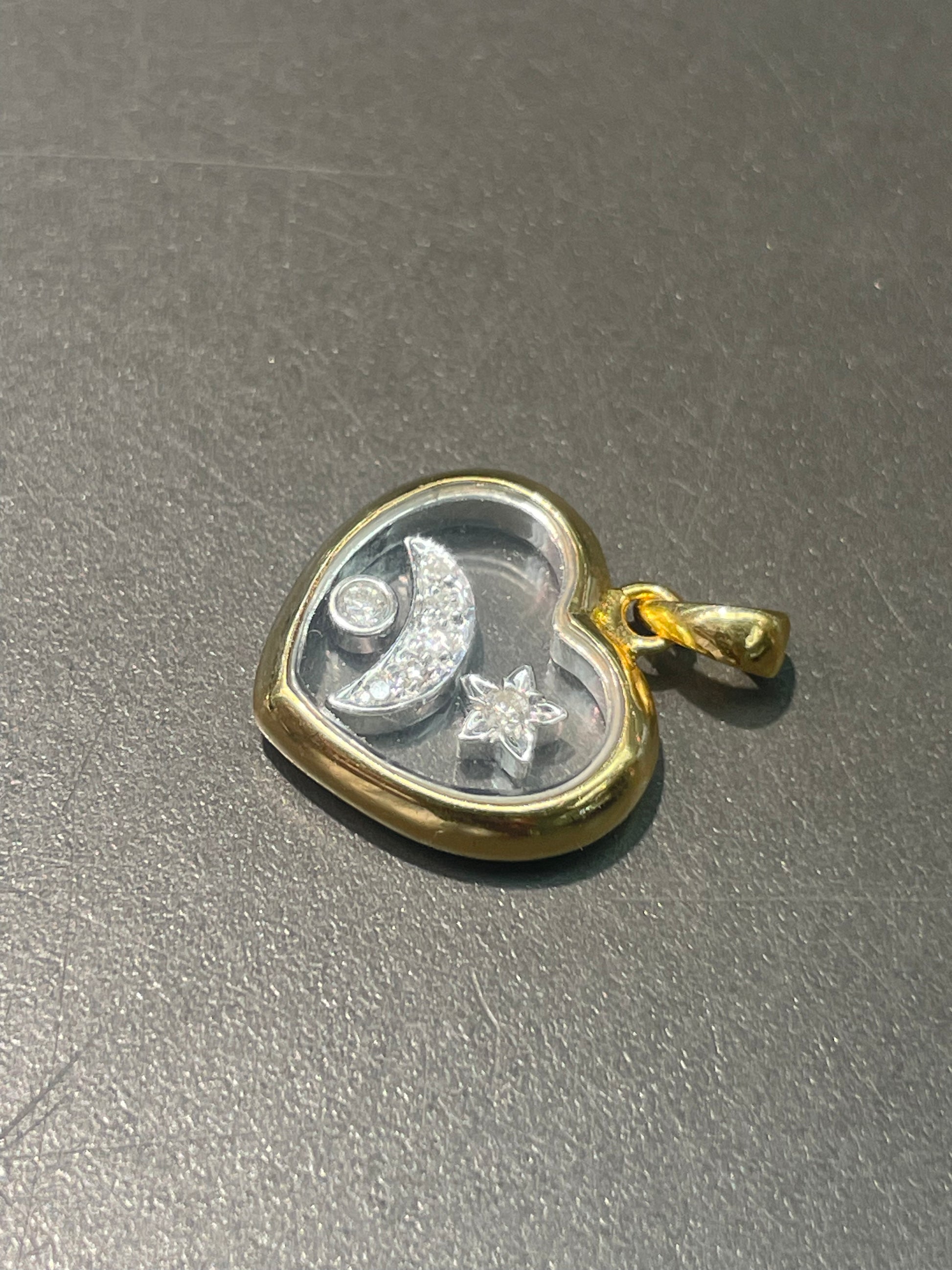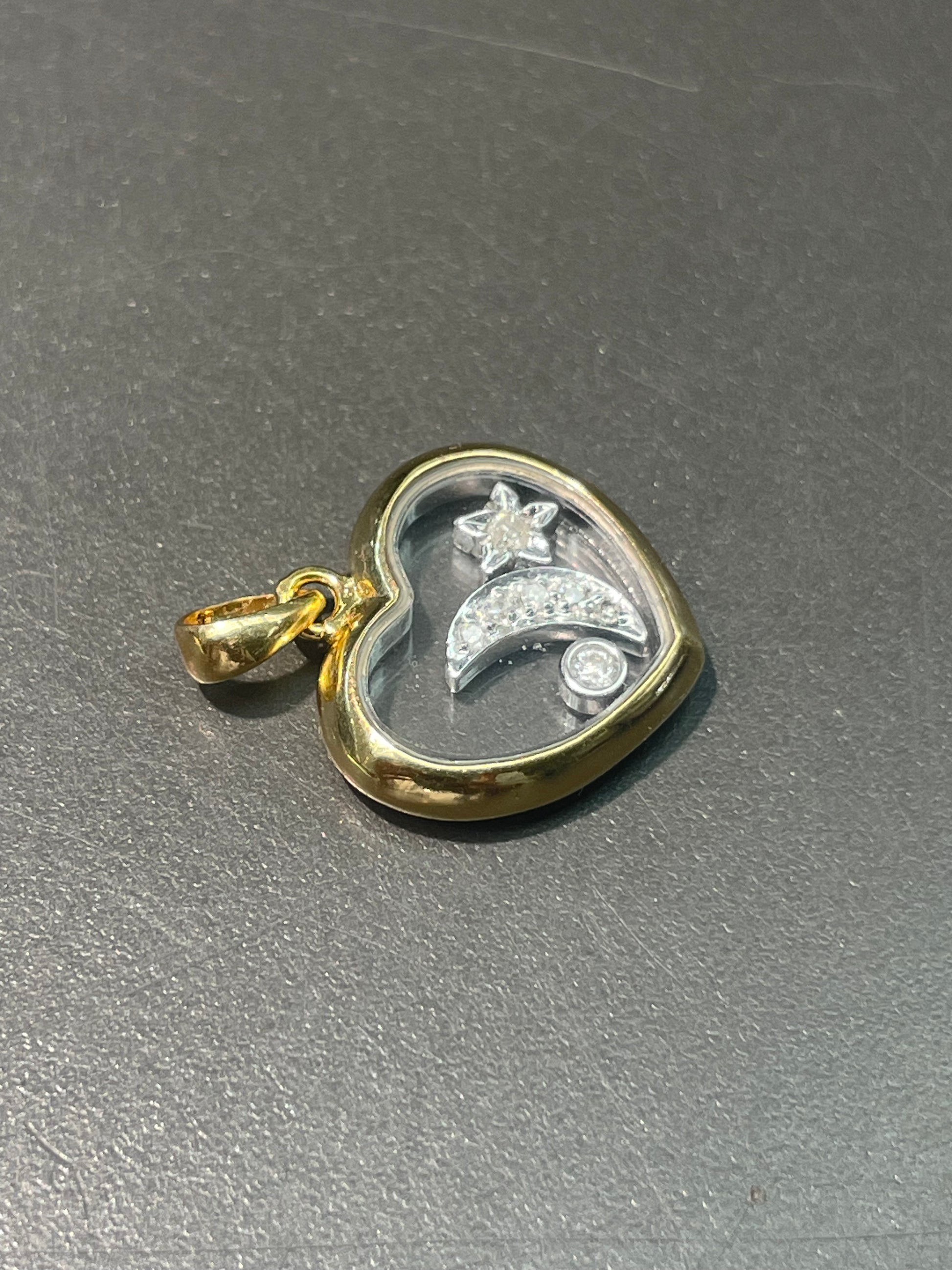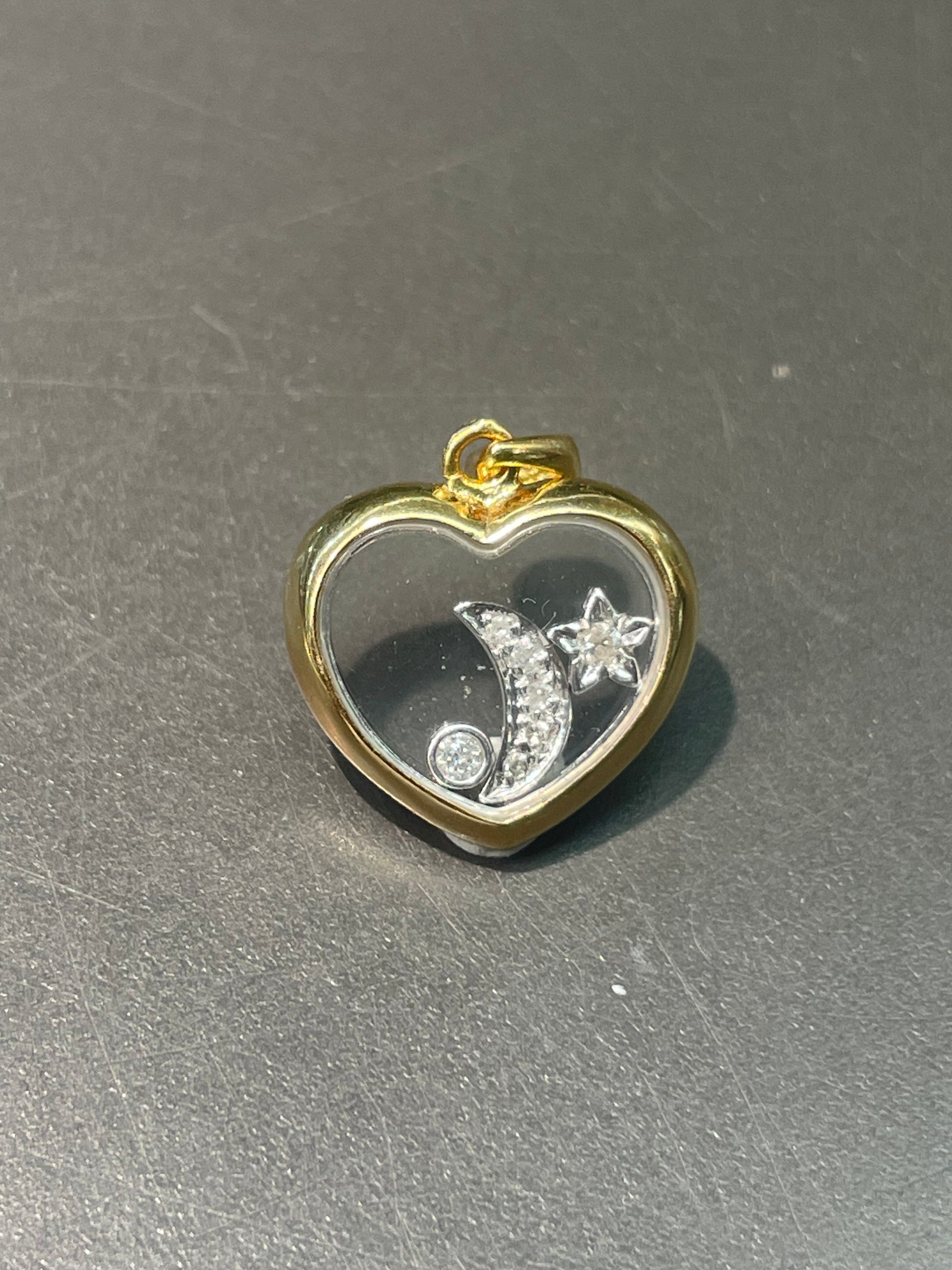 A 14K yellow gold floating diamond heart pendant encapsulated with tiny crescent and heart charms between the two sapphire crystal panels.