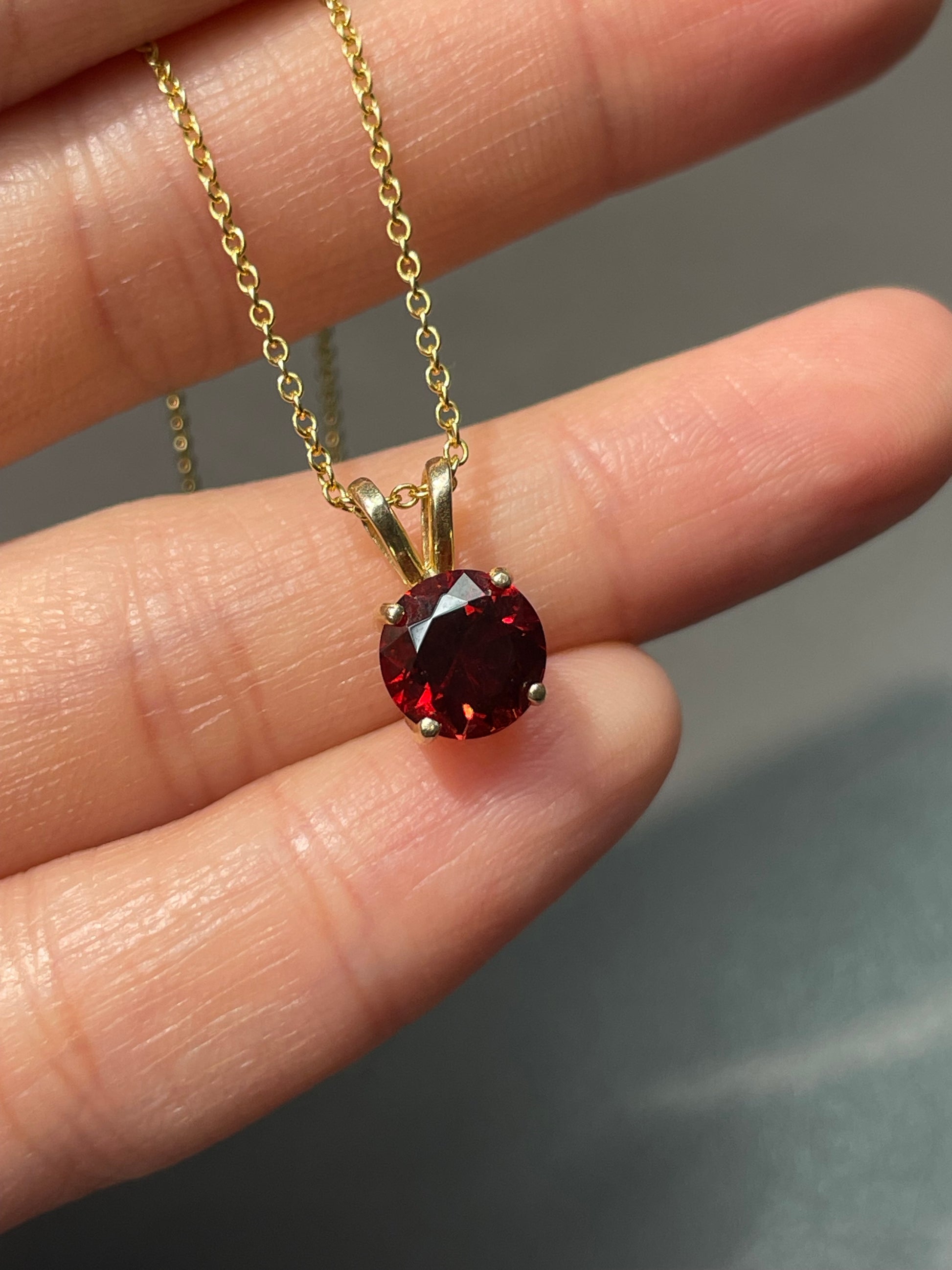 A vibrant large Cabernet red garnet set on 14K yellow gold pendant.