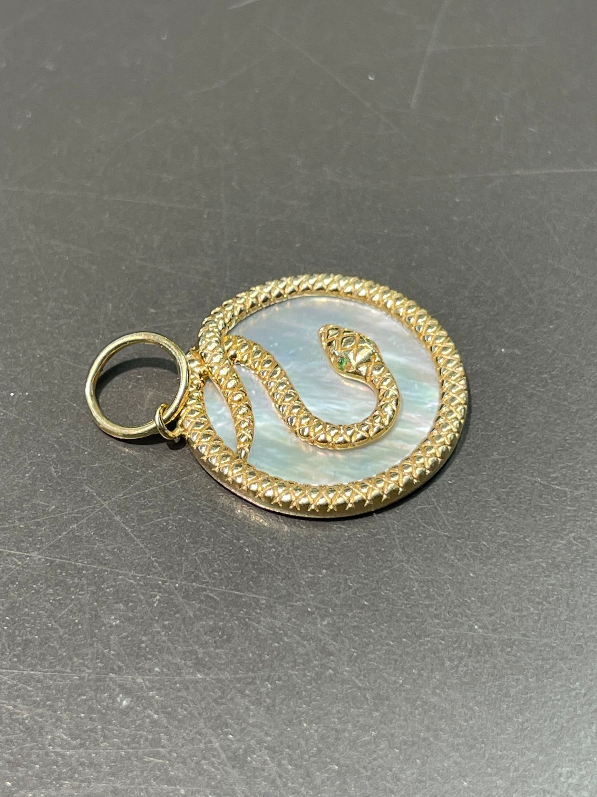 A 14K gold mother-of-pearl snake pendant, featuring a 14K gold serpent with emerald set eyes set atop mother of pearl.