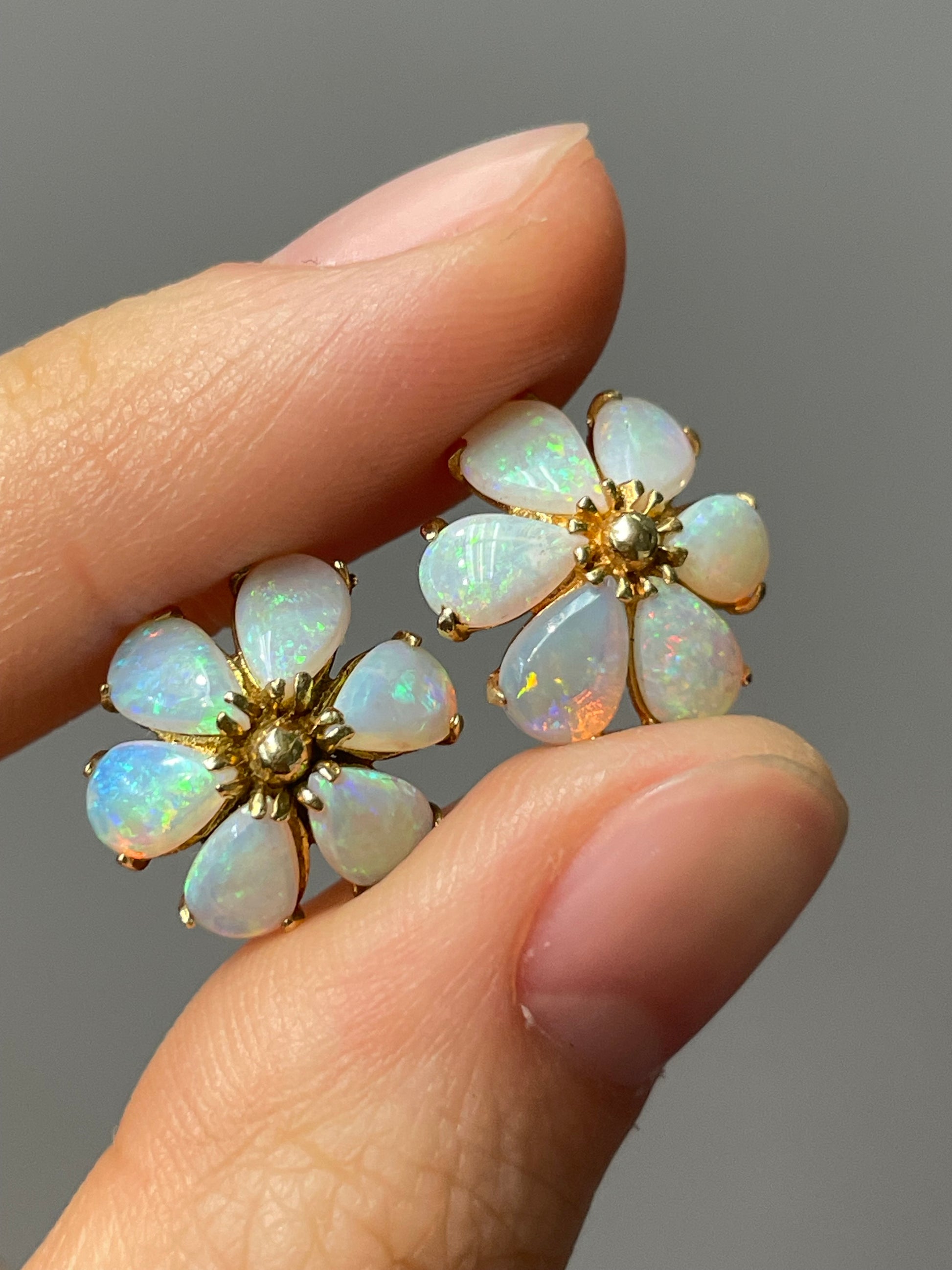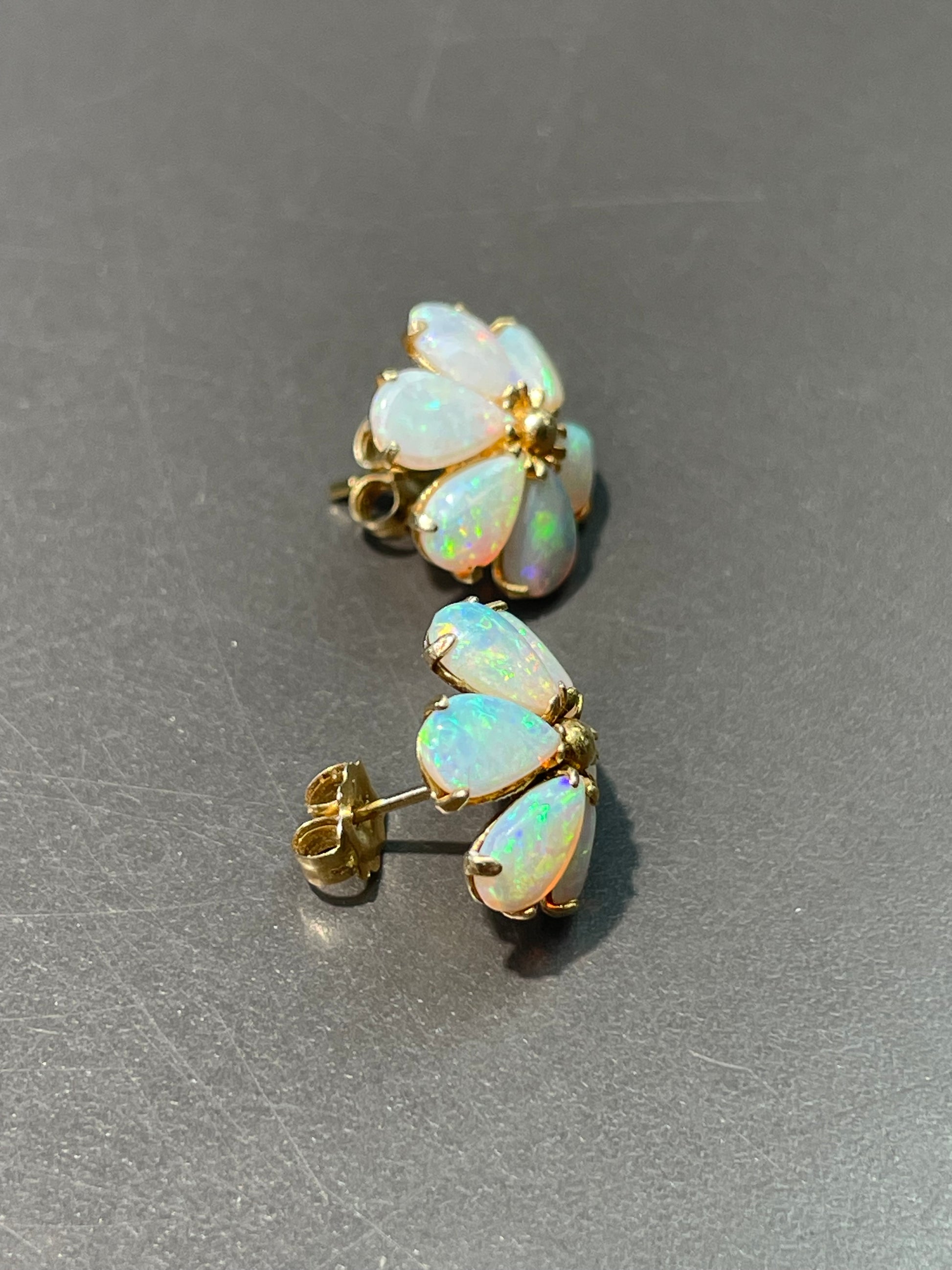 A pair of 14K yellow gold opal cluster earring set with gorgeous drop shaped Australian opals with a stunning color of play forming into a daisy shape.