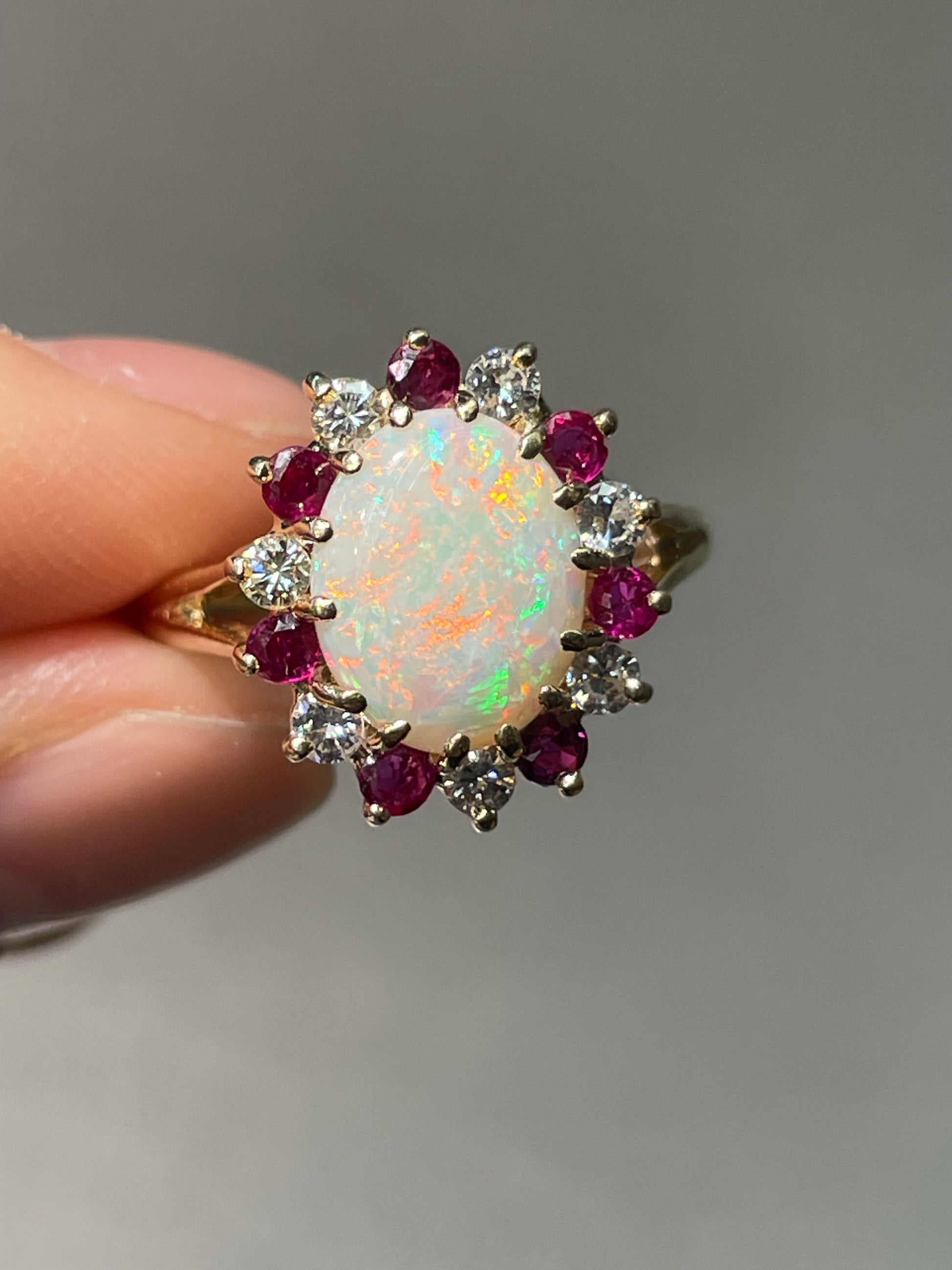 14K Yellow Gold Opal Ruby Diamond Halo Ring