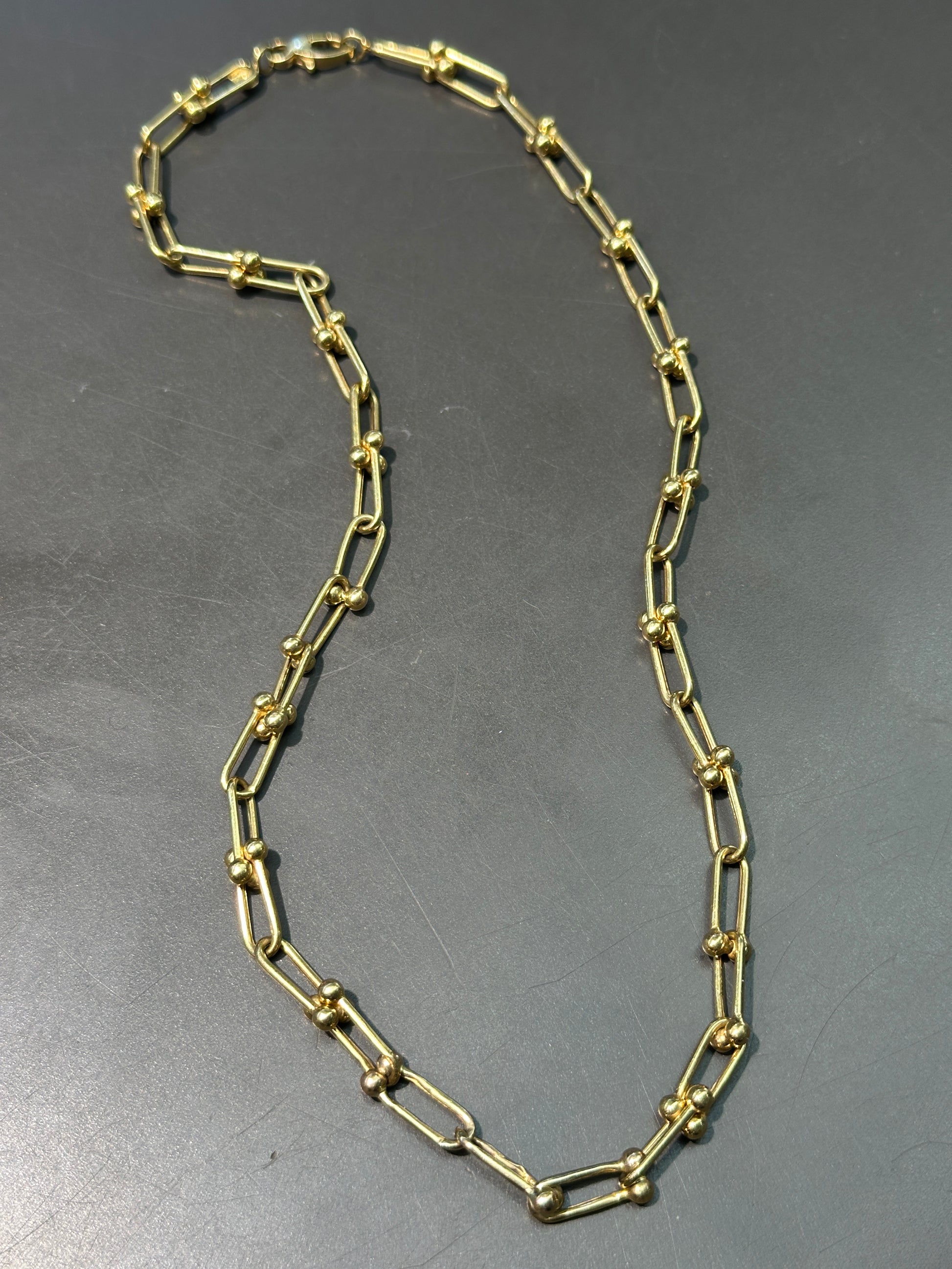 A chic 14K yellow gold hardware link necklace featuring semi-hollow interlocking links. It also fastens with a lobster clasp on the back, making it perfect for adding charms on as a pendant necklace too!