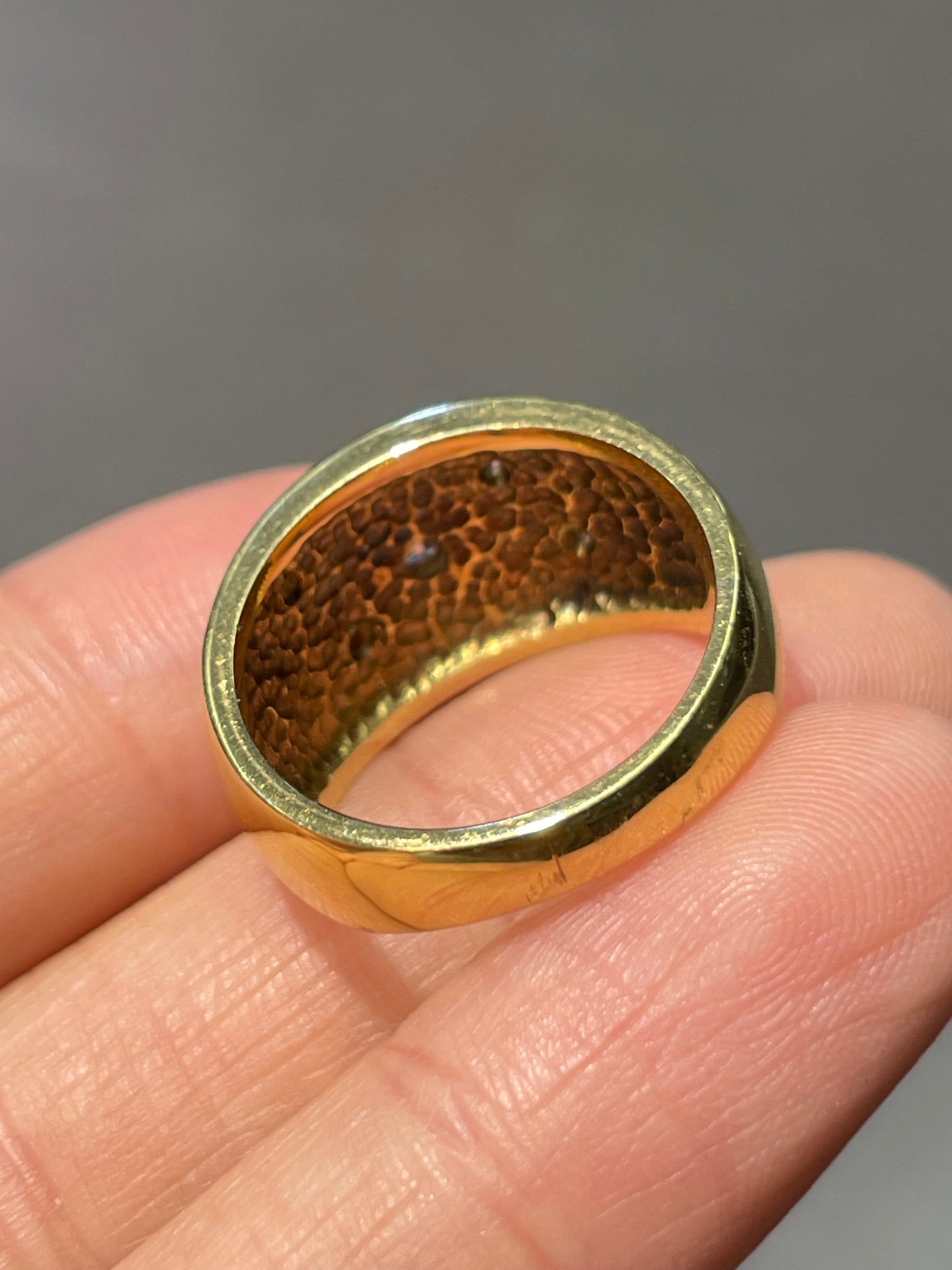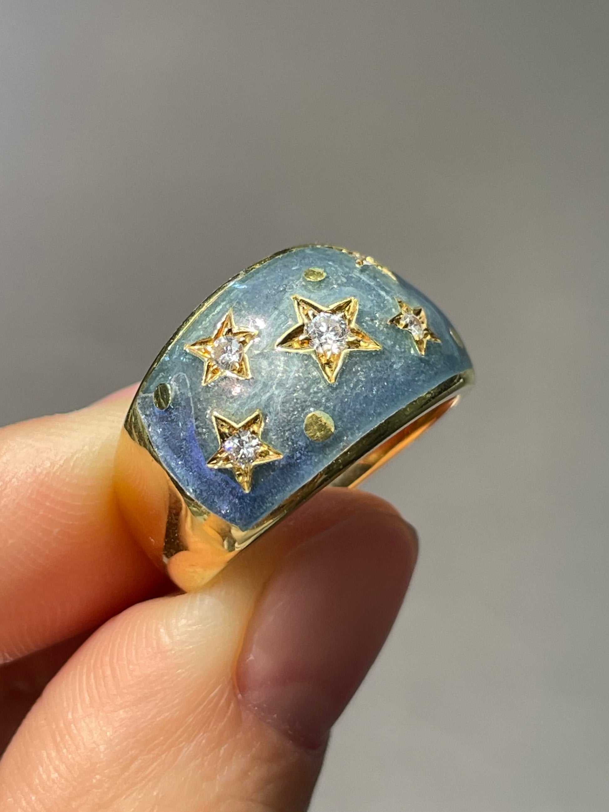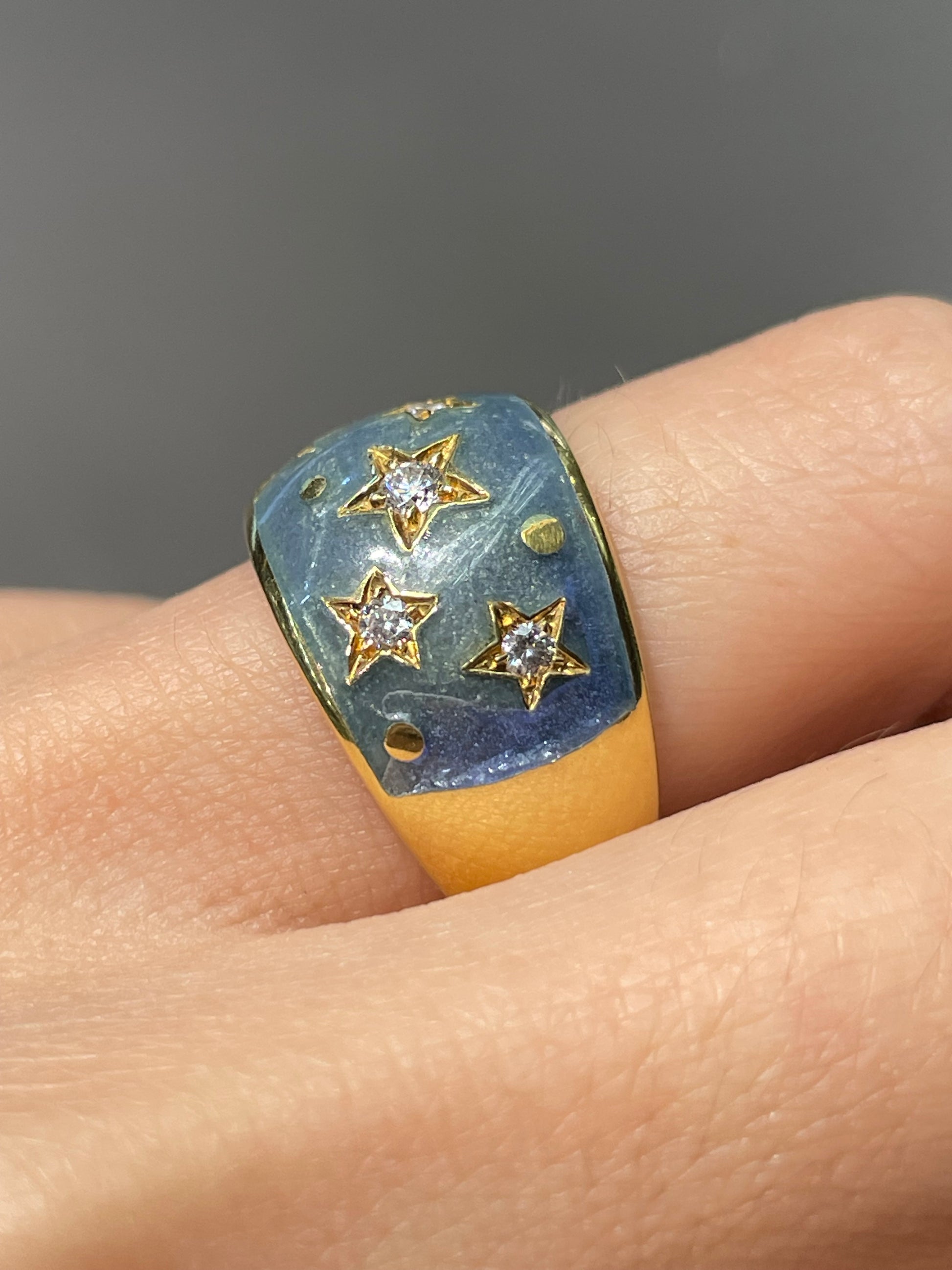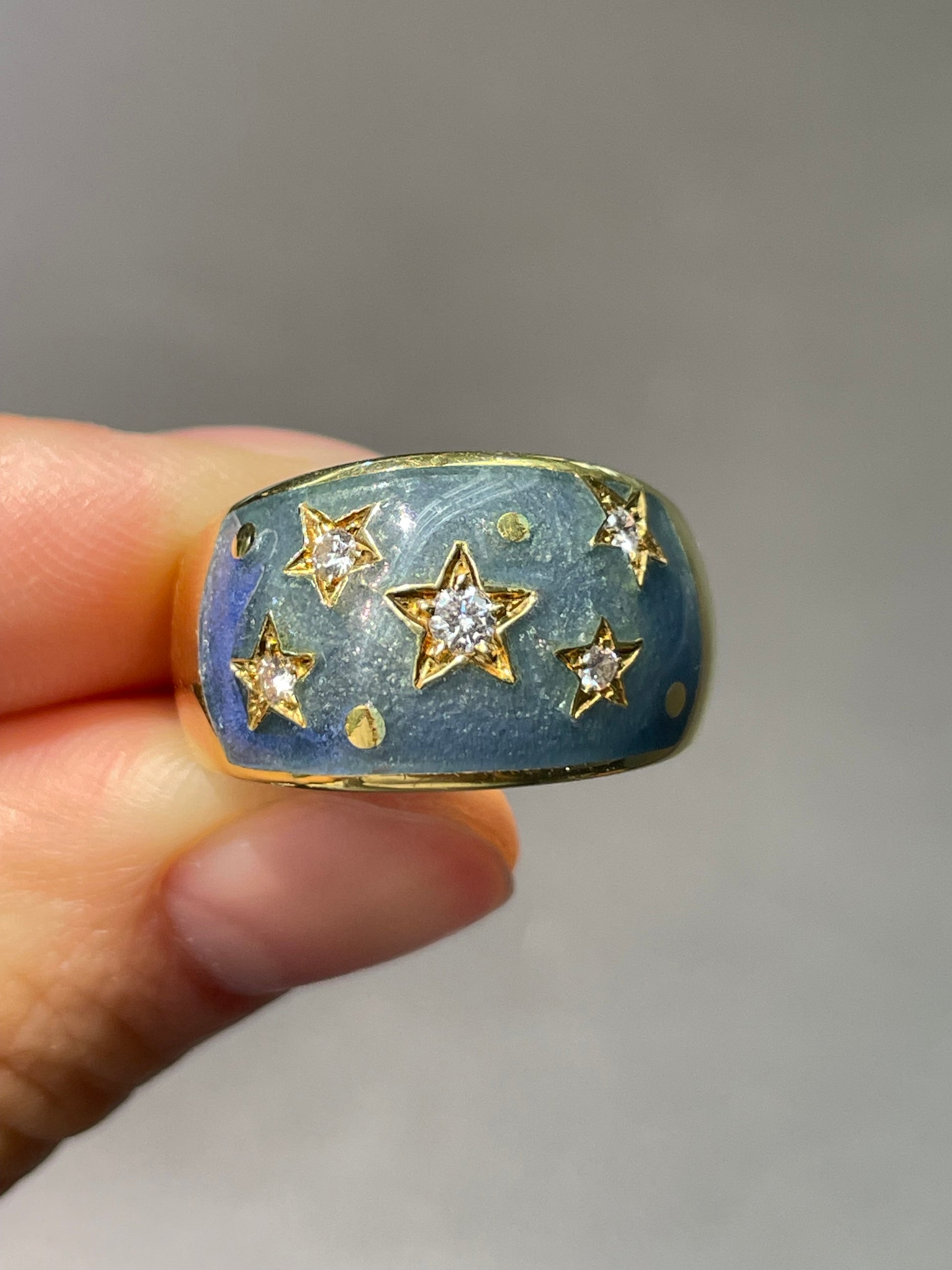 A timeless celestial 18K gold diamond star ring featuring 5 five-point stars set with sparkling white brilliant cut diamonds on a blue enamel backdrop.