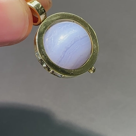 超酷的 18K 黄金宇宙旋转吊饰,中心有一颗旋转的蓝玛瑙珠!边缘侧面饰有口径切割和圆形切割黄玉。超酷的吊饰,可加入吊饰系列!