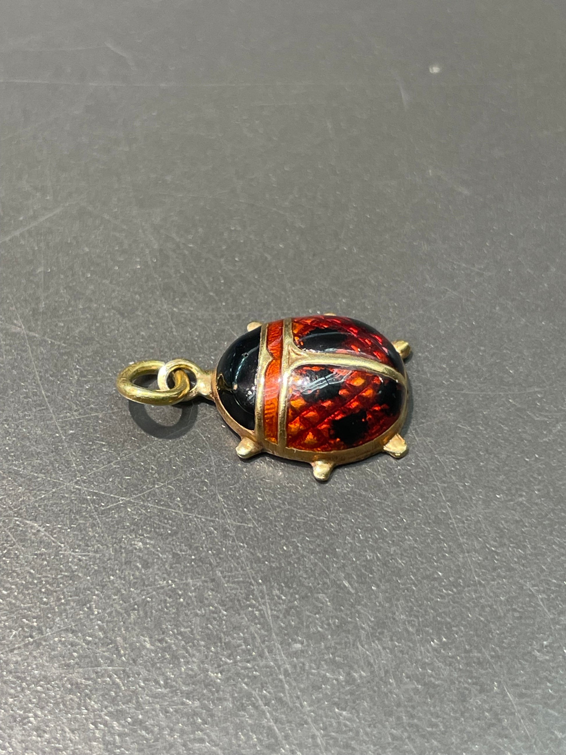 A lucky red enameled red lady bug charm crafted in 18K gold.
