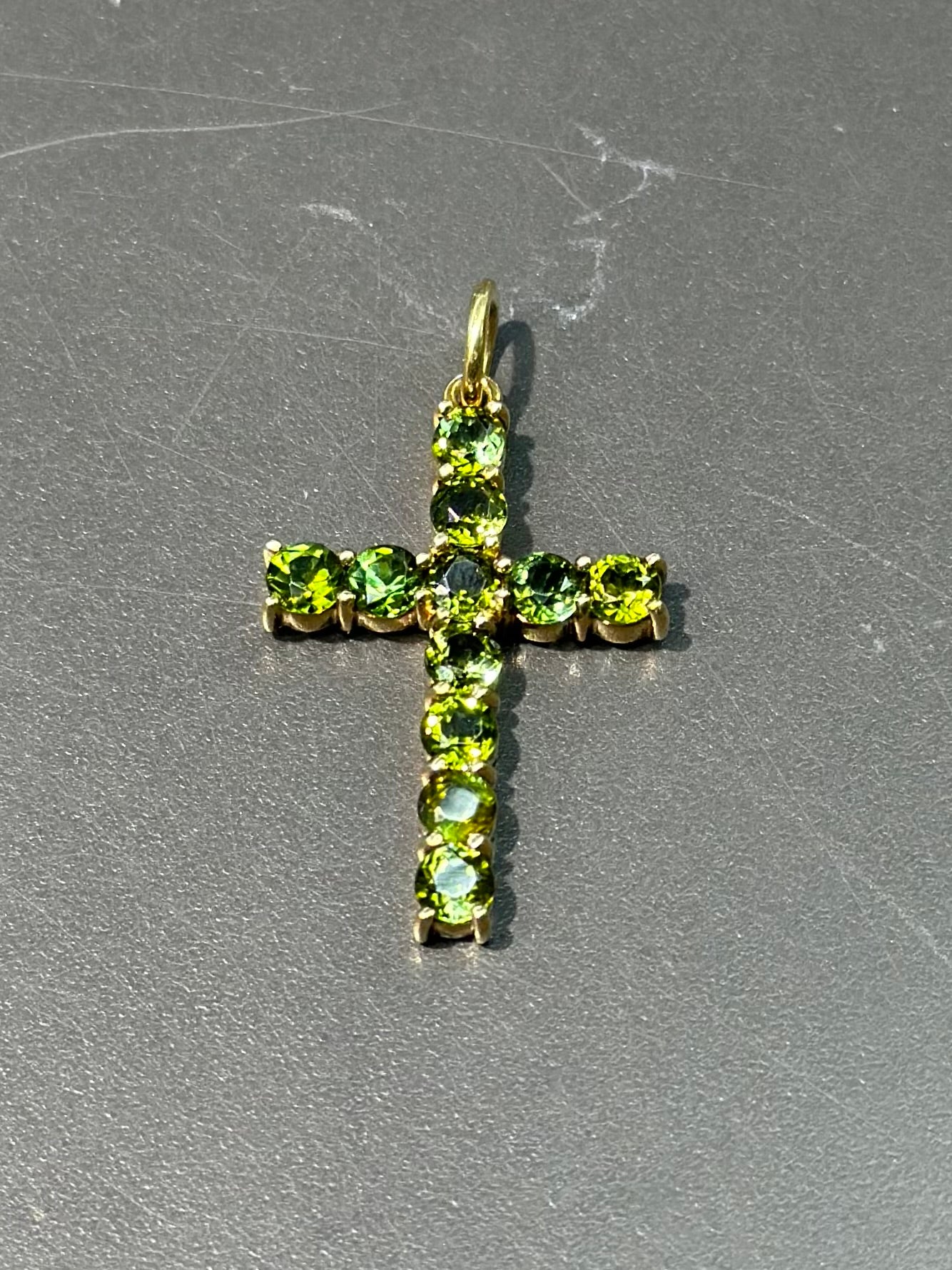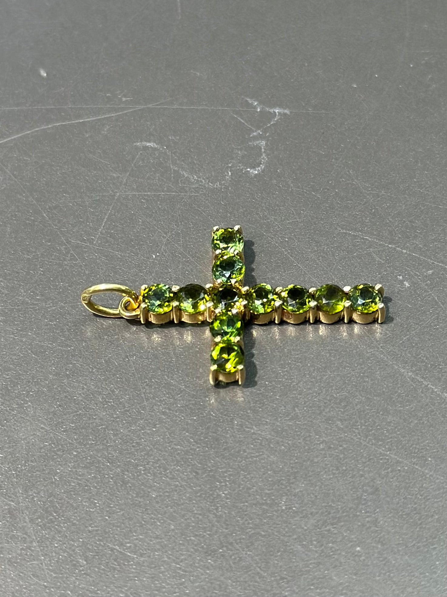 闪闪发光的十字架吊坠,饰有闪亮的多汁绿色橄榄石。