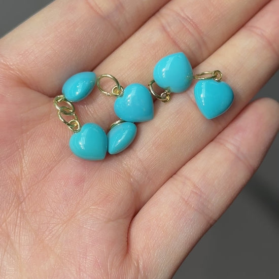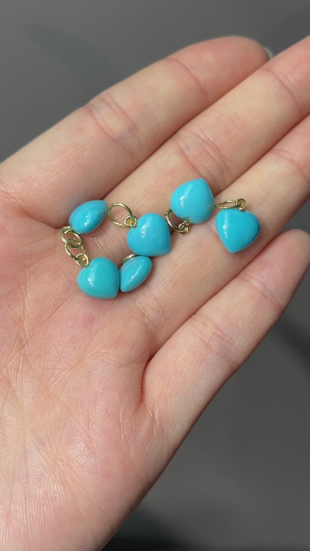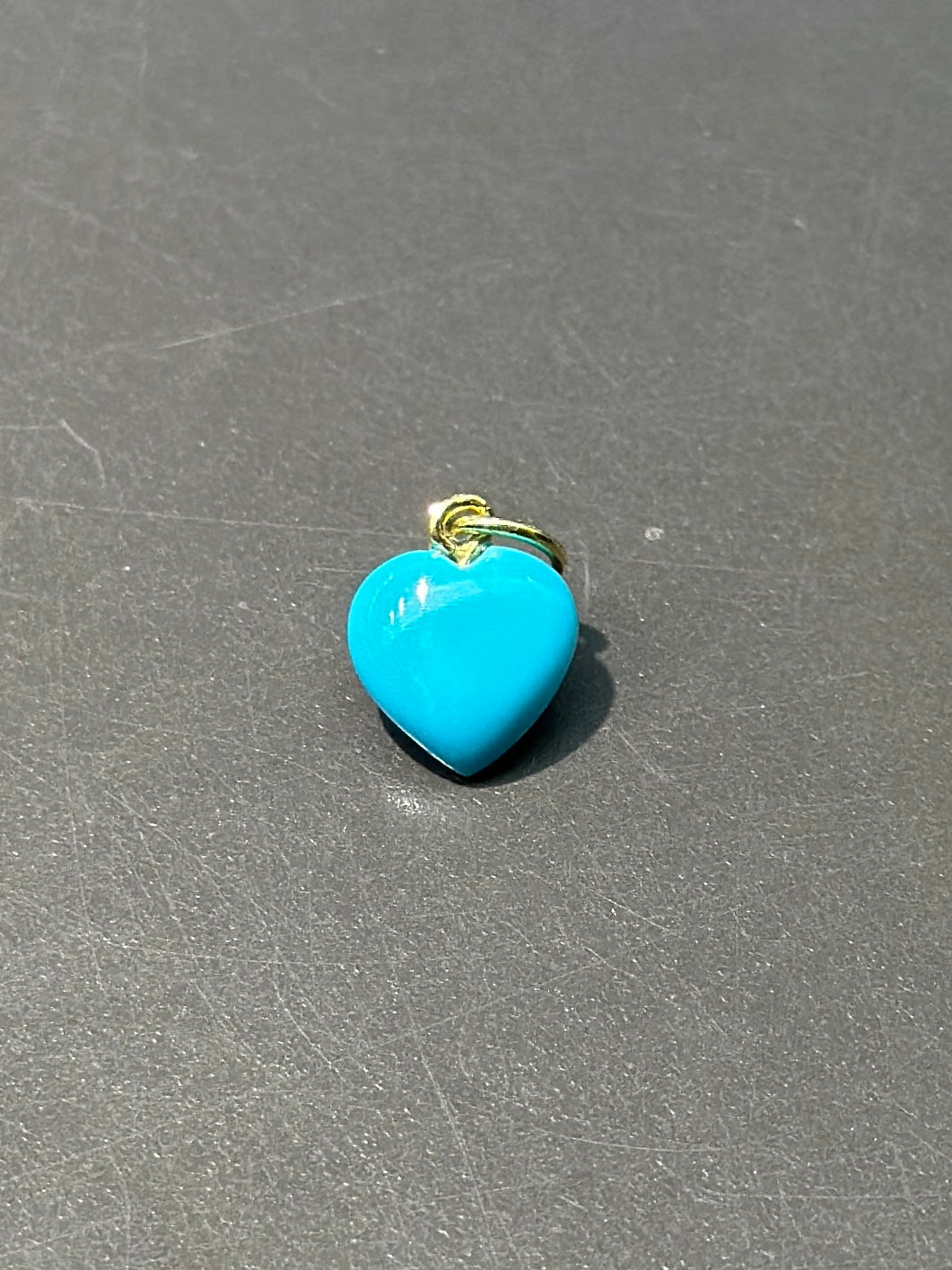 一颗鲜艳的知更鸟蛋蓝色绿松石心形绿松石,配以 18K 金吊环。