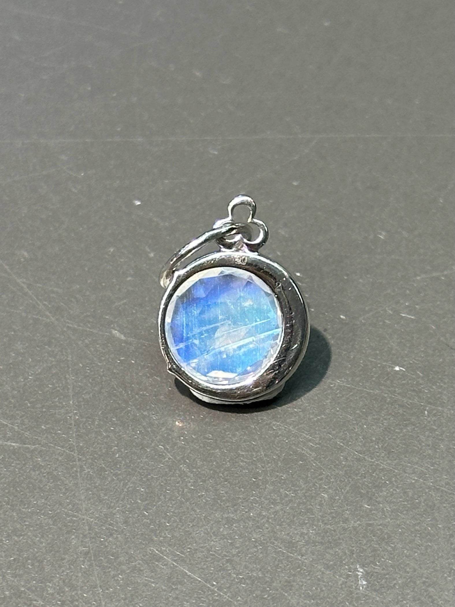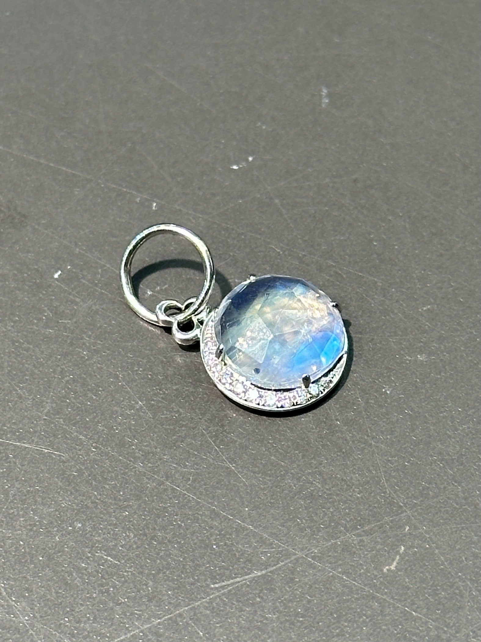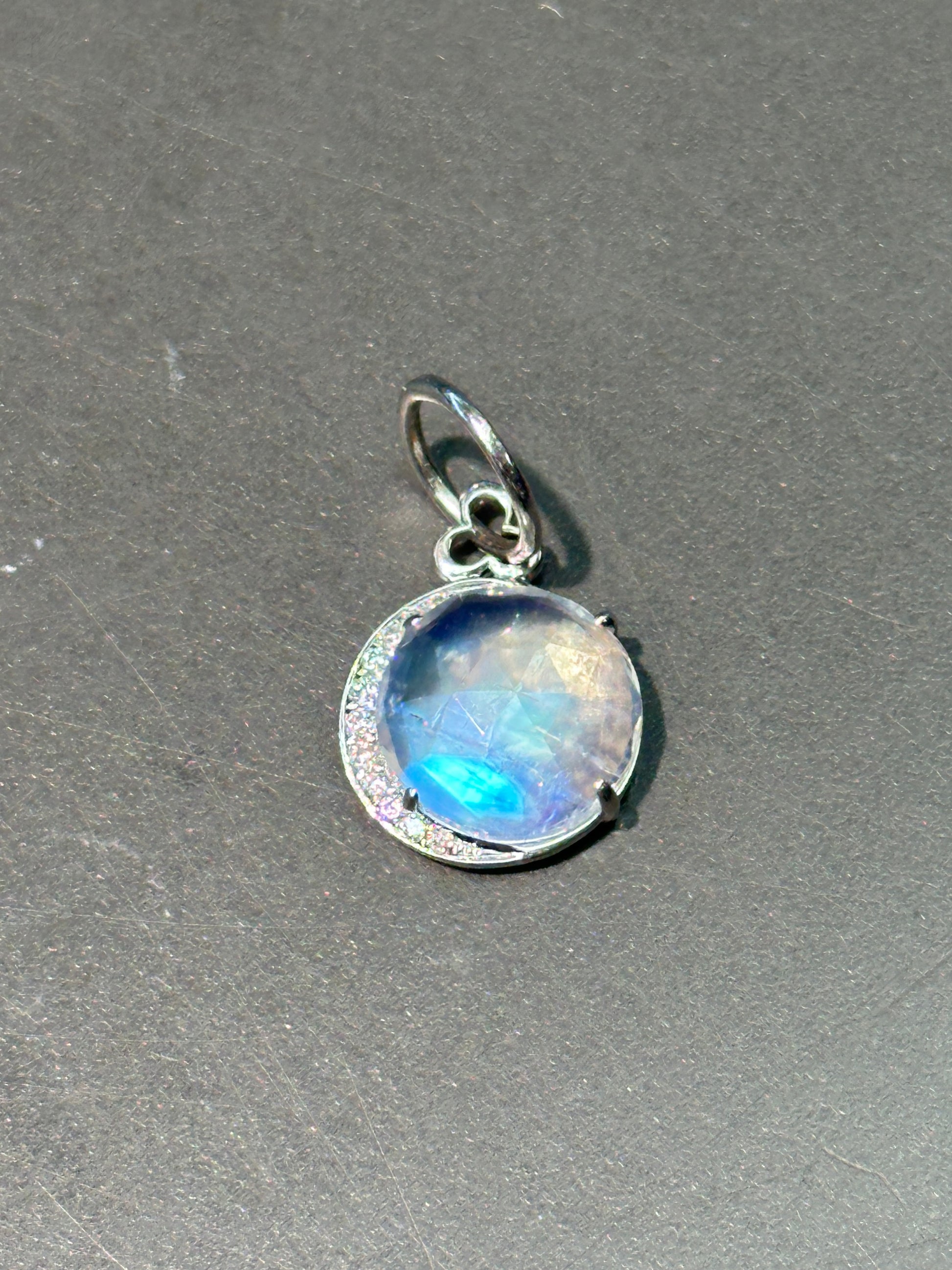 一款异想天开的 18K 白金天体吊坠,饰有迷人的多面月光石,散发着迷人的蓝色光泽。这颗明亮的宝石镶嵌在吊坠的中心,侧面饰有精致的新月,新月上镶嵌着明亮式切割的白色钻石,增添了一丝优雅和光芒,完美衬托出月光石的空灵光芒!