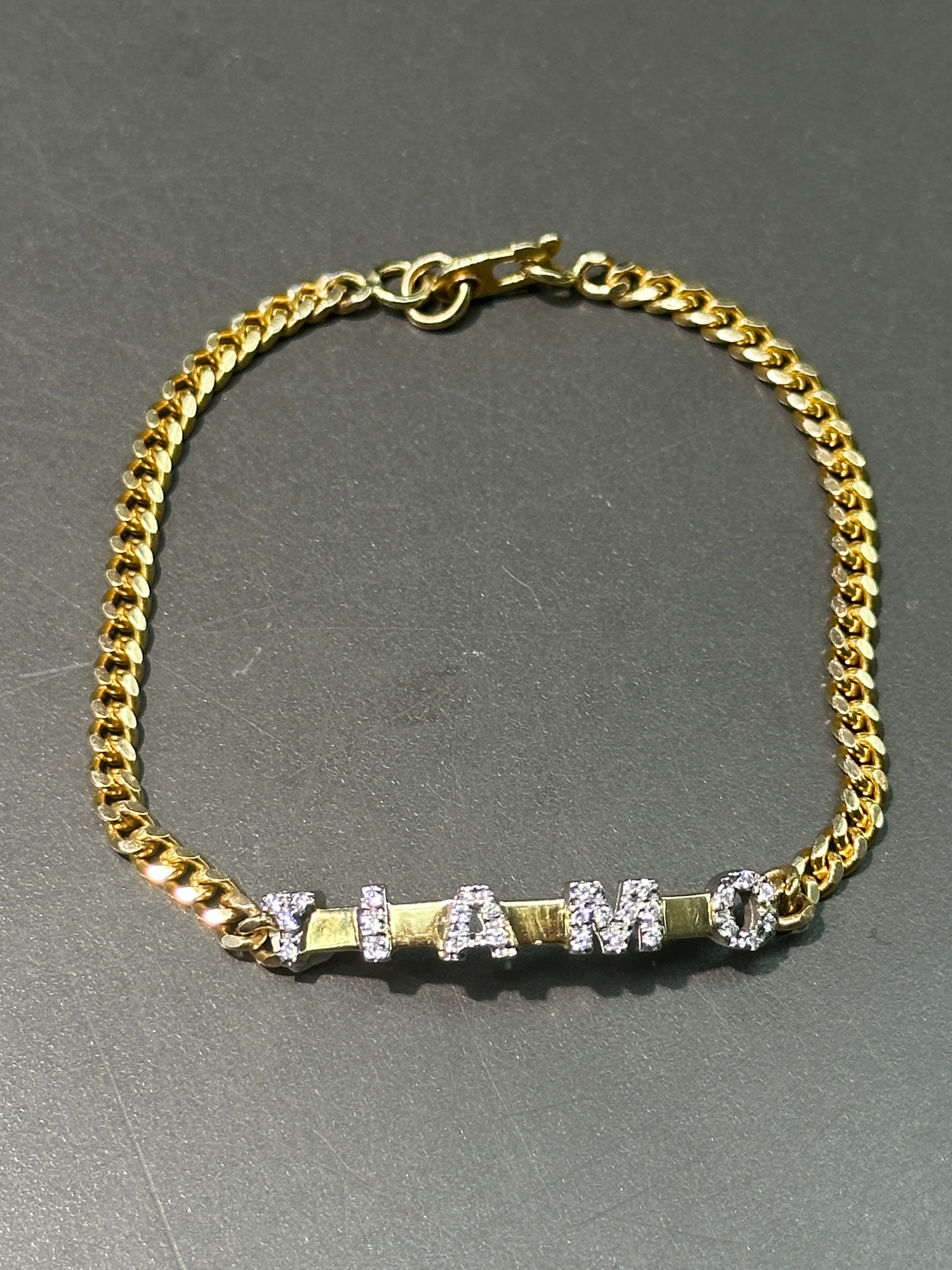 这款令人惊叹的 18K 黄金钻石 Ti Amo 链环手链采用经典链环设计,中间饰有闪亮钻石镶嵌的“Ti Amo”字样。这款优雅的手链采用奢华的 18K 黄金打造而成,将永恒的设计和真挚的爱情讯息融为一体。