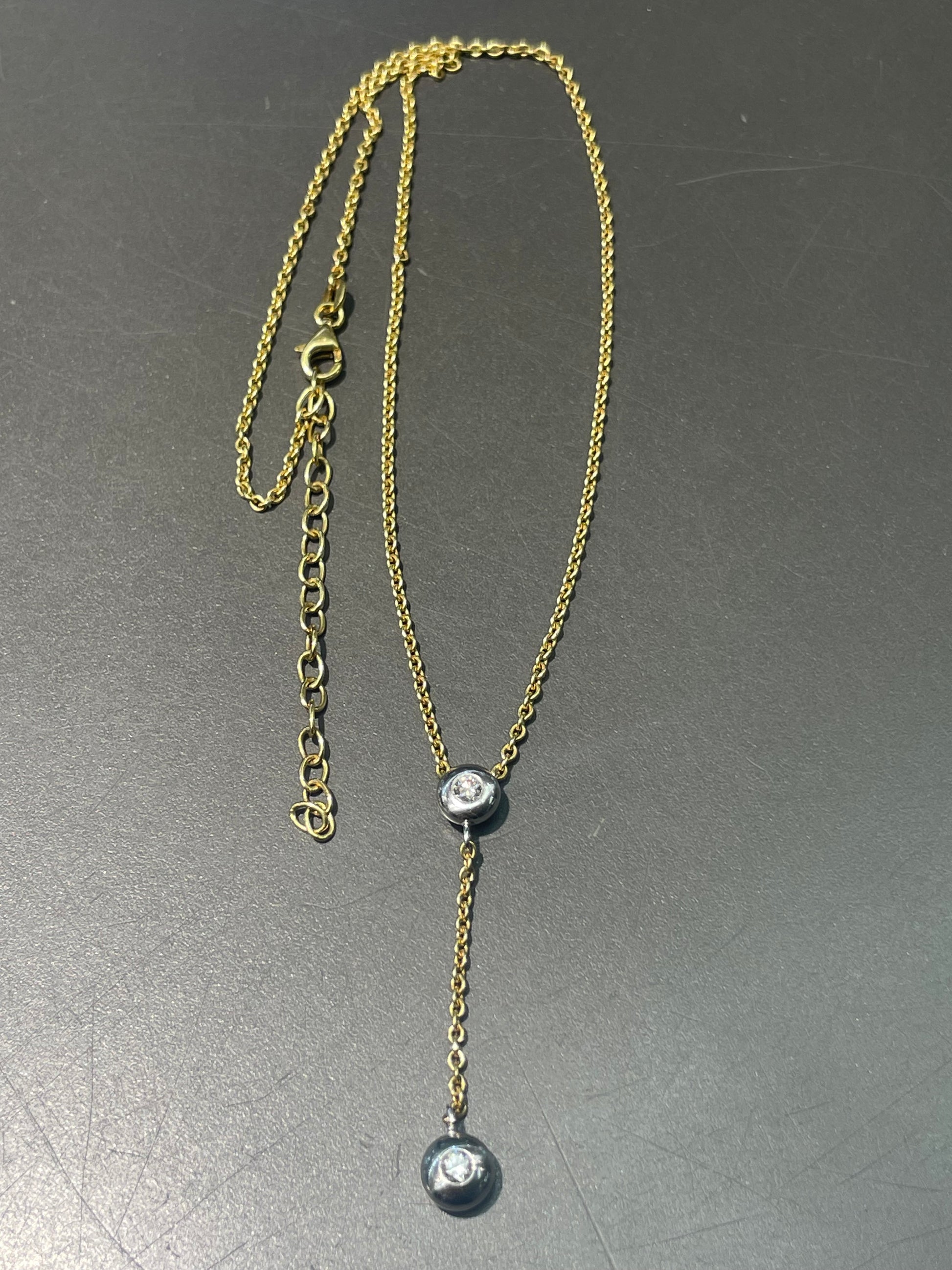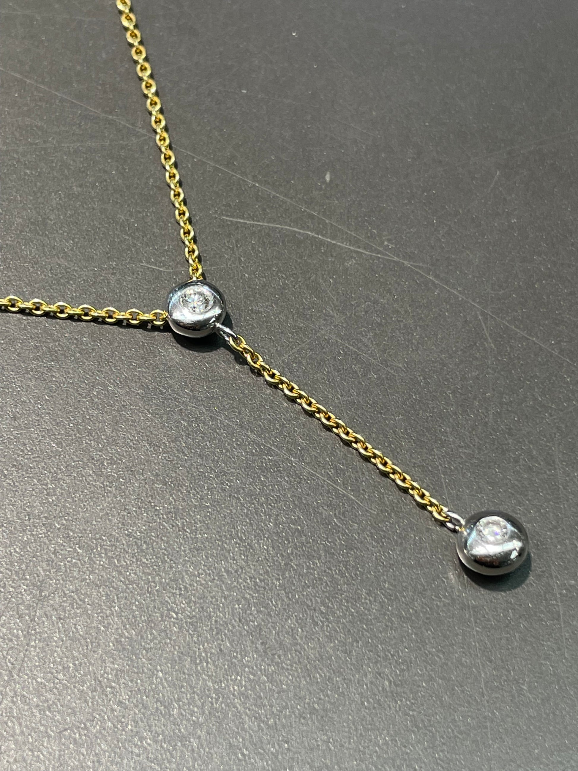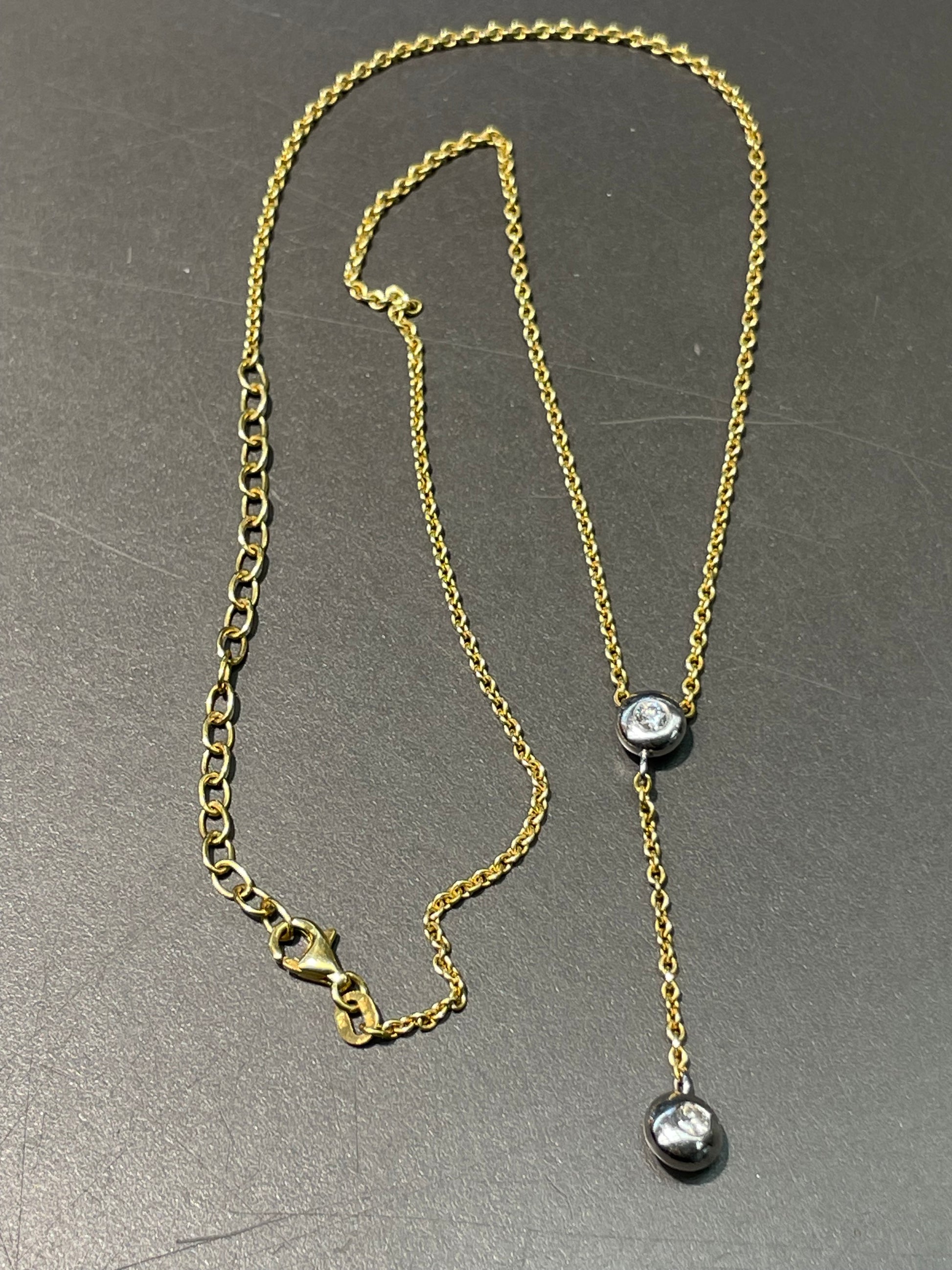 A timeless and elegant 18K gold lariat necklace featuring three round brilliant-cut diamonds, each bezel-set and weighing approximately 0.15 carats (VS clarity, G color). These dazzling diamonds gracefully shimmer along the neckline. The bottom droplet is accented with additional diamonds on both sides of the drop, adding extra sparkle and charm. Perfect worn solo or layered with your favorite pieces!