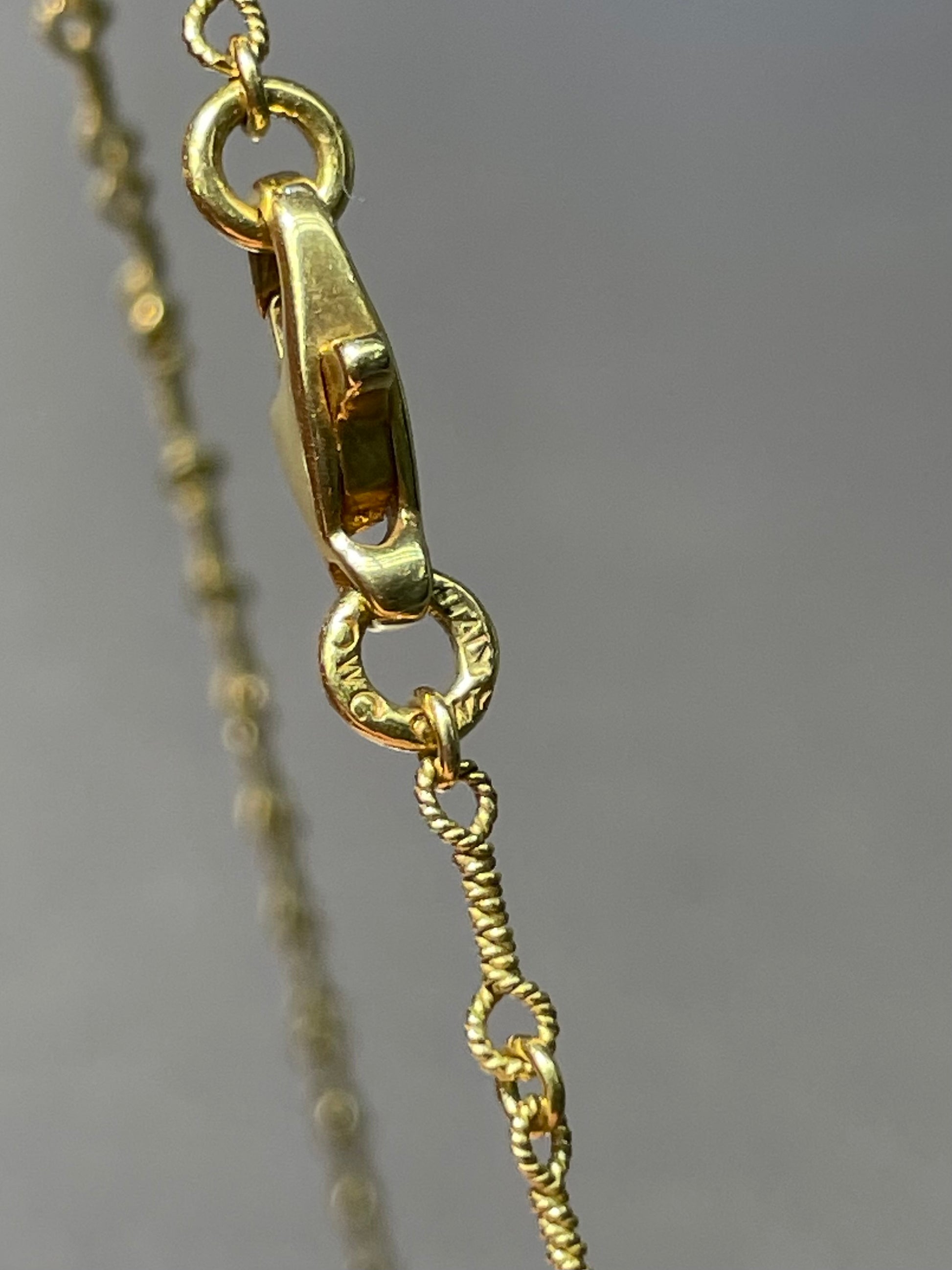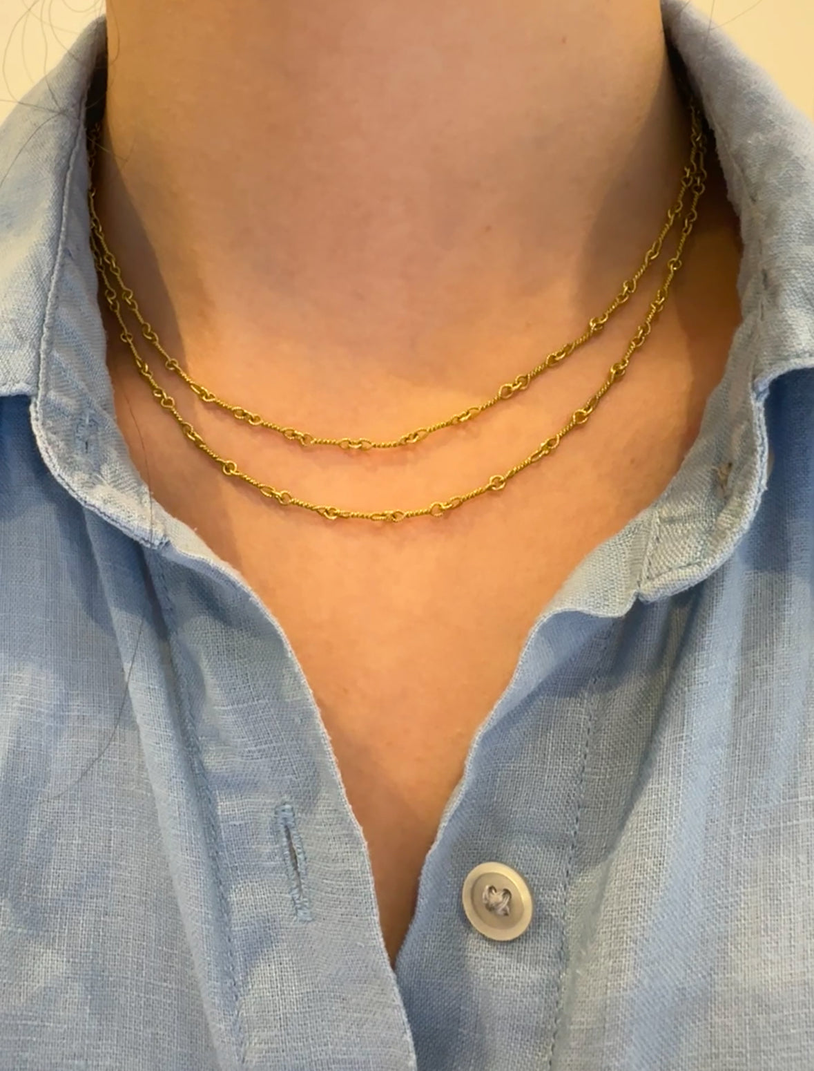 This gorgeous Italian 18K yellow gold twisted link chain necklace is hand-twisted from gold wiring, giving a beautiful a rope-like texture. It’s perfect to wear on its own for a sleek look or layered with other necklaces for a bit of extra shine!