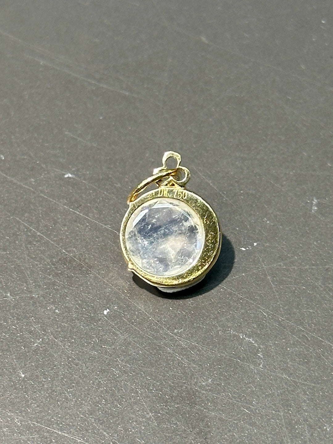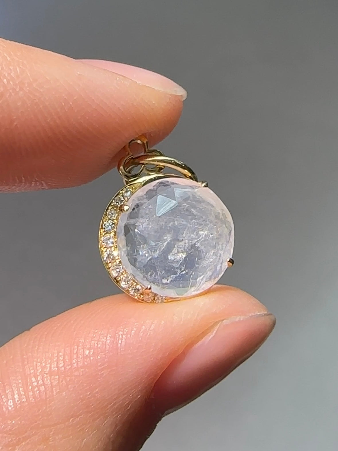 一款异想天开的 18K 黄金天体吊坠,饰有迷人的多面月光石,散发着迷人的蓝色光泽。这颗明亮的宝石镶嵌在吊坠的中心,侧面饰有精致的新月,新月上镶嵌着明亮式切割的白色钻石,增添了一丝优雅和光芒,完美衬托出月光石的空灵光芒!