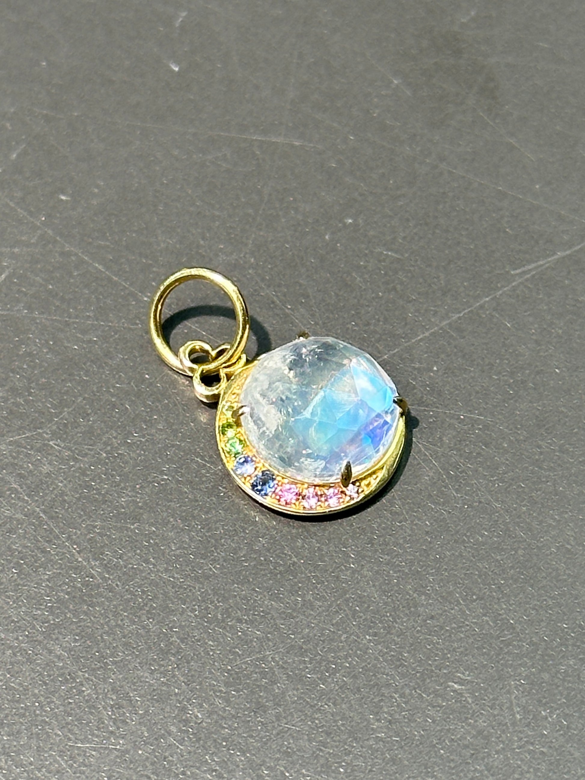 一款异想天开的 18K 黄金天体吊坠,饰有迷人的多面月光石,散发着迷人的蓝色光泽。这颗发光的宝石镶嵌在吊坠的中心,侧面饰有精致的新月,新月上闪耀着 8 颗天然鲜艳蓝宝石,展现出彩虹般的全光谱,增添了一丝优雅和光芒,完美衬托出月光石的空灵光芒!