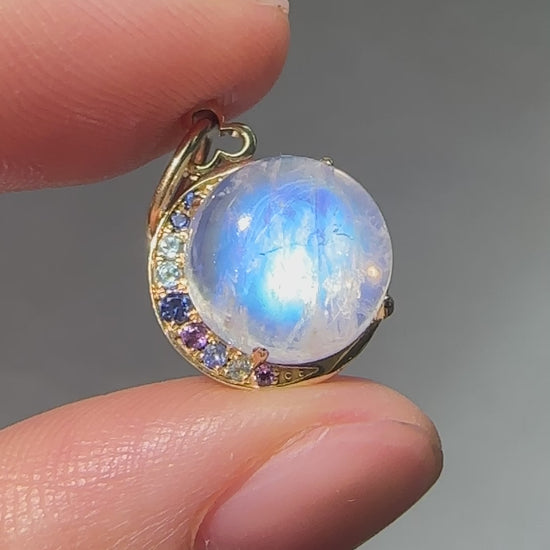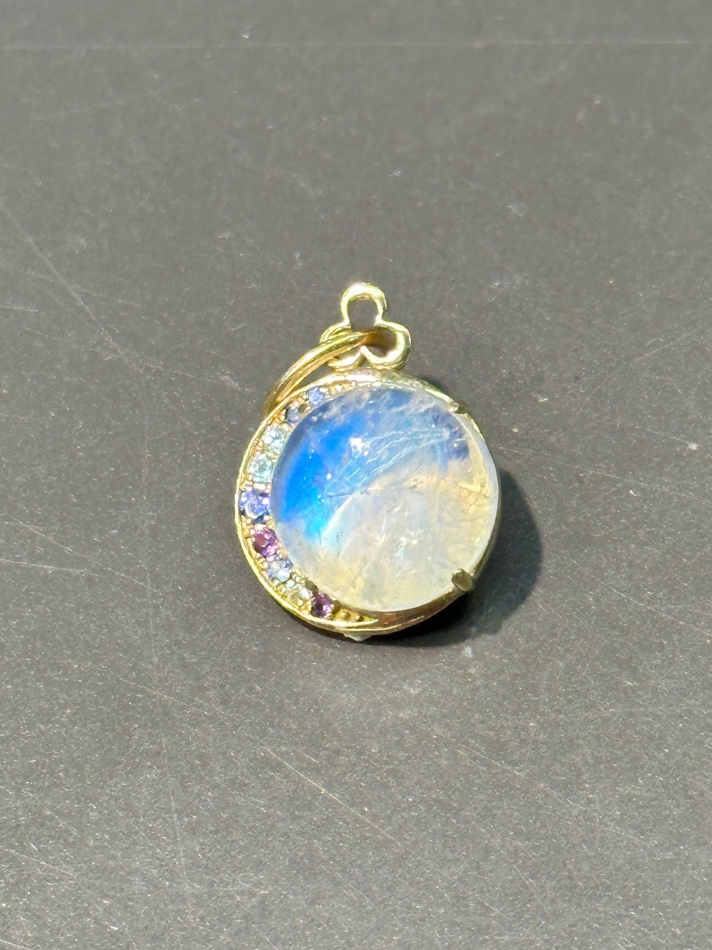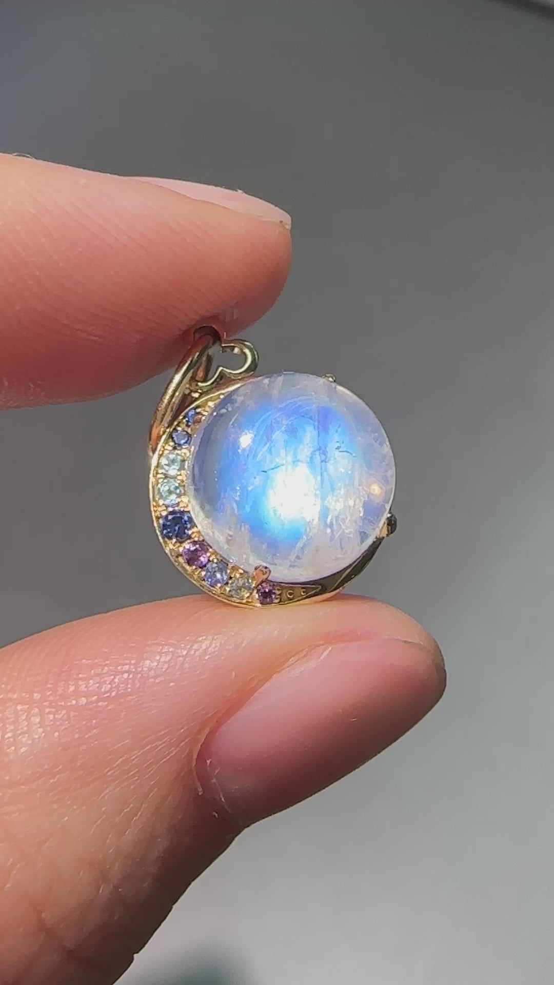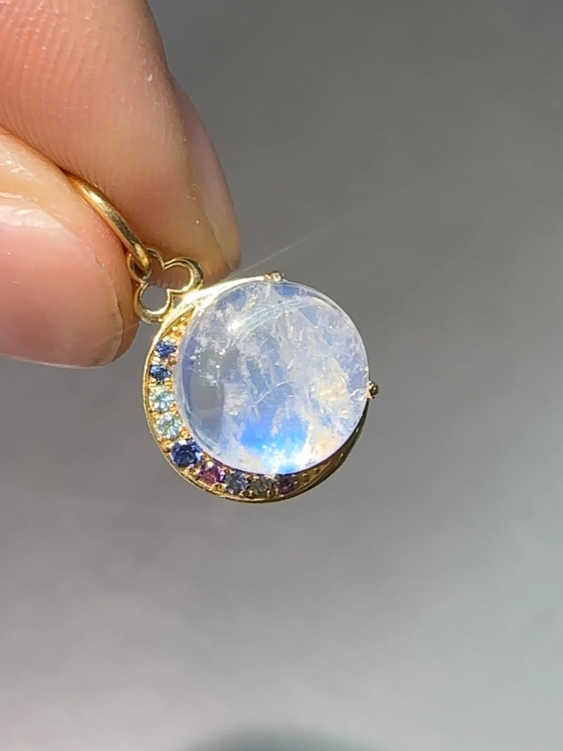 一款异想天开的 18K 黄金天体吊坠,饰有迷人的月光石,散发着迷人的蓝色光泽。这颗发光的宝石镶嵌在吊坠的中心,侧面饰有精致的新月,新月上闪耀着 8 颗天然鲜艳蓝宝石,呈现出彩虹般的光谱,增添了一丝优雅和光芒,完美衬托出月光石的空灵光芒!