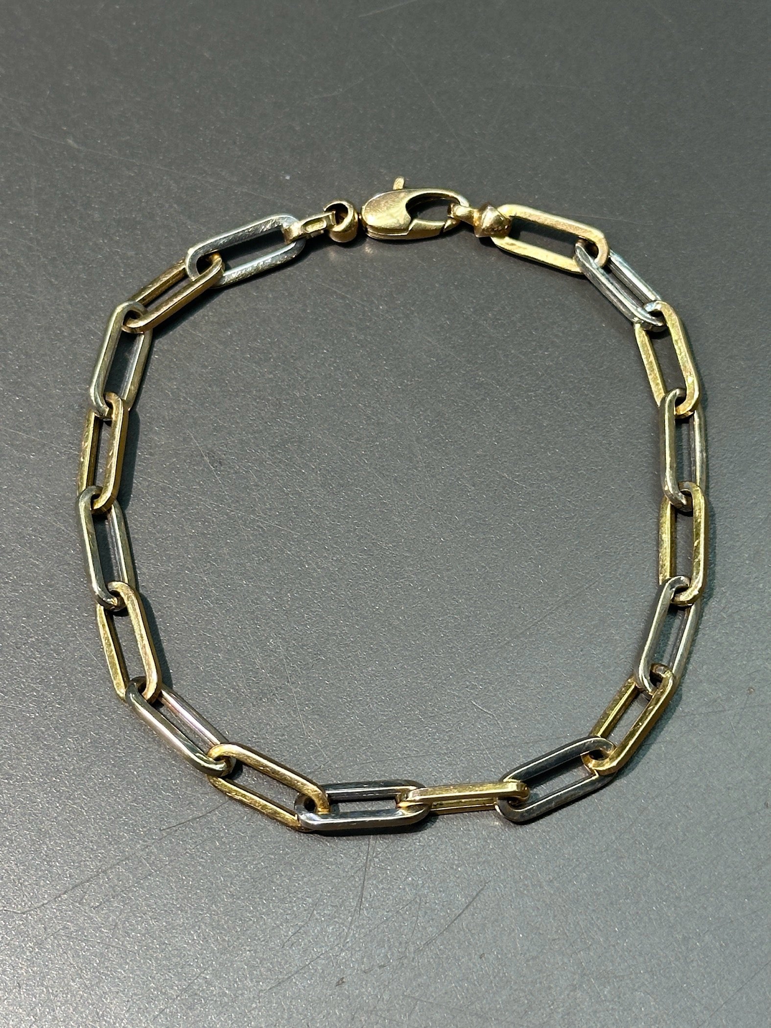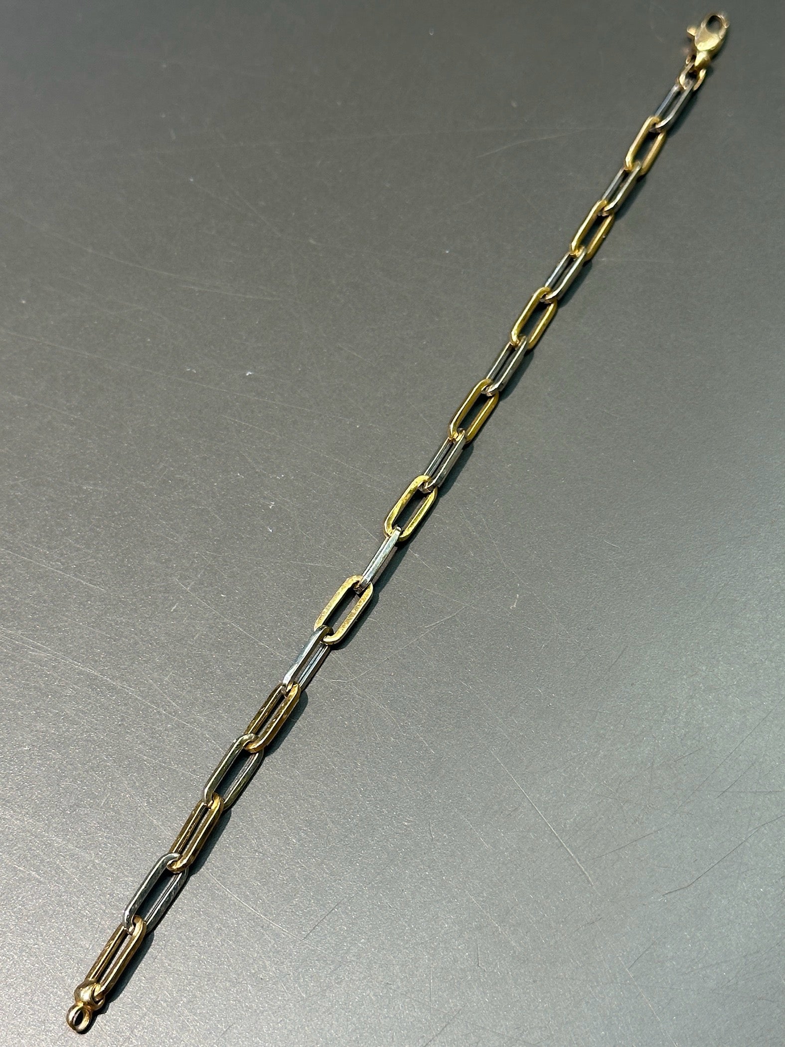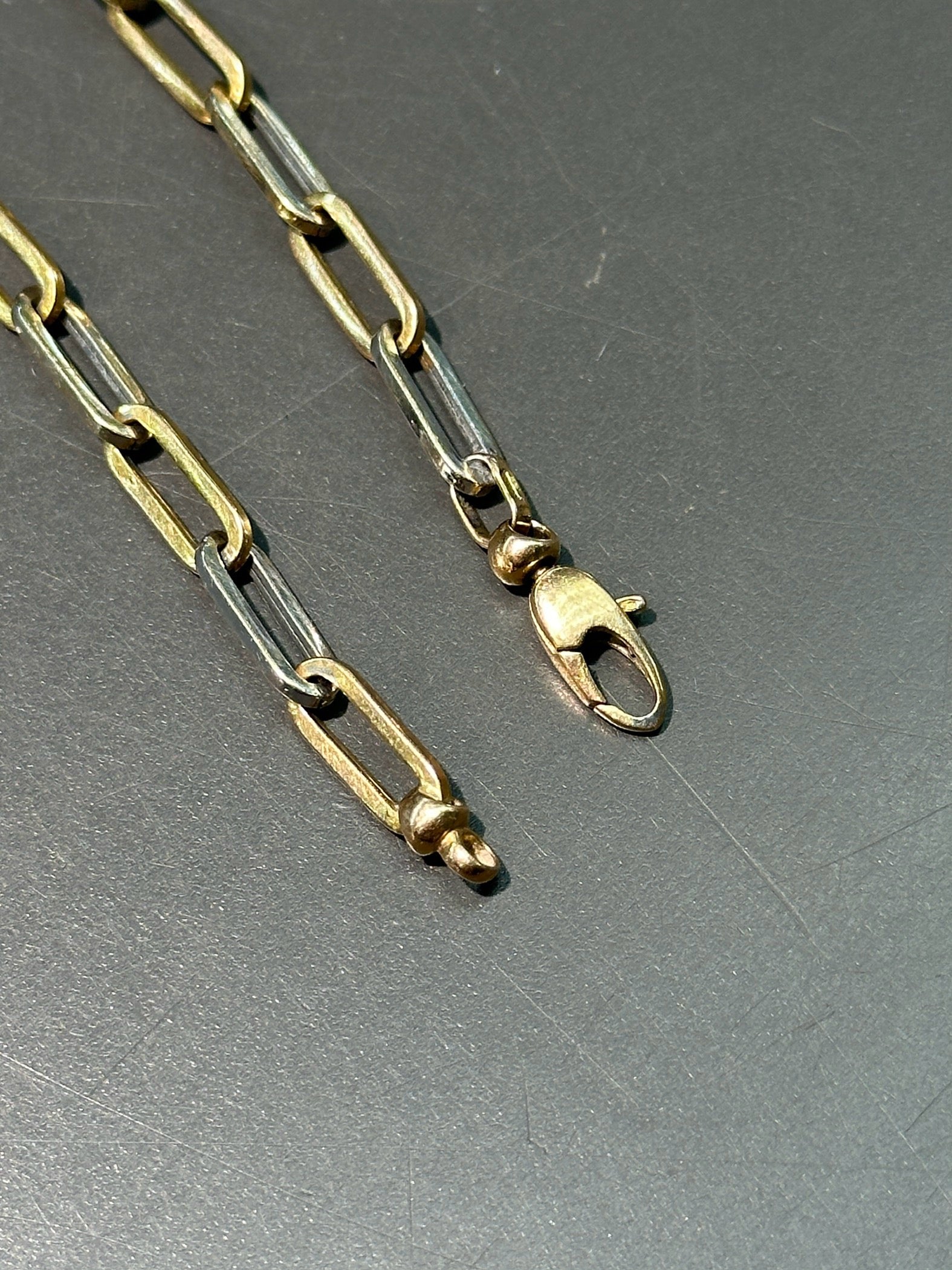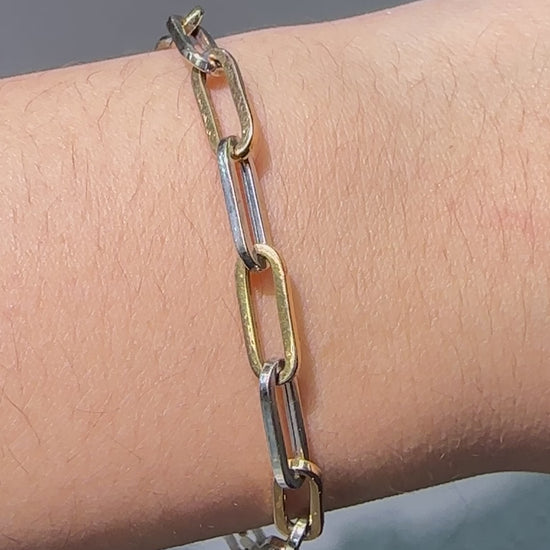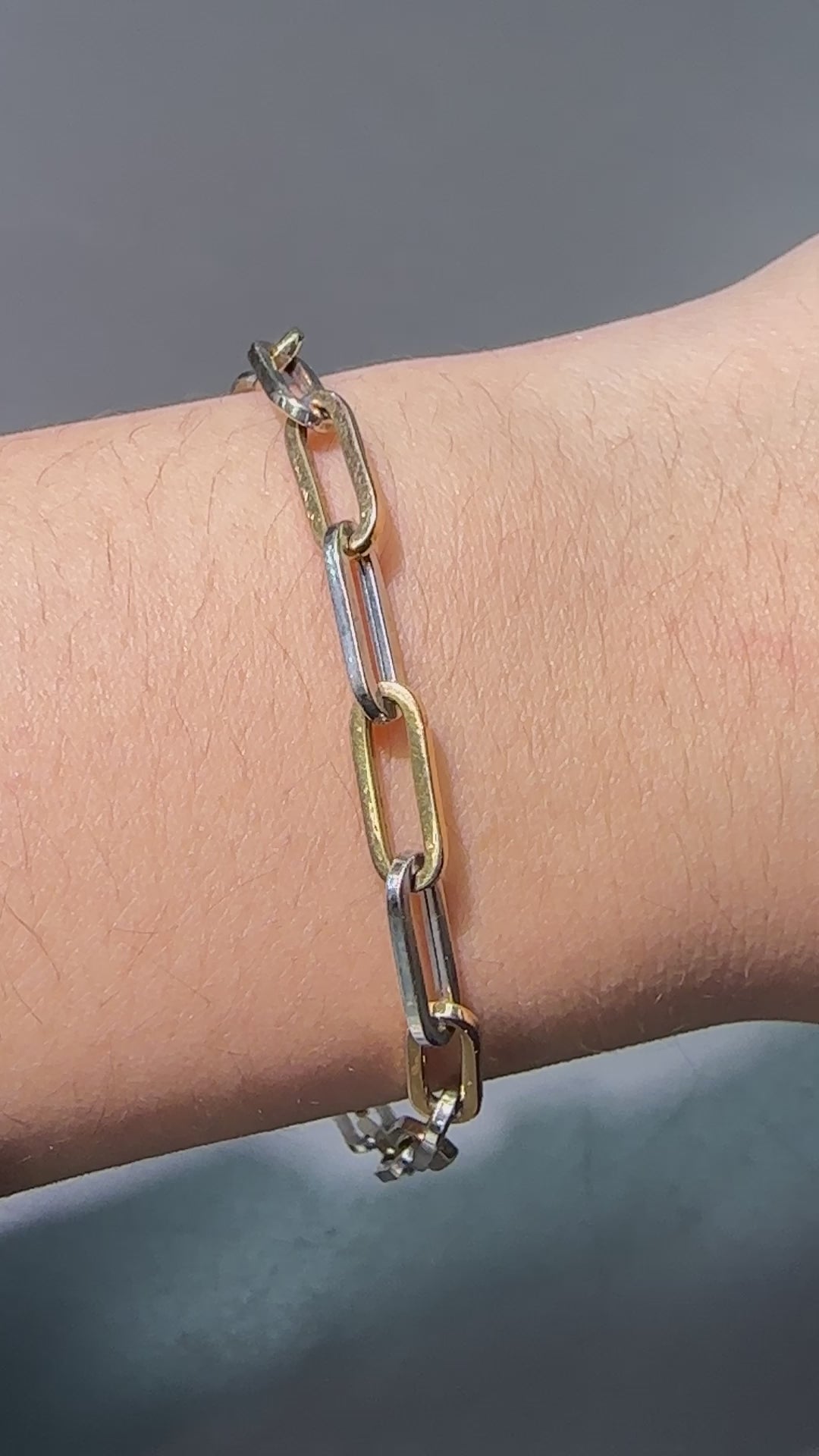 双色回形针链手链,采用 18K 黄金和白金打造,带有空心回形针链环。