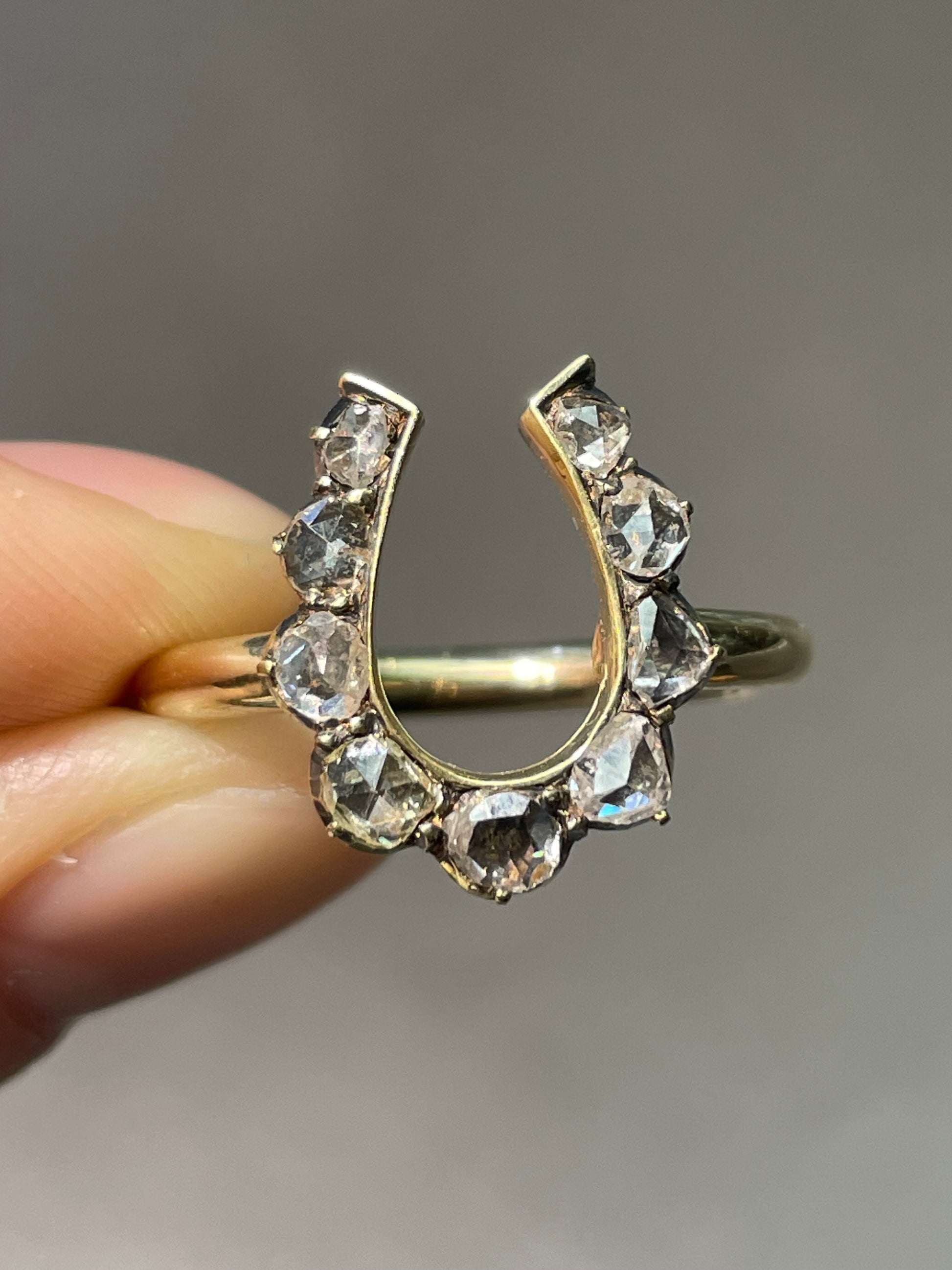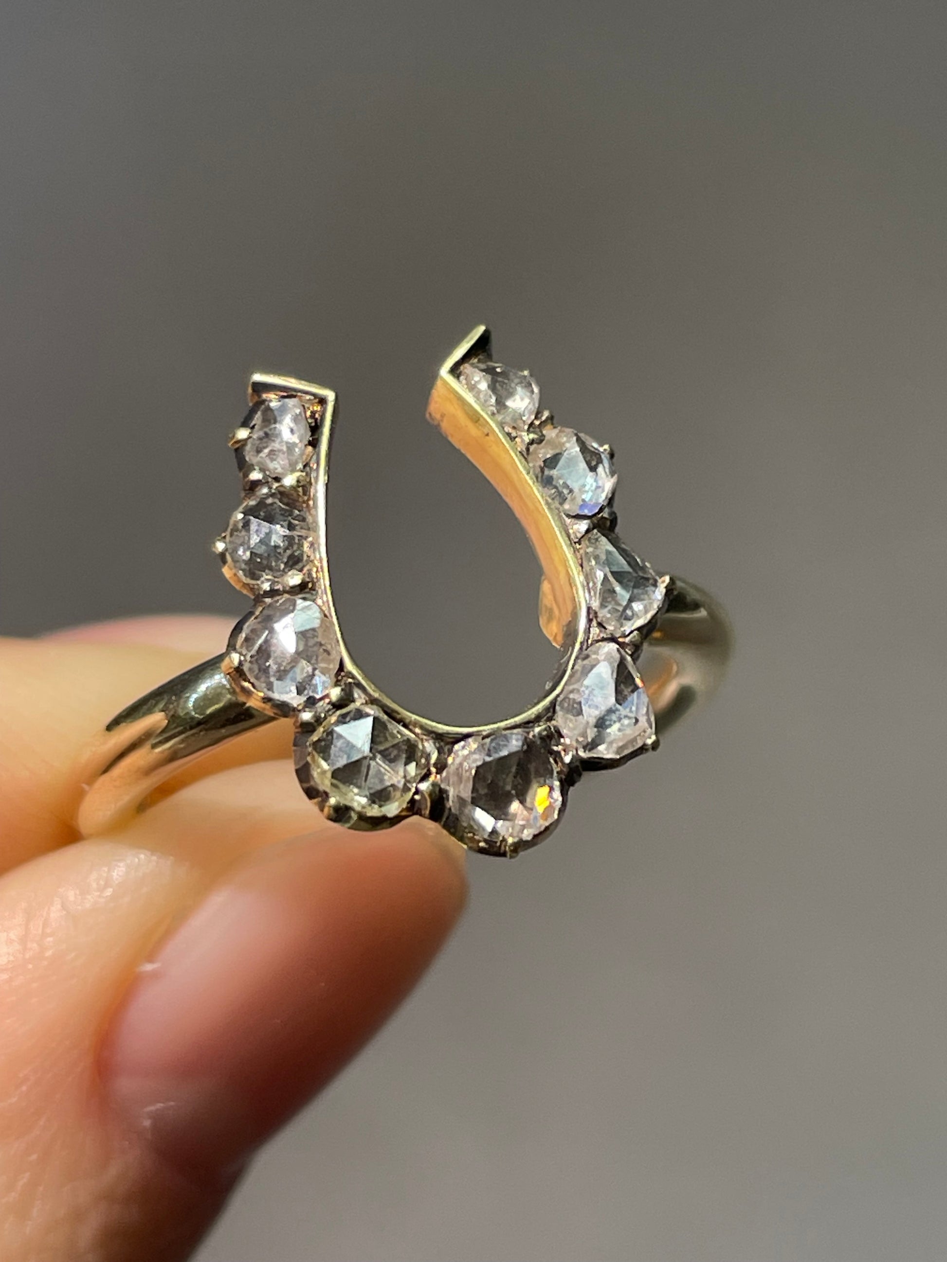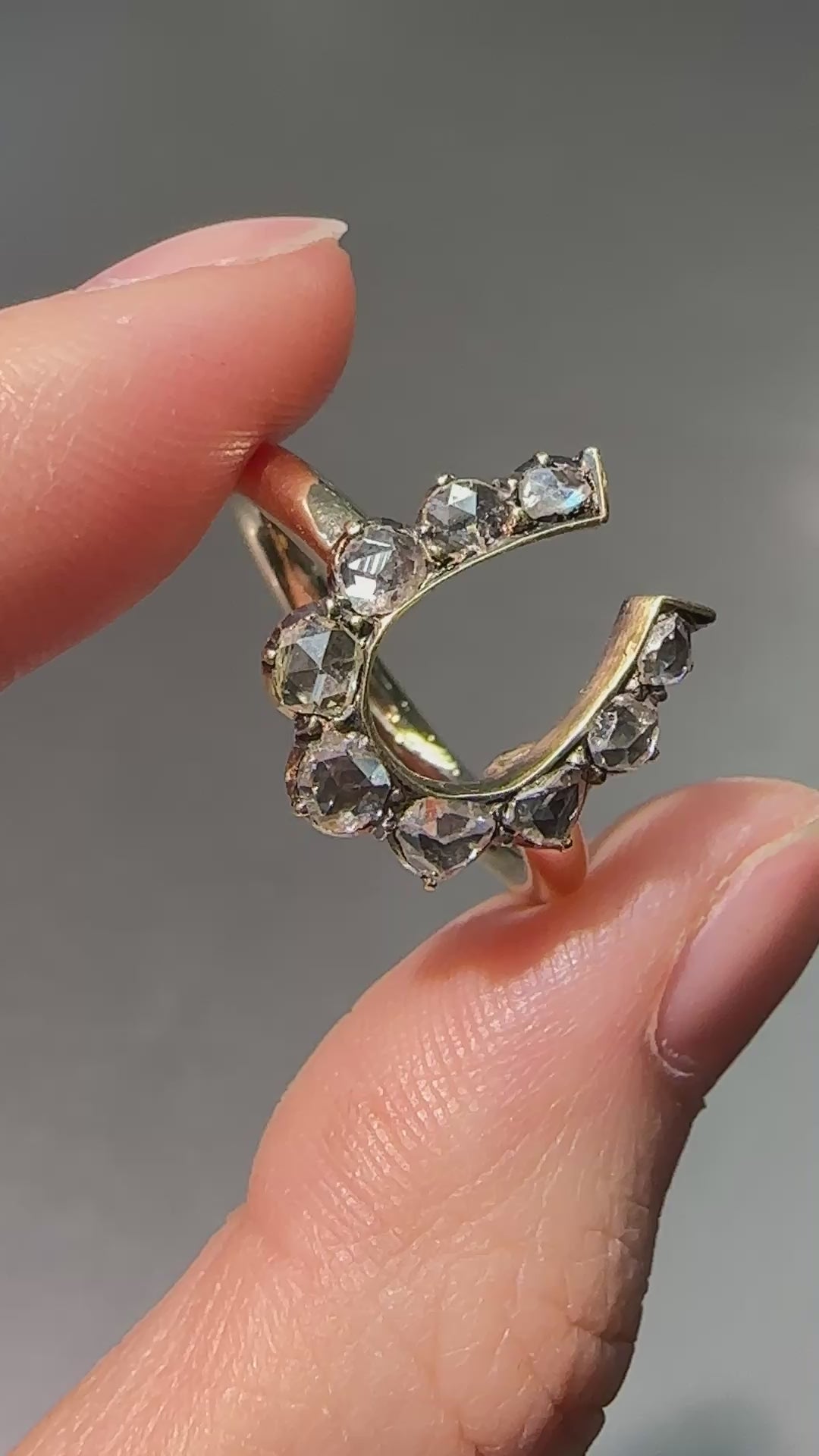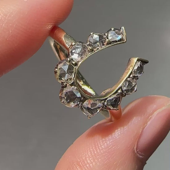 这款异想天开、迷人的古董马蹄形戒指采用 14K 黄金打造而成,镶有九颗闪闪发光的玫瑰切割钻石,排列成经典的马蹄形,共重 0.9 克拉(SI 净度、H 颜色)。这是一款真正的宝石,值得加入戒指收藏!