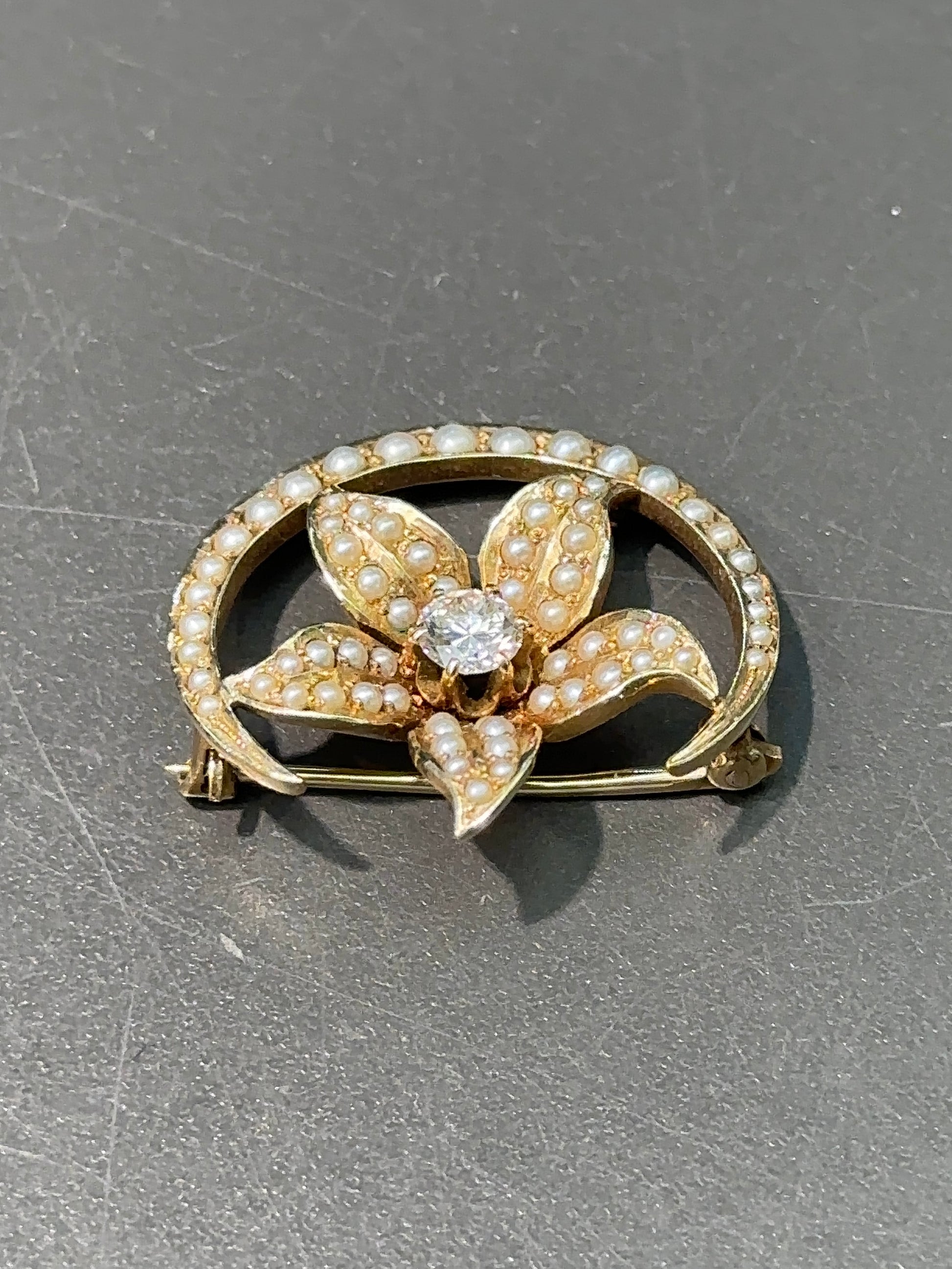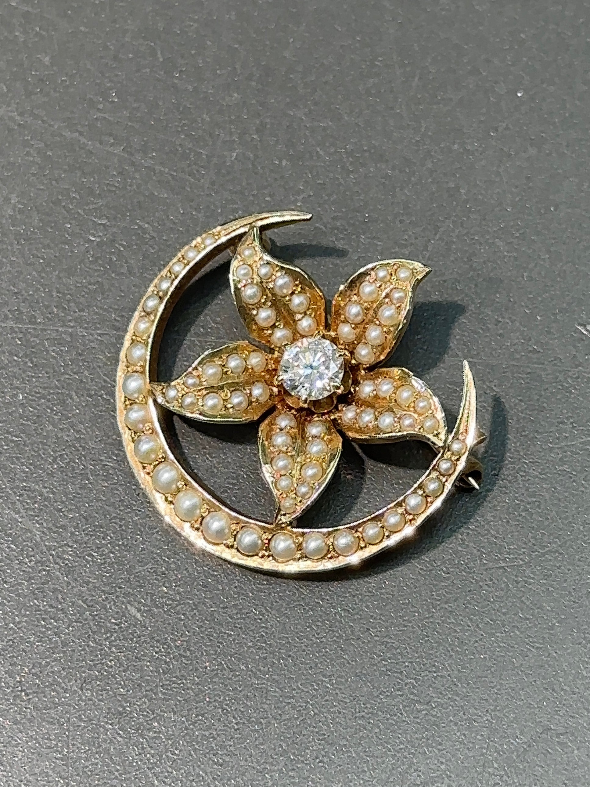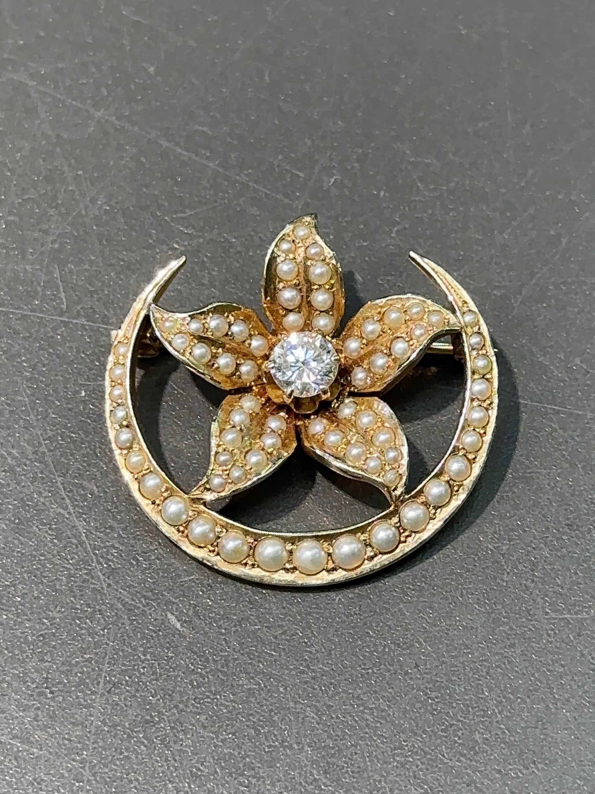 这枚天体胸针多么梦幻!一朵月牙盛开的百合花上密镶着细小的乳白色珍珠。百合花的中心镶嵌着一颗 0.35 克拉的闪亮白钻。
