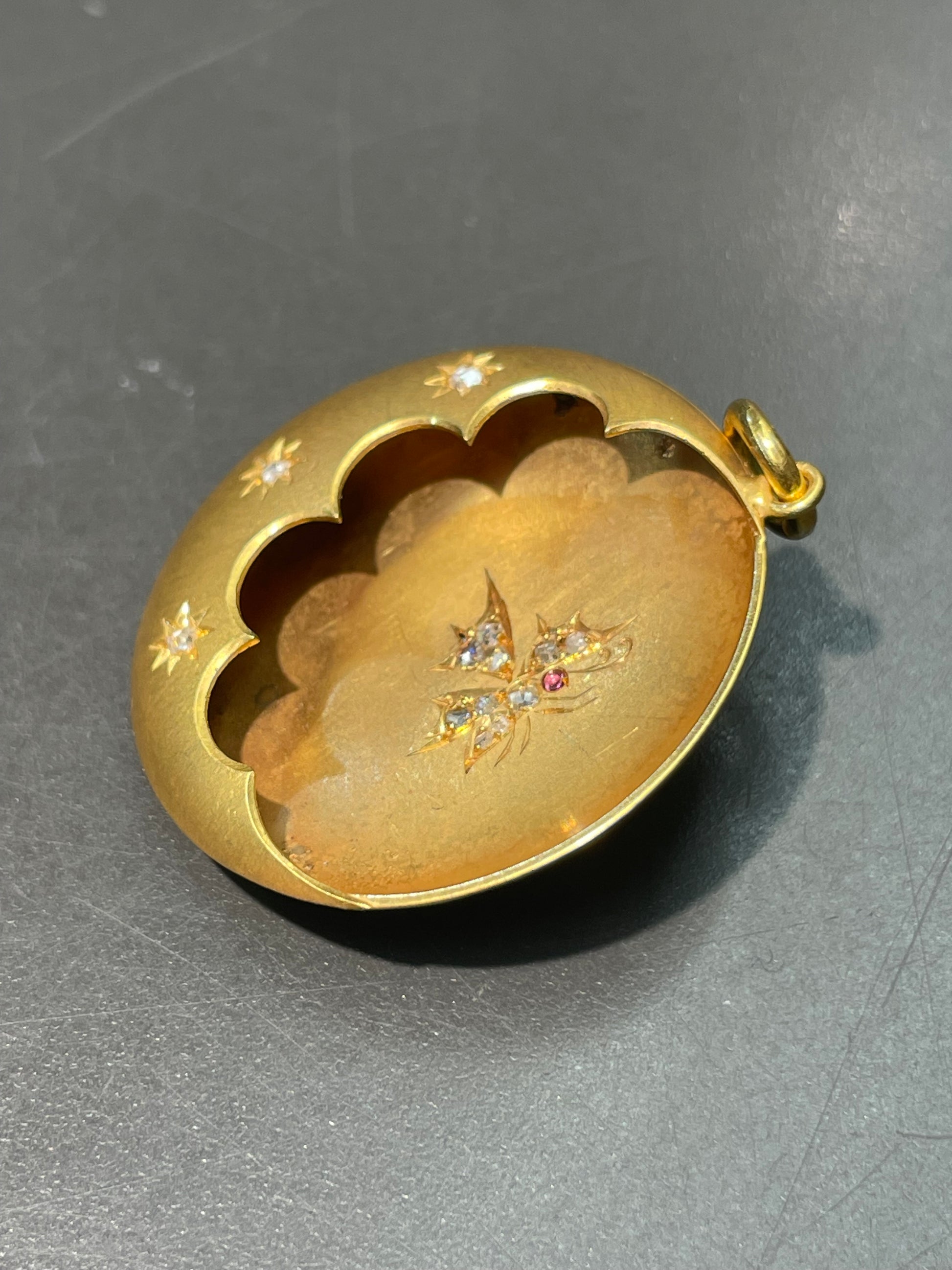 这款精美的维多利亚时代新月吊坠采用 14K 金精心打造而成。在它的中心,一只精致的白色蝴蝶闪闪发光,镶嵌着闪闪发光的玫瑰式切割钻石和一颗鲜艳的凸圆形红宝石。新月的侧面饰有星芒细节,增强了它的天体魅力!一件令人惊叹的作品,捕捉了维多利亚时代的美丽和象征意义!