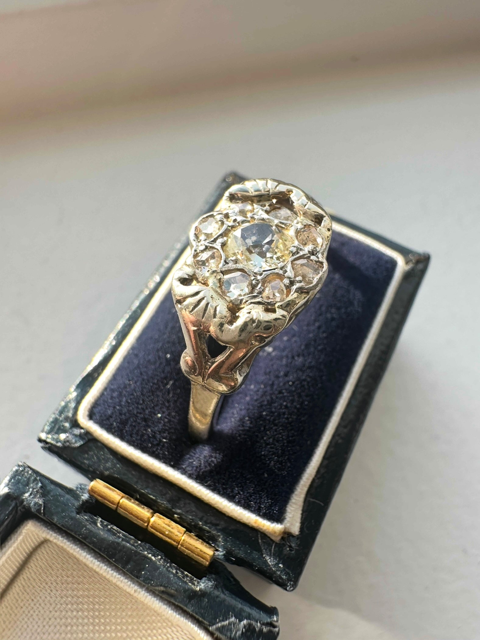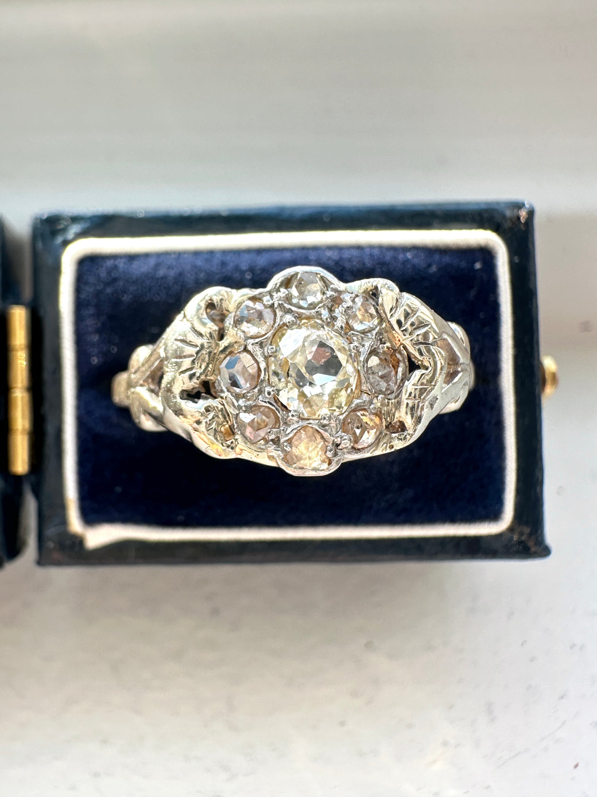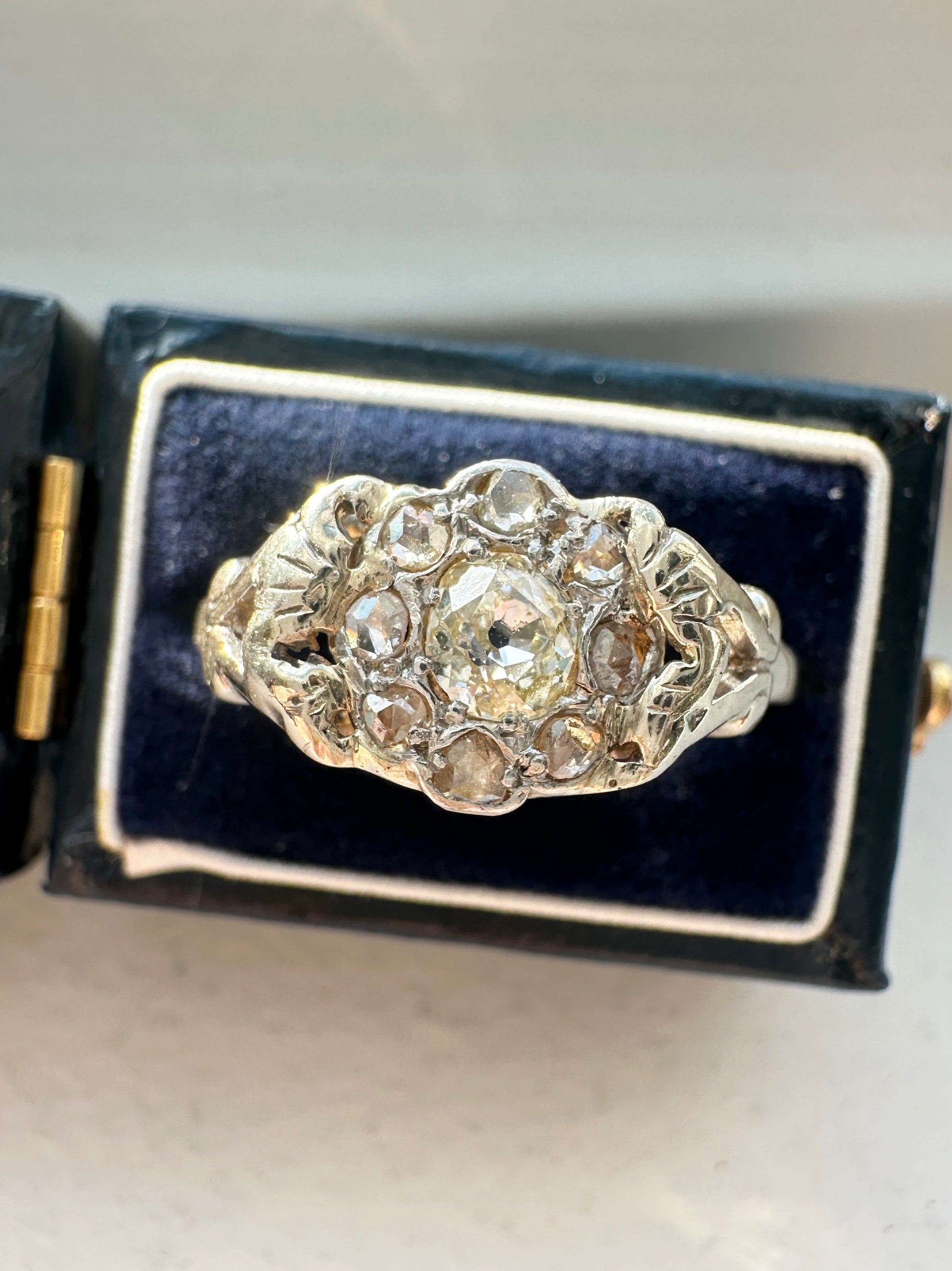 这款精致的古董 14K 金钻石花簇戒指镶有一颗 0.38 克拉的璀璨老矿切割钻石,周围环绕着 6 颗闪亮的白玫瑰切割钻石,总重 0.24 克拉。侧面饰有图案。目前尺寸为 5.75,可调整大小。