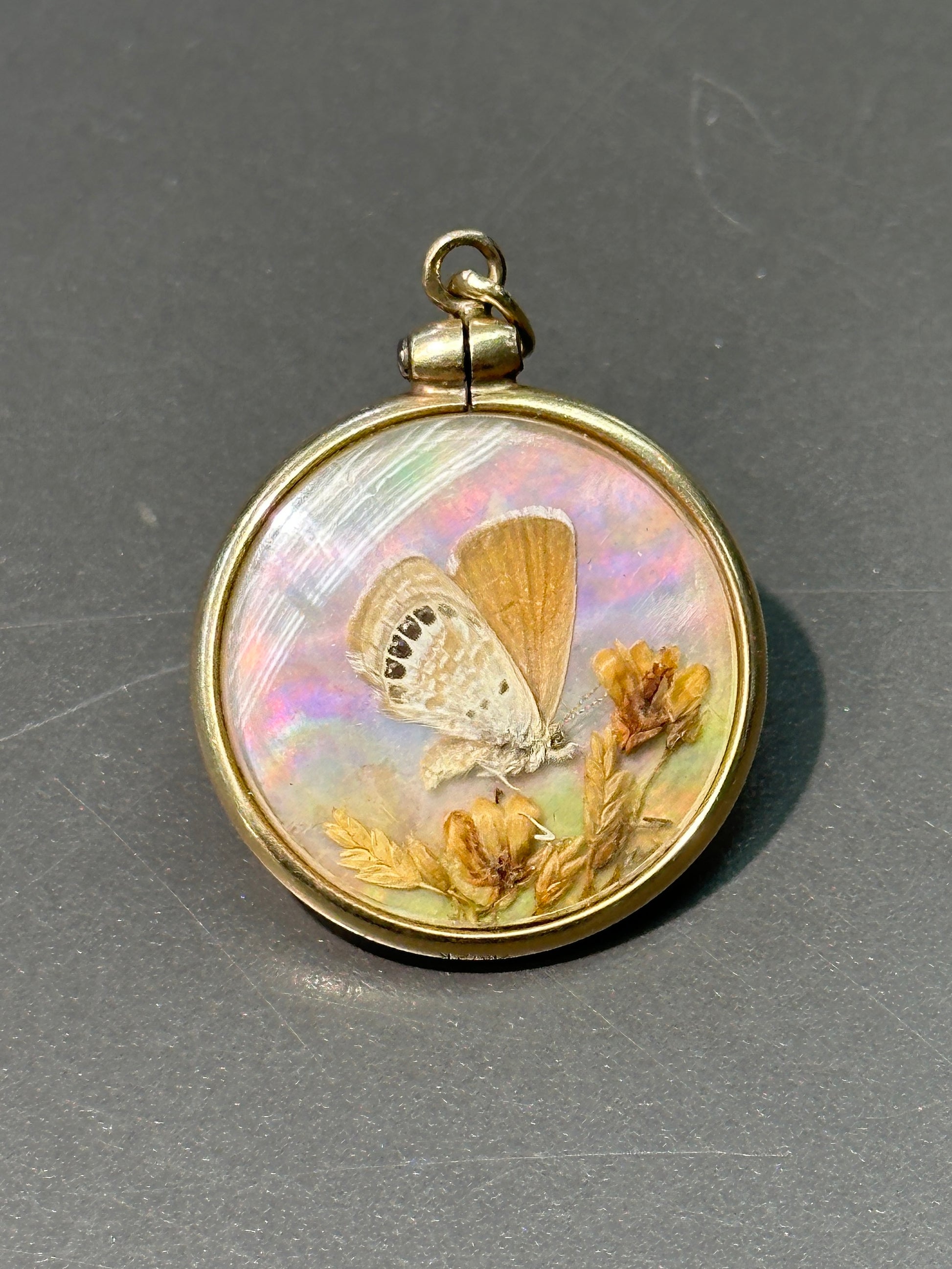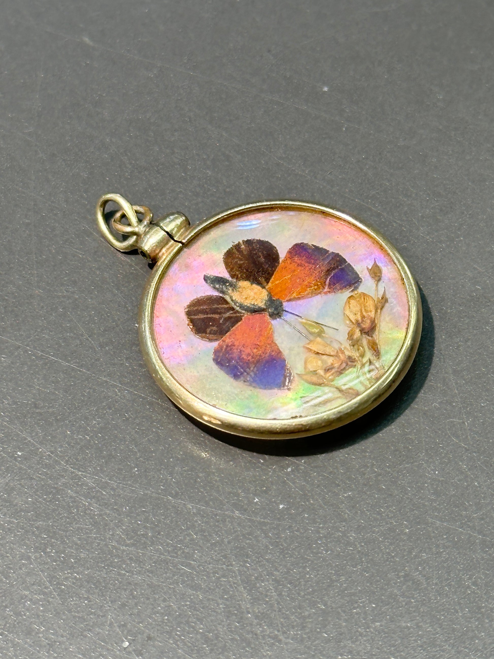 一个异想天开的维多利亚时代 14K 金吊坠,以 14K 金包裹的珍珠贝母上为特色,上面有两只可爱的蝴蝶和压花。