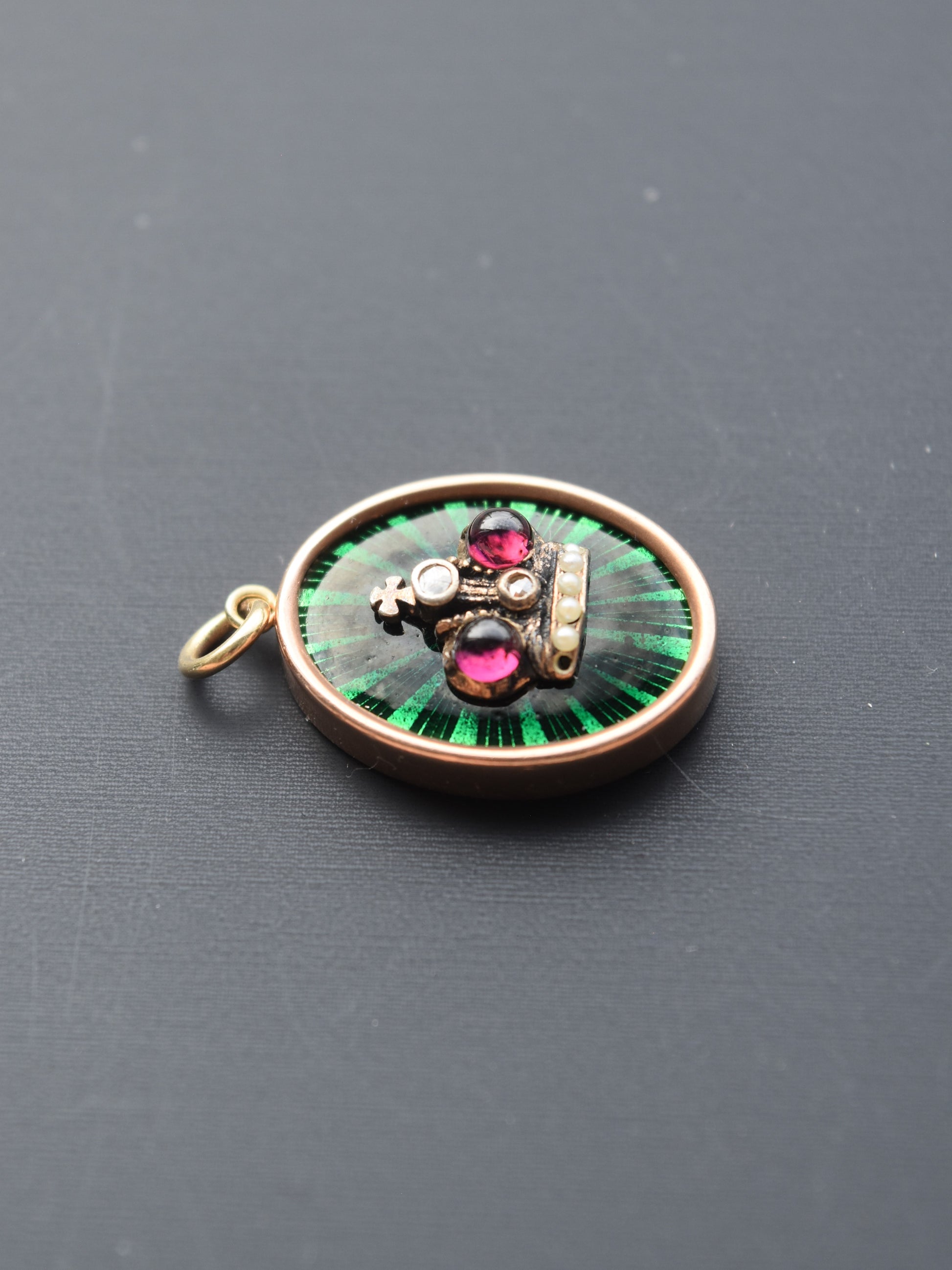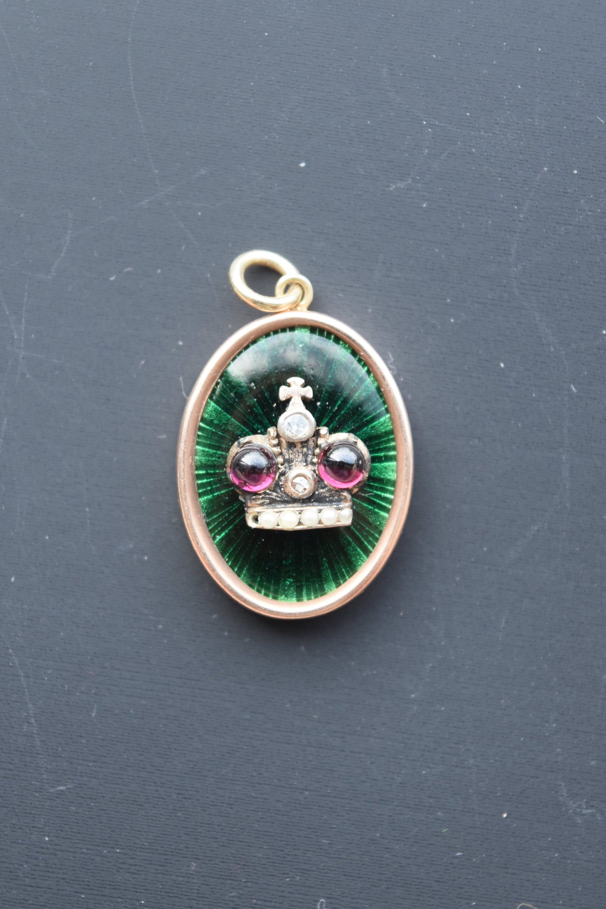 古董 14K 金珐琅珍珠碧玺钻石皇冠吊坠