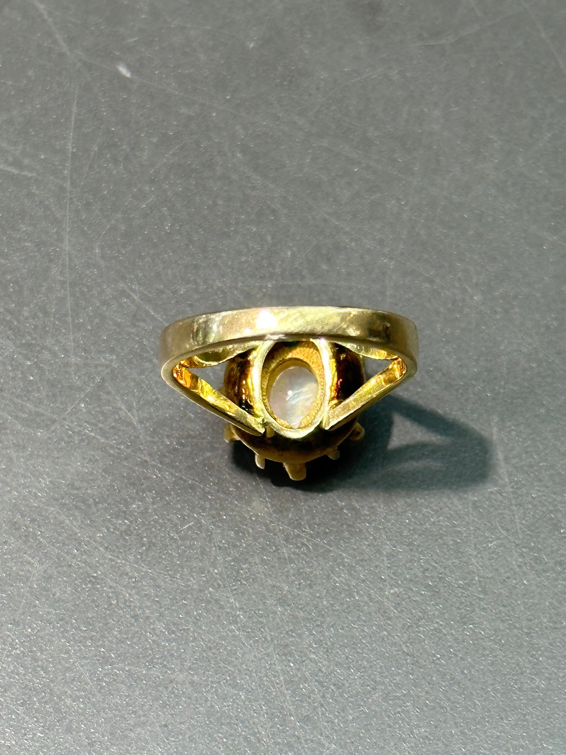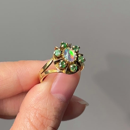 戒指中央镶嵌着一颗色彩斑斓、闪闪发光的水蛋白石,周围点缀着约 0.30 克拉未经处理的祖母绿。