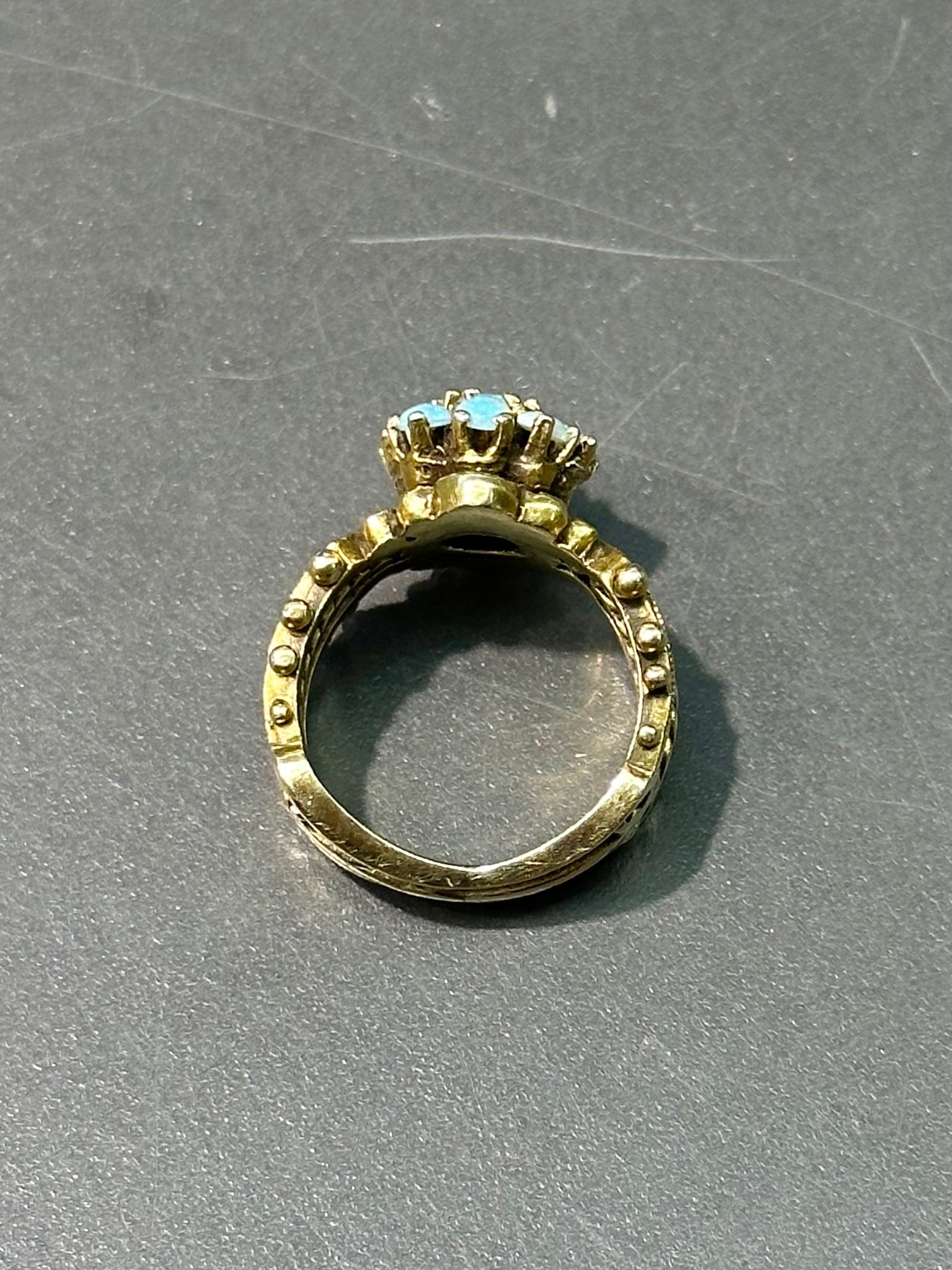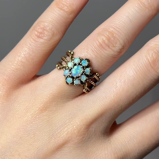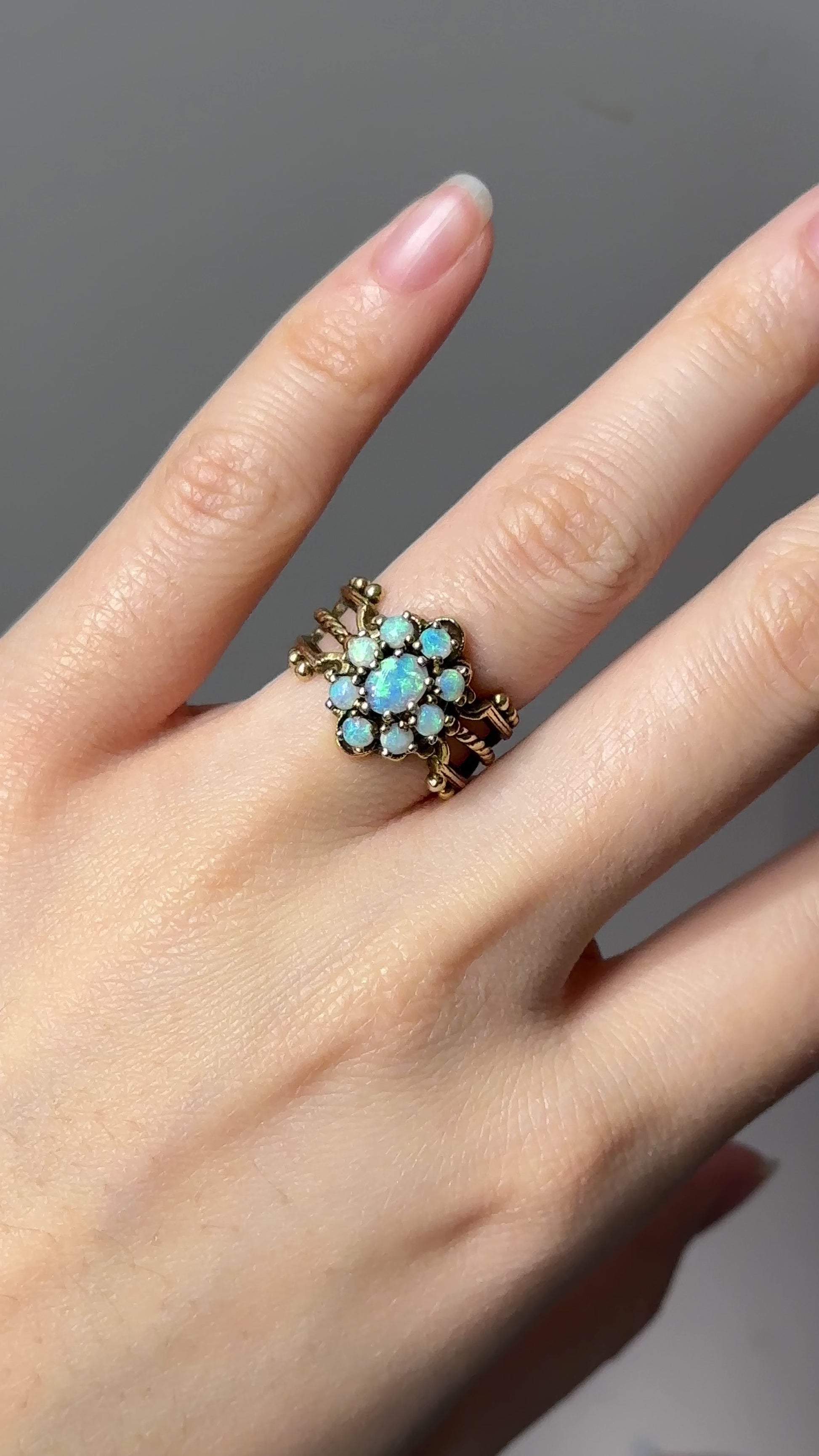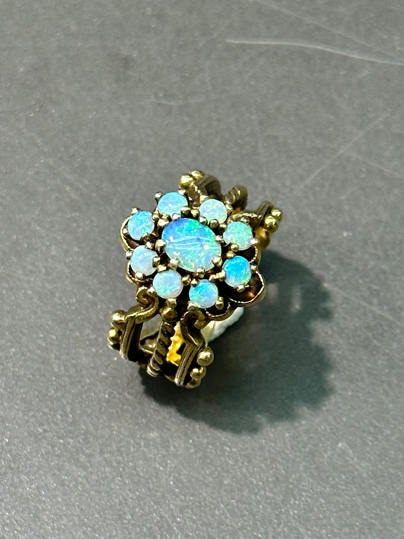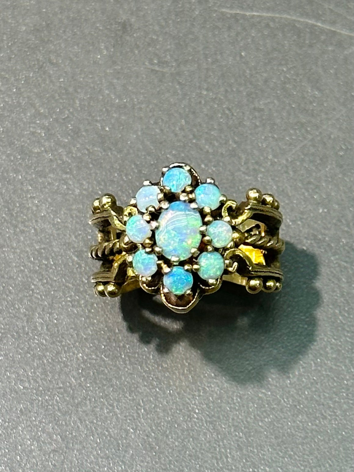 这枚精美的戒指以华丽的扭绳细节为特色,沿着戒指的肩部向下延伸,中间是一簇黑蛋白石,色彩鲜艳多彩。目前尺寸为 4.5。