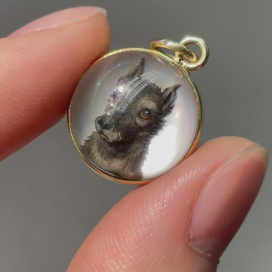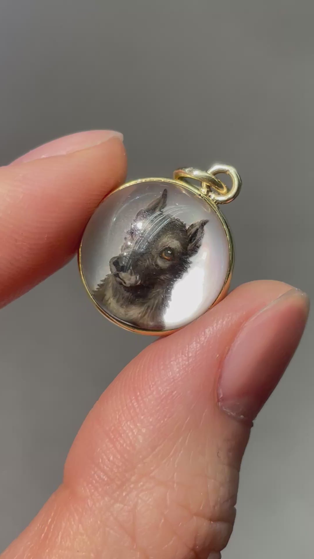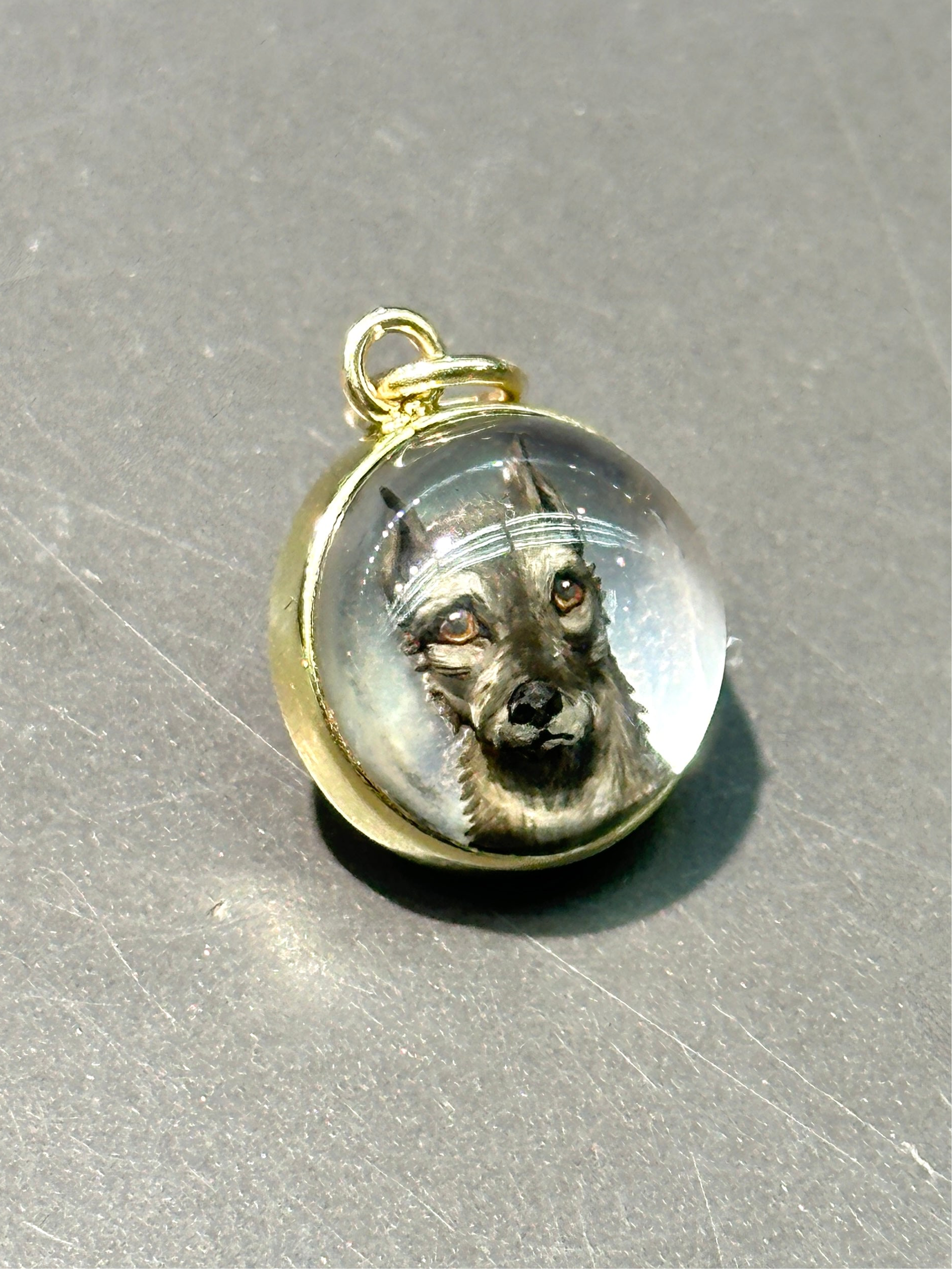 古董 14K 金反向彩绘埃塞克斯水晶德国牧羊犬吊坠