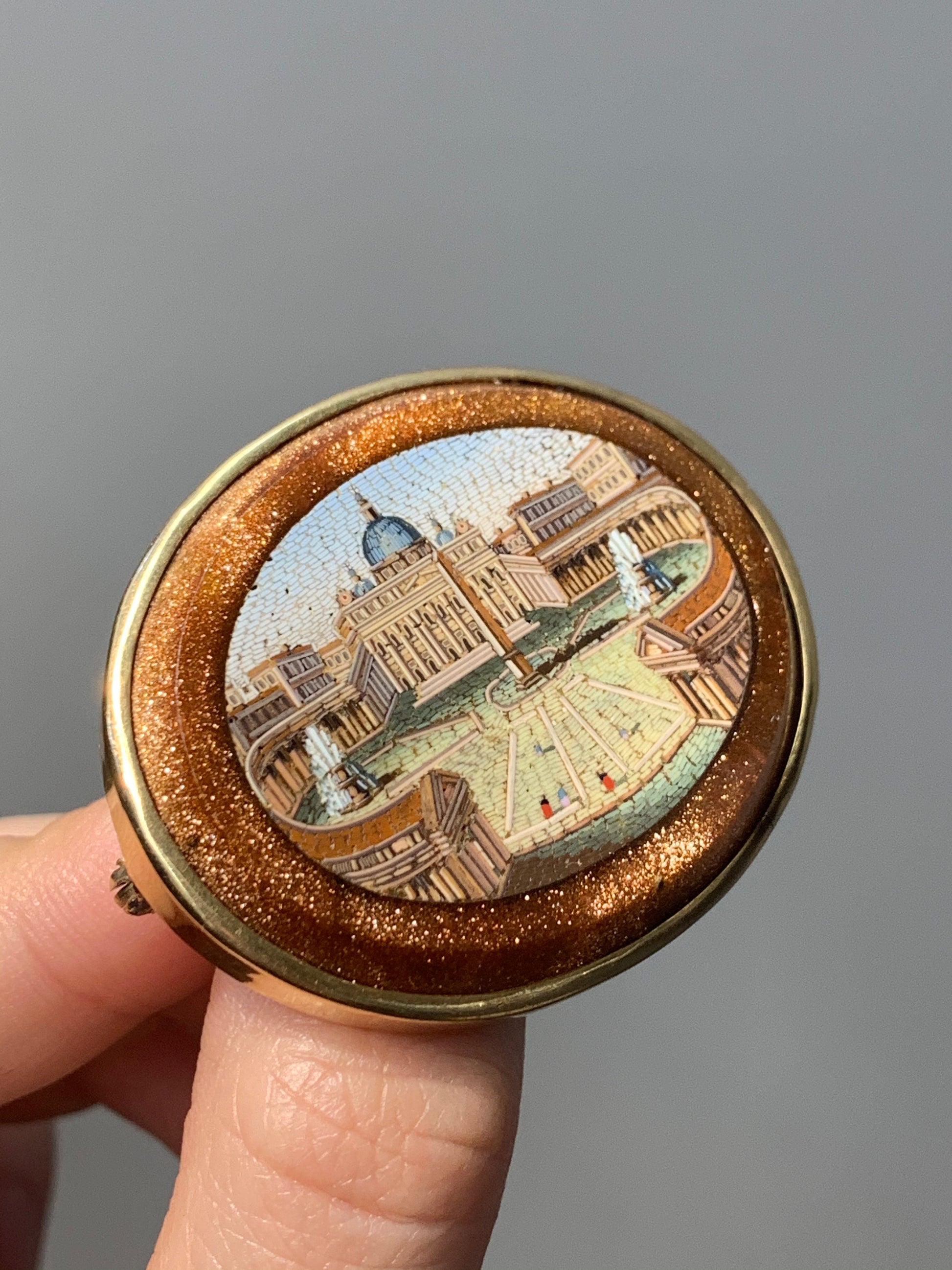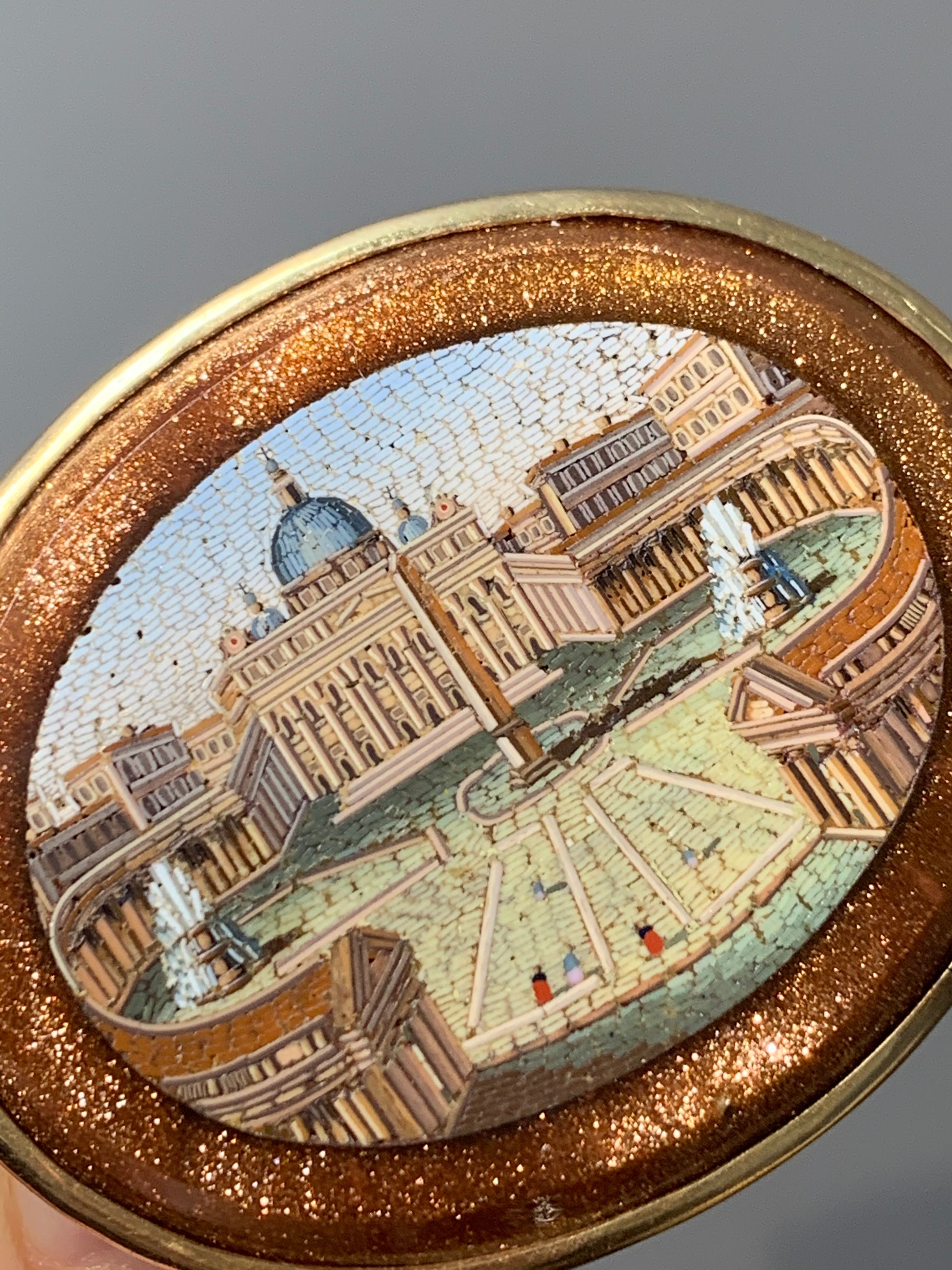 一枚完美无瑕的微型马赛克胸针,描绘了位于梵蒂冈城的圣彼得大教堂,镶嵌在闪闪发光的金石上,镶有 14K 金。令人惊叹不已的是,这些精雕细琢的镶嵌小方块描绘出了大教堂和分层喷泉的三维景观!