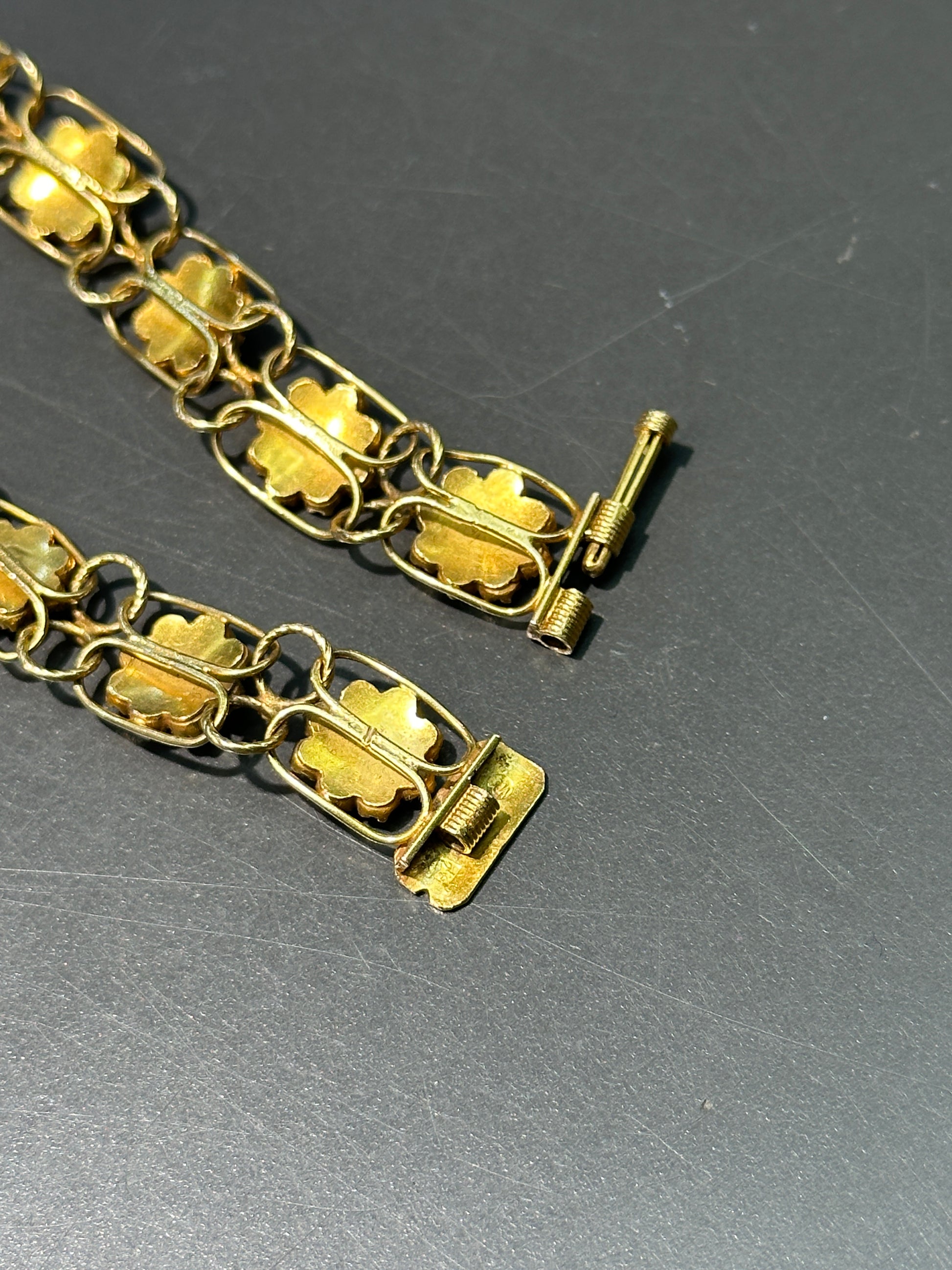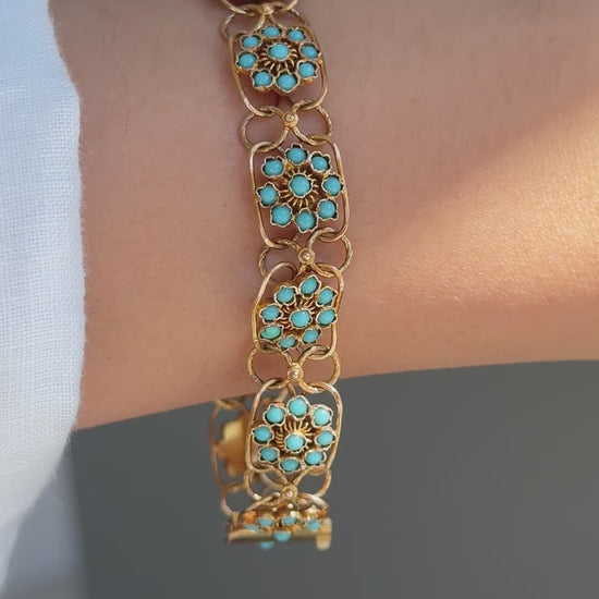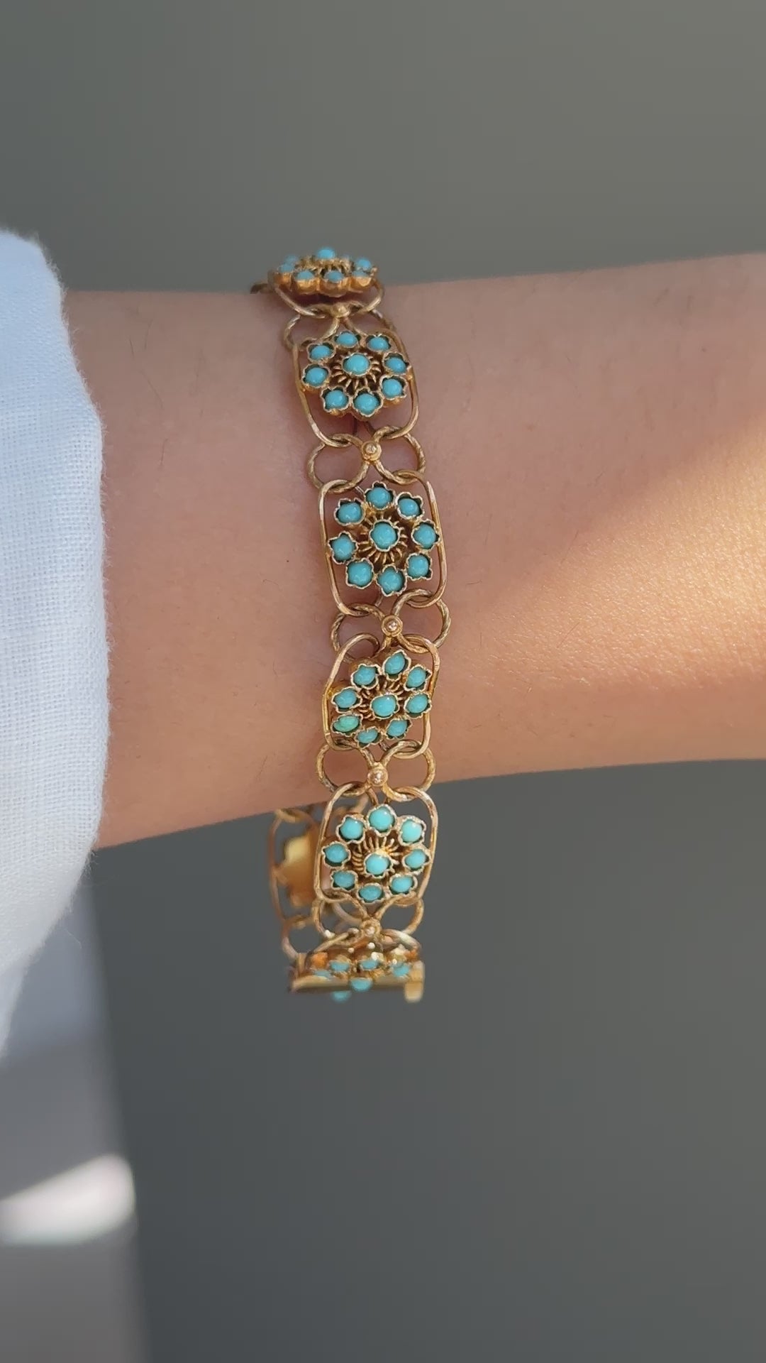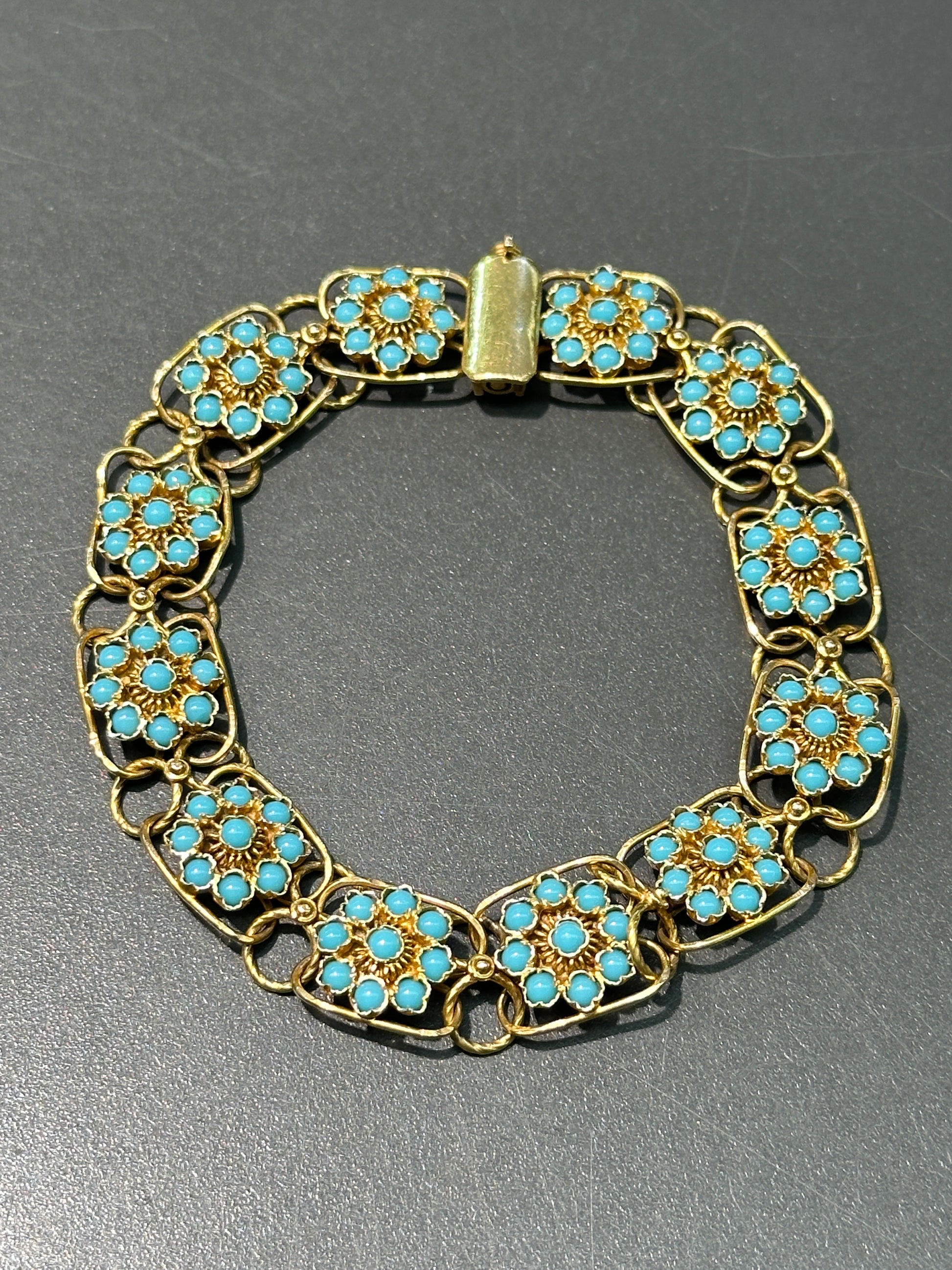一款装饰艺术风格,约 20 世纪 30 年代,18K 金线手链,镶嵌有 108 颗天然鲜艳的知更鸟蛋蓝色凸圆形绿松石,形成一簇簇花。