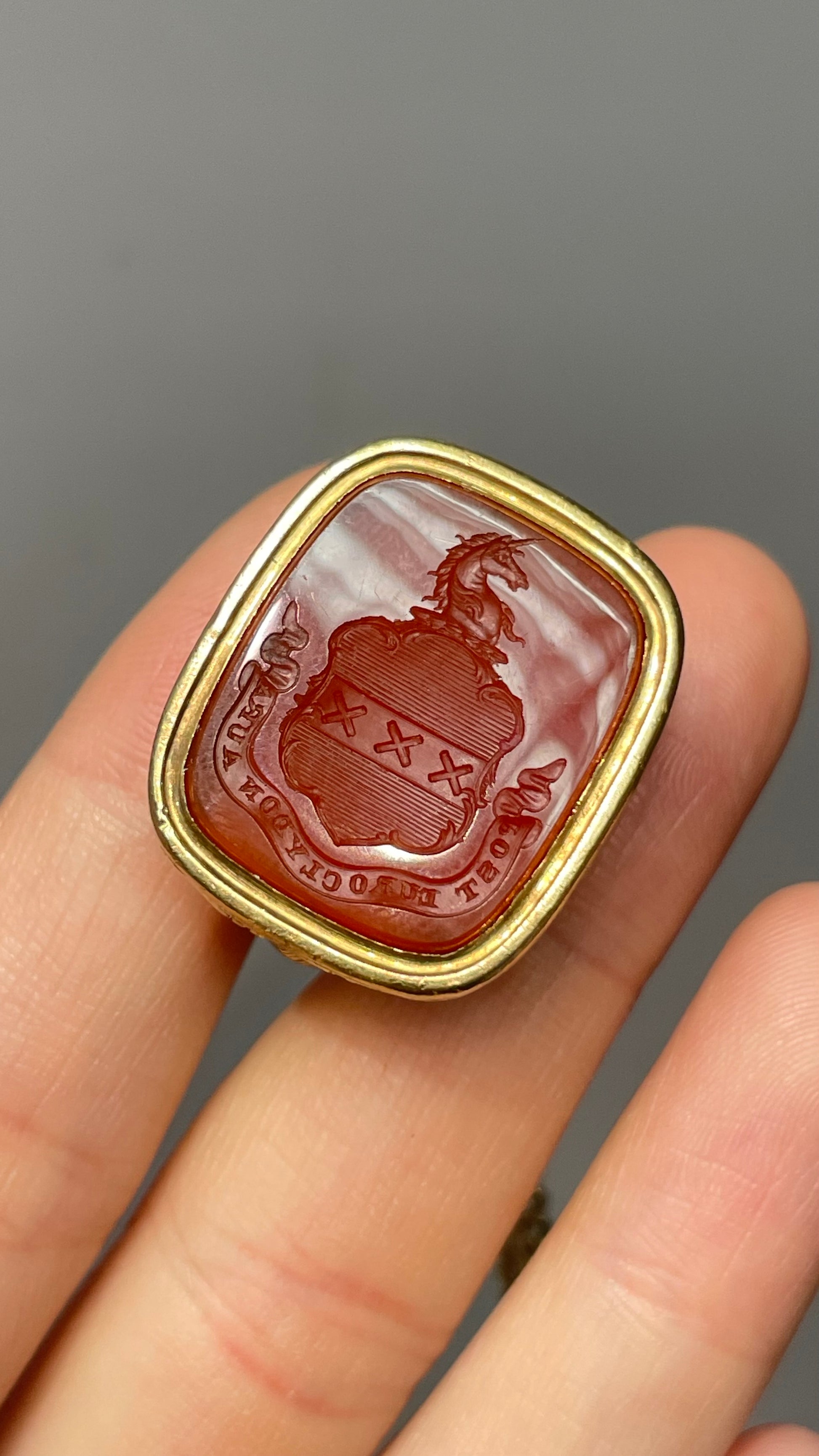 A Victorian intaglio carnelian fob pendant, artfully crafted in 14K gold and adorned with intricate scrolling floral motifs. At its center is an amber-hued carnelian seal, hand-carved with a heraldic shield and unicorn, along with the Latin motto "Post Euroclydon Aura"—translated as “After the storm, the breeze.” This phrase symbolizes resilience and calm following hardship, referencing the powerful biblical storm Euroclydon and the triumph of enduring turbulent times.