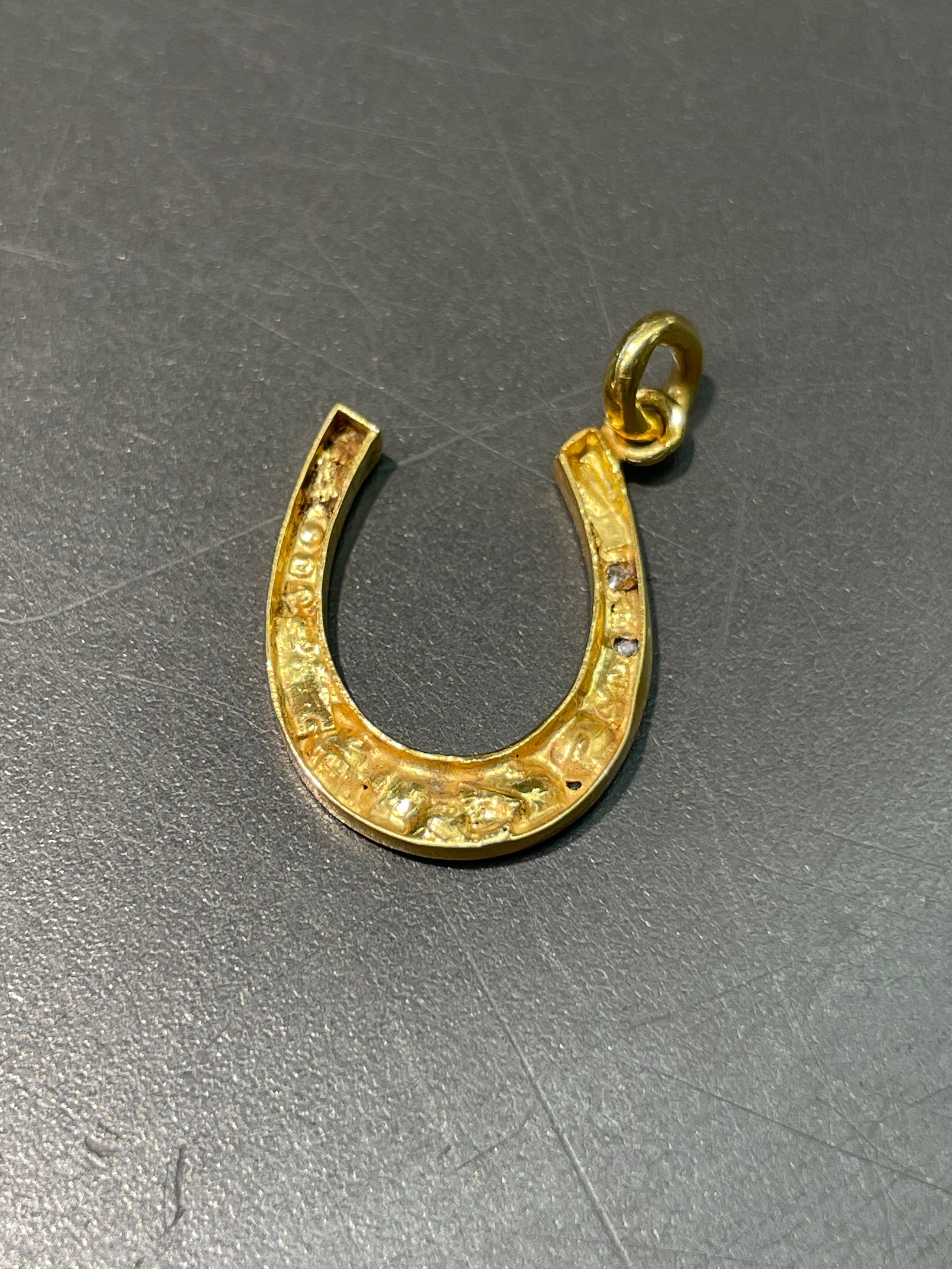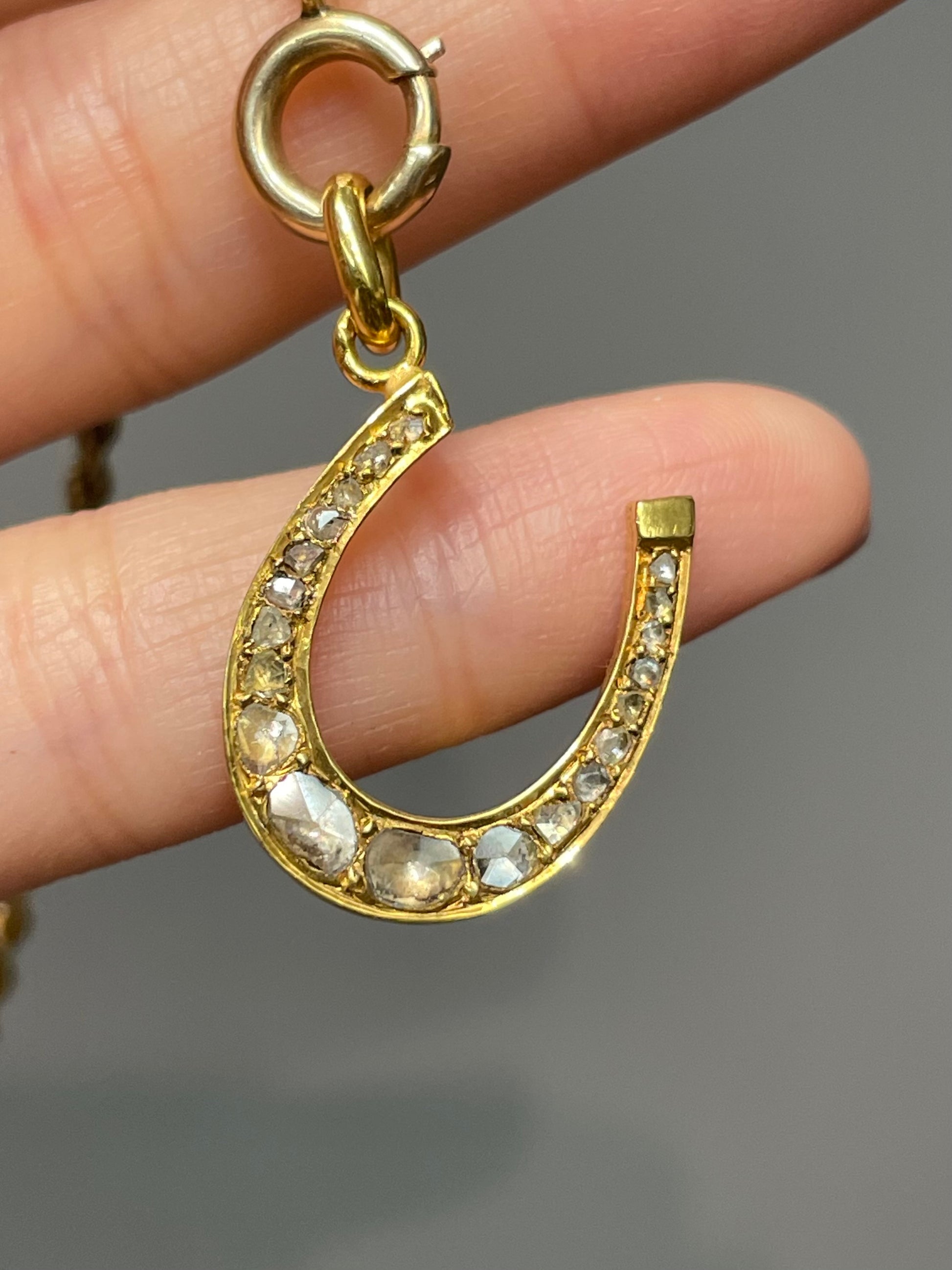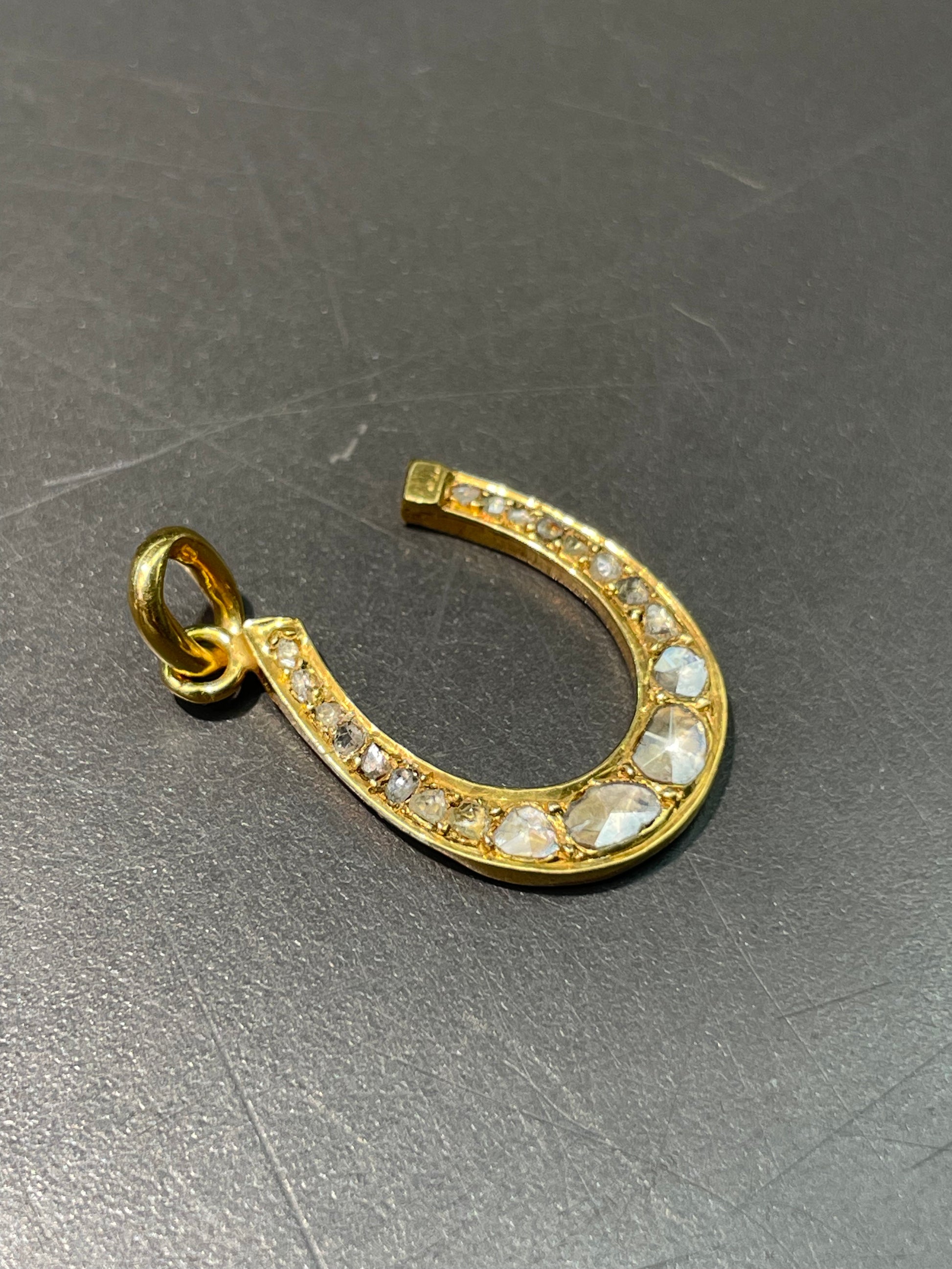 A lovely 14K gold horseshoe converted from an antique stick pin into a lucky charm. It's gradually set with twinkling foiled back rose cut diamonds.